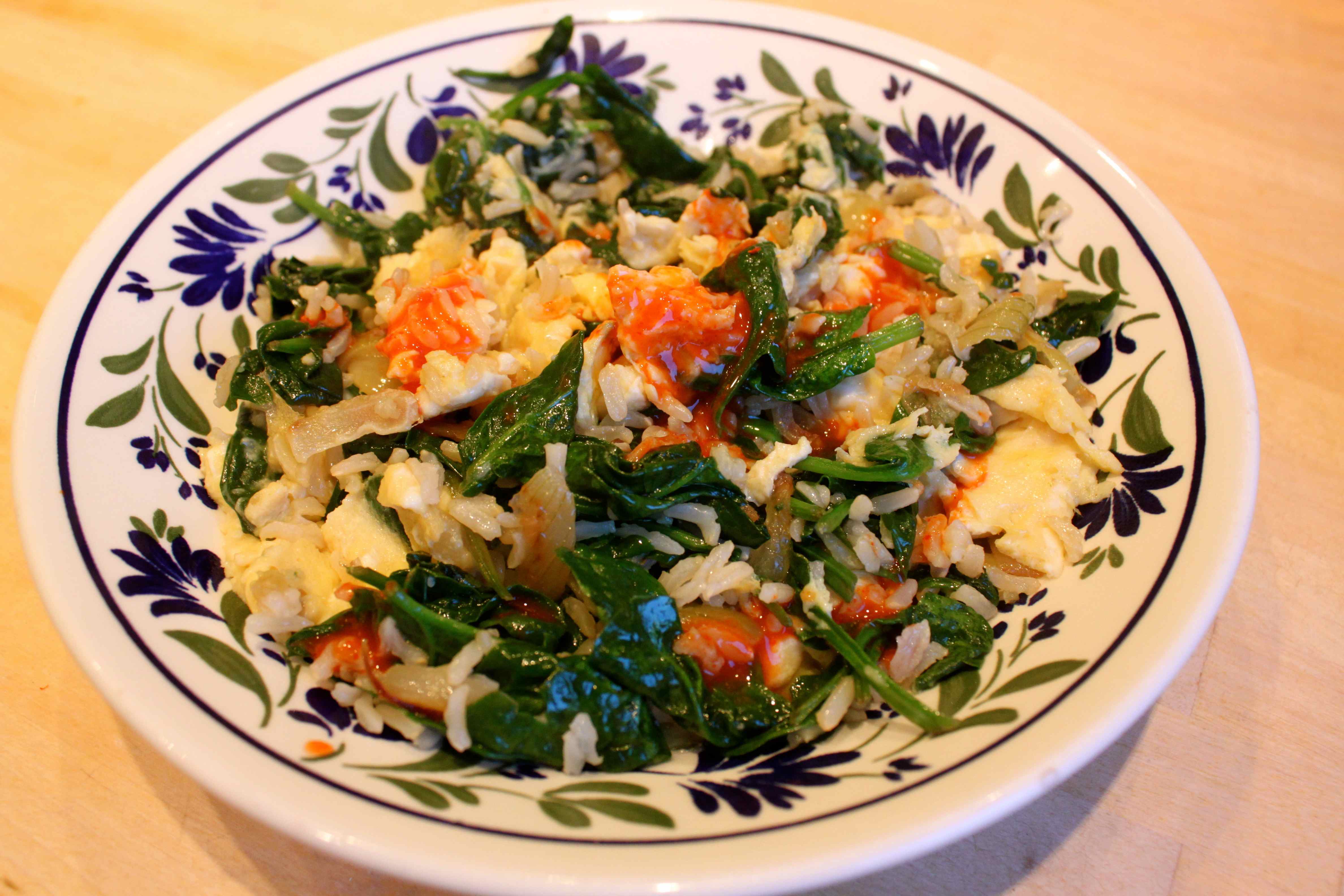 Lunch was quick and easy as I was catching up on work. Stir fried rice (60 g cooked rice) with nearly 3 eggs, onions, garlic, lots of spinach and Cholula hot sauce. Cholula hot sauce has negligible calories in 1 tsp i.e. zero which is good news 🙂