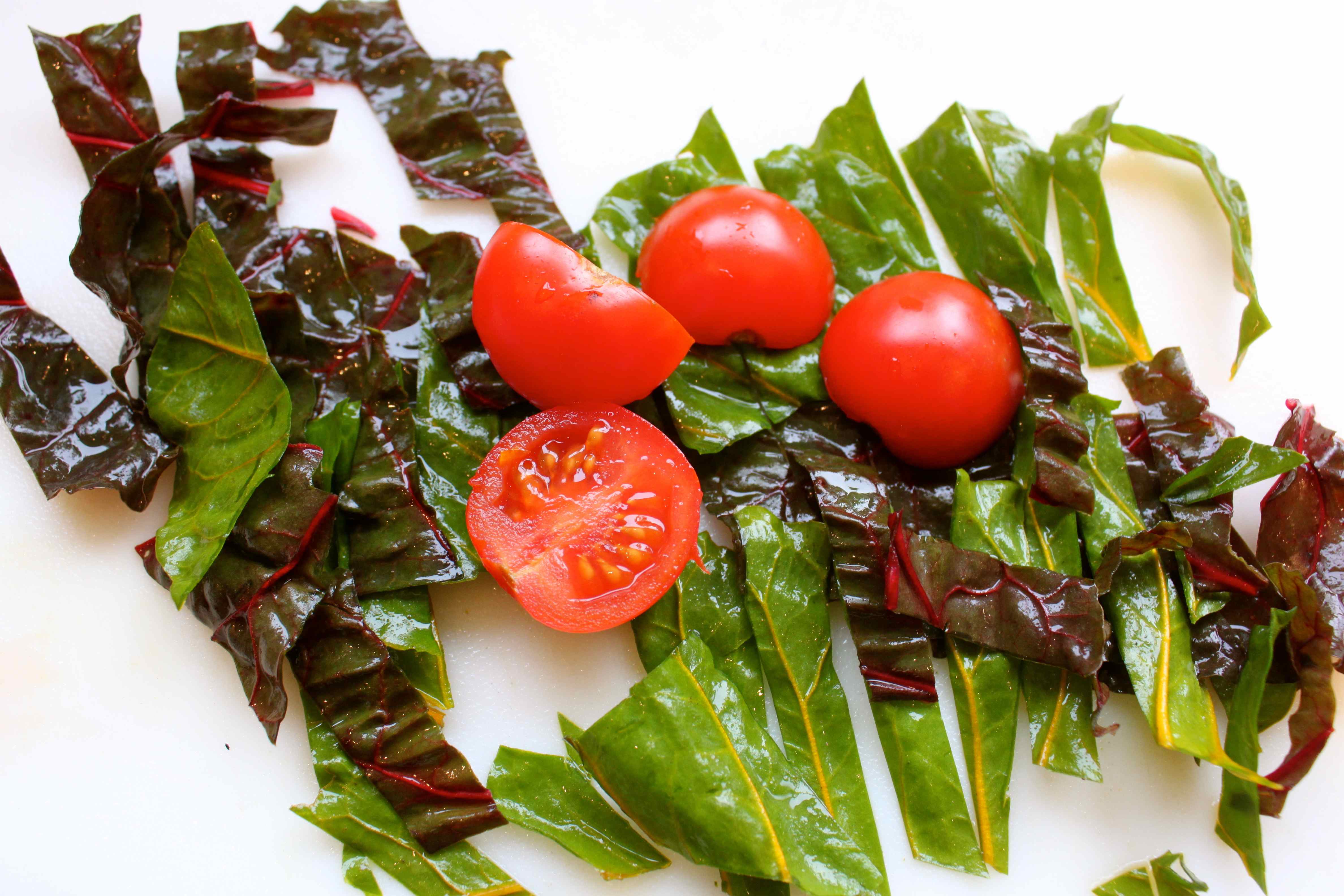 I fried a red onion with the chard stalks in coconut oil and then added the chard leaves and chopped cherry tomatoes.