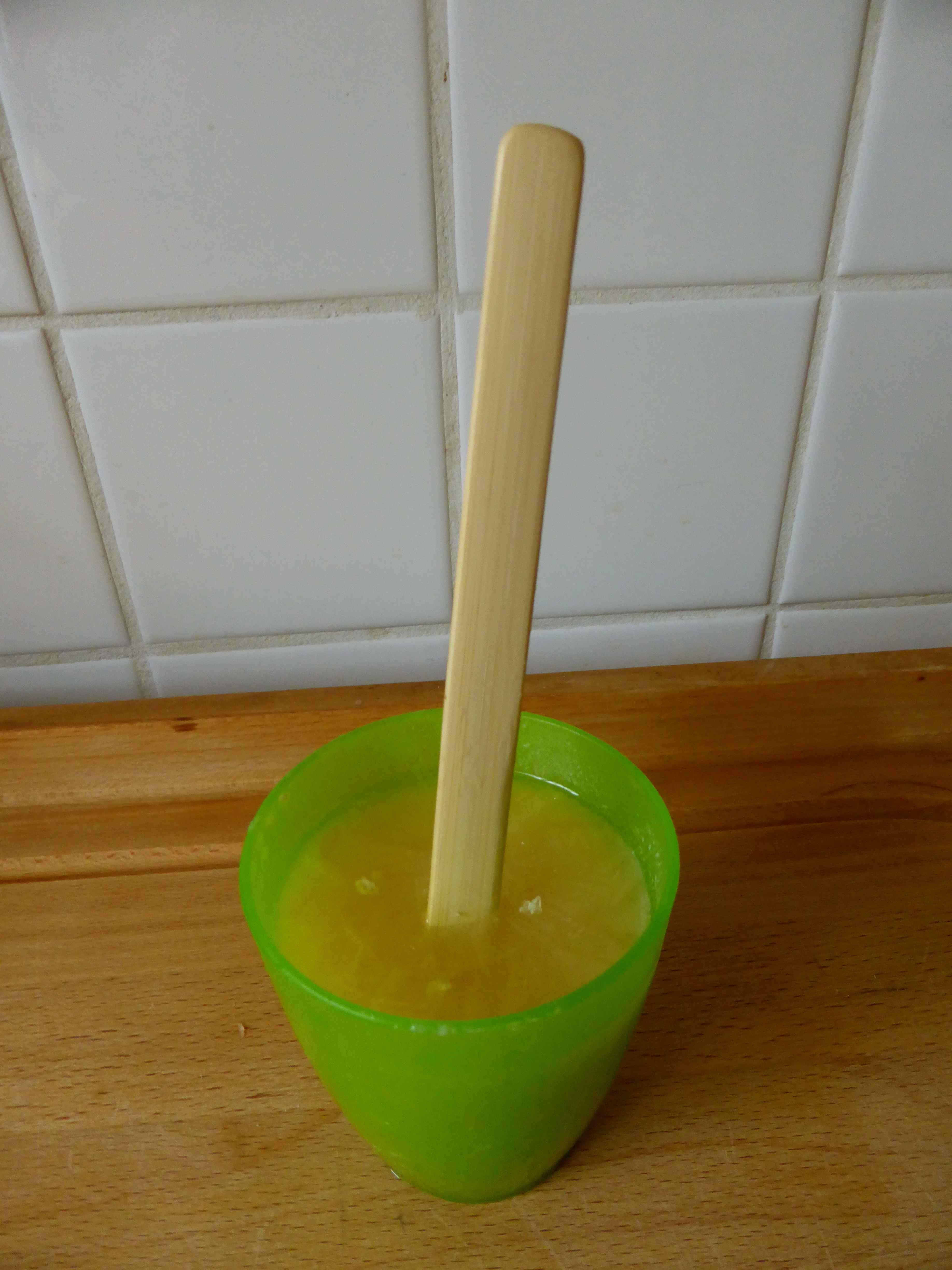I was very impressed to see Harvey making his own ice lollies. He whizzed up 2 oranges with some almond milk and froze them overnight using a plastic cup and the broken handle from a bamboo ladle. He is doing well with no sugar in the house but obviously yesterday he was missing sorbets so he made his own. I was impressed and he was happy with his “orange ice-cream”.