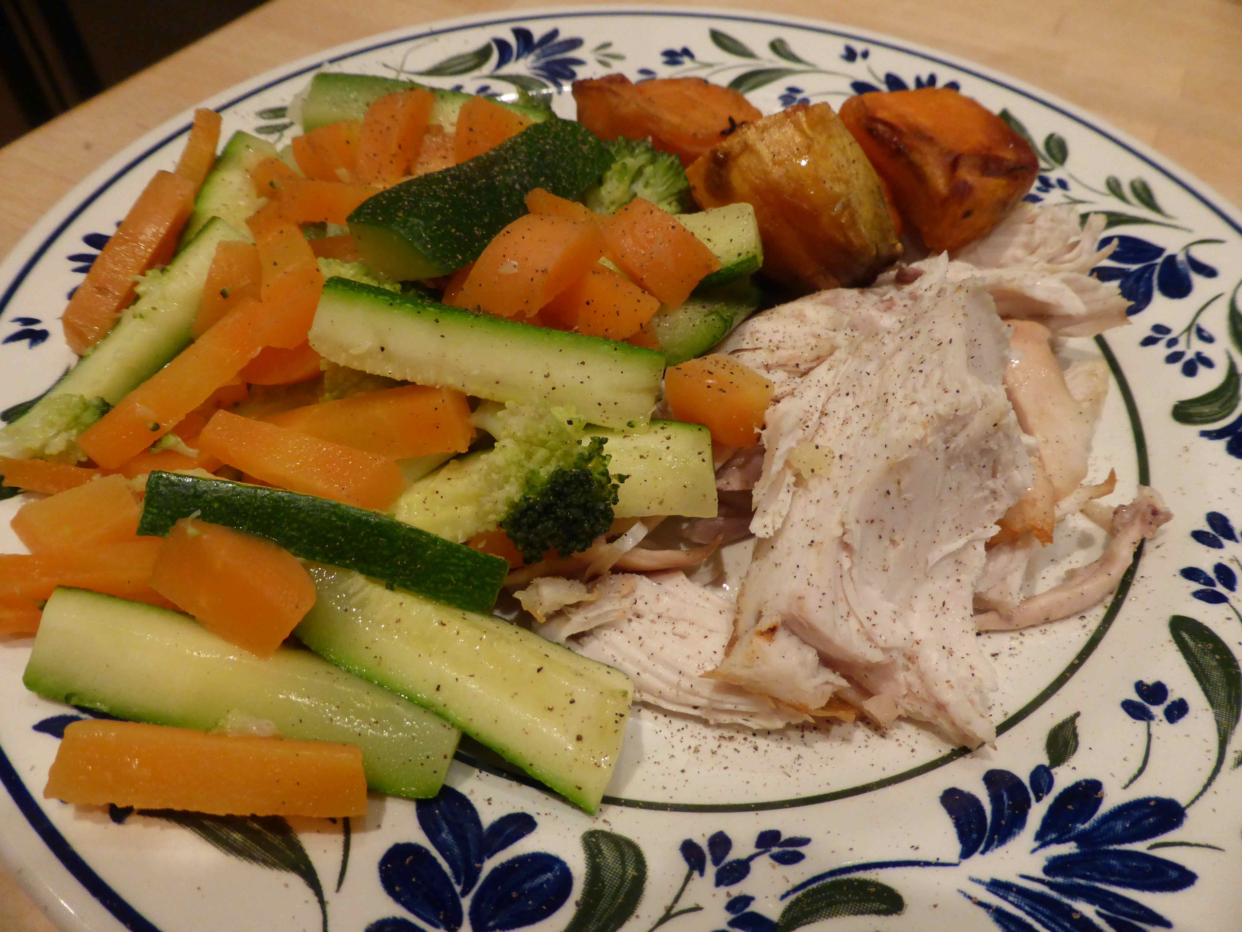 Having endured a dull, dull, dull, afternoon dealing with tax (aaaaagh !!!!!) it was comforting to know a decent roast was in the oven. I had 100g roast chicken, breast meat only, no skin, half a large roast sweet potato and a huge pile of steamed courgette, carrots and broccoli. Having taken the photo I calculated my calories and was pleased to see I had enough for a small portion of gravy.