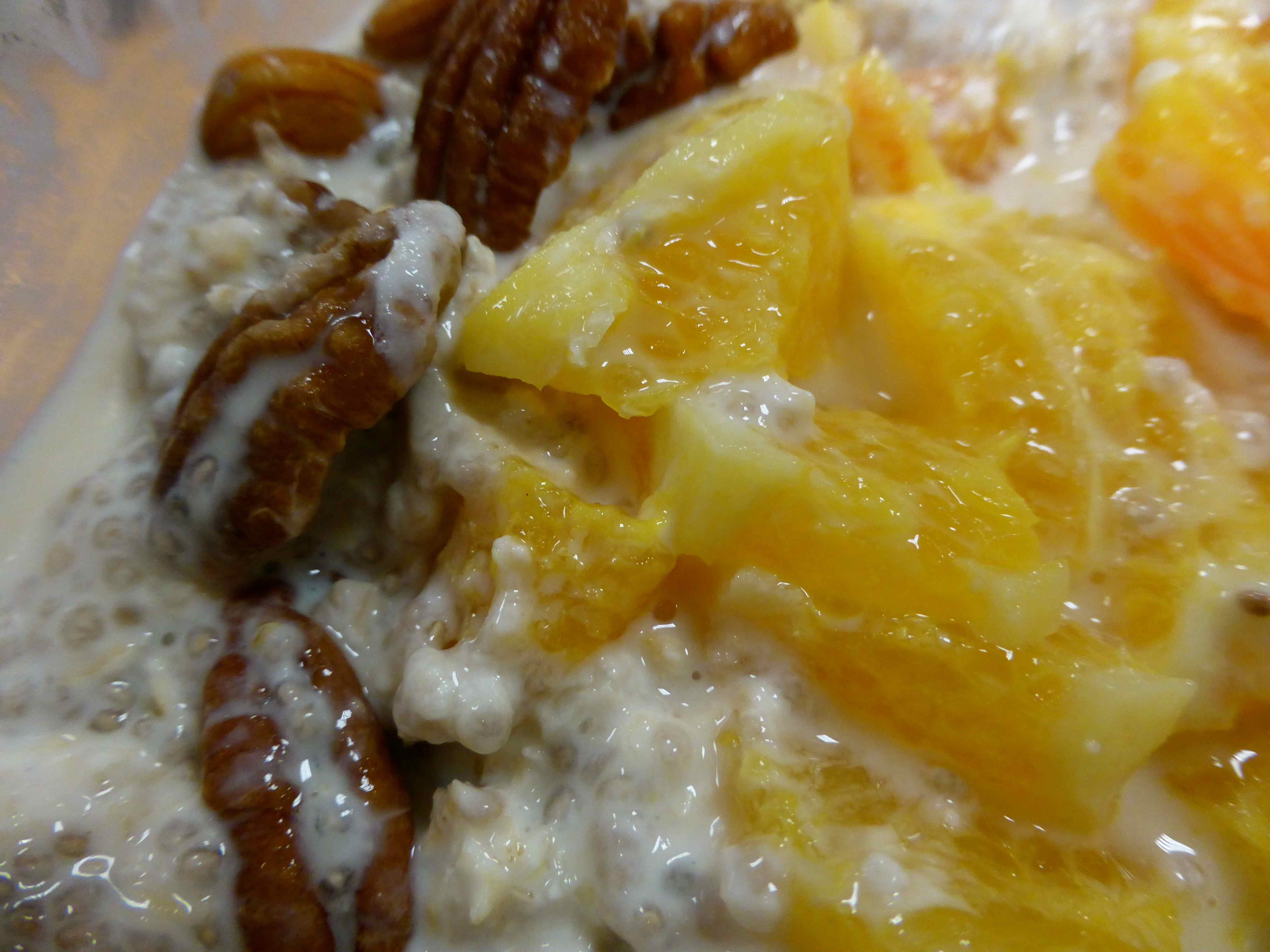 538 caloriesovernight oats with oranges and pecan nuts I was very organised on Sunday evening as not only did I make breakfast the night before but I also made lunch.  It was very satisfying to go to bed and know I had healthy meals prepared and some good leftovers in the fridge to make mid week suppers quicker and therefore easier.