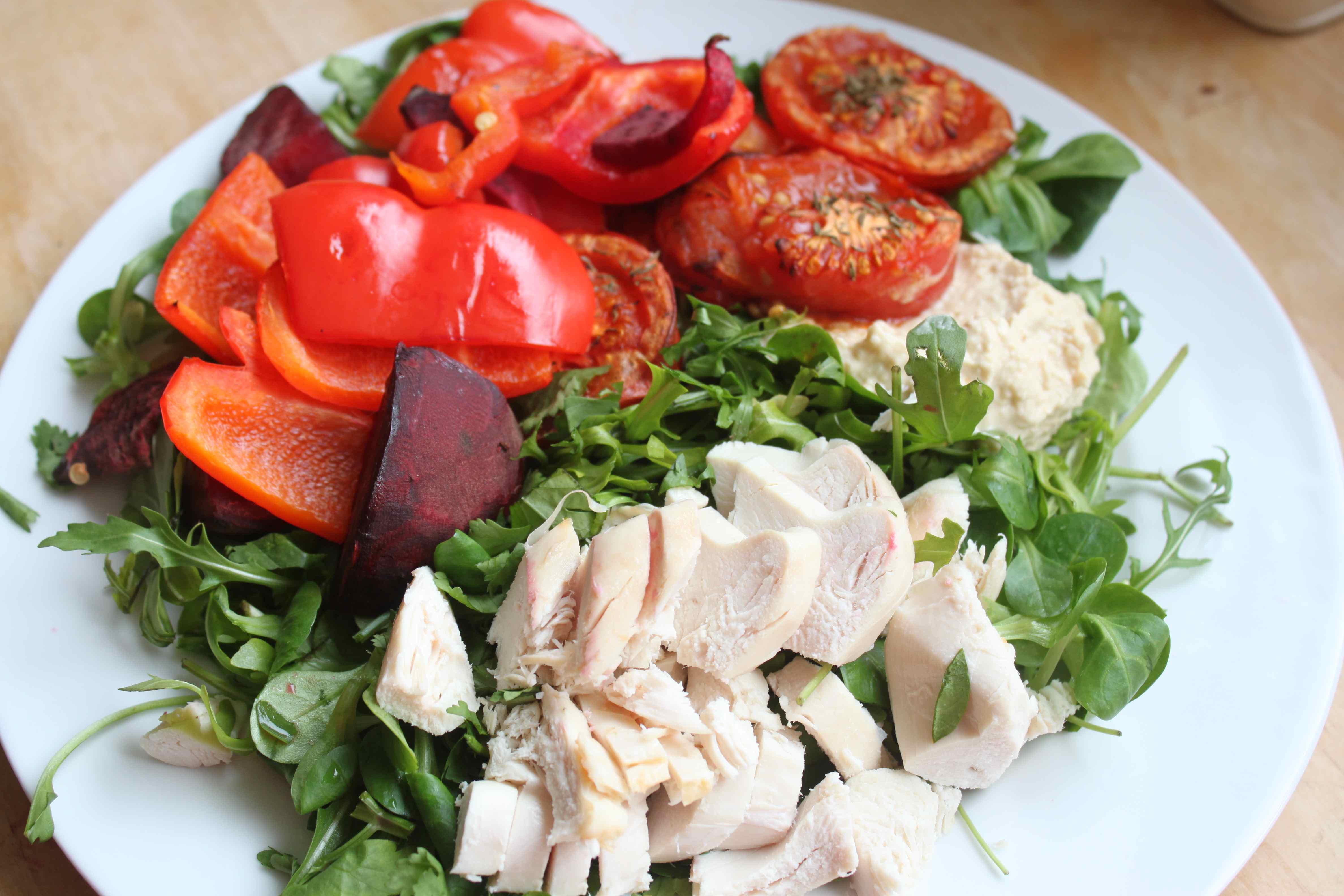 roasted reds I prepared a large pile of rocket and lamb’s lettuce and added 100g roast chicken and 50g humous.green leaves, chicken and humousThis was colourful and flavourful.
