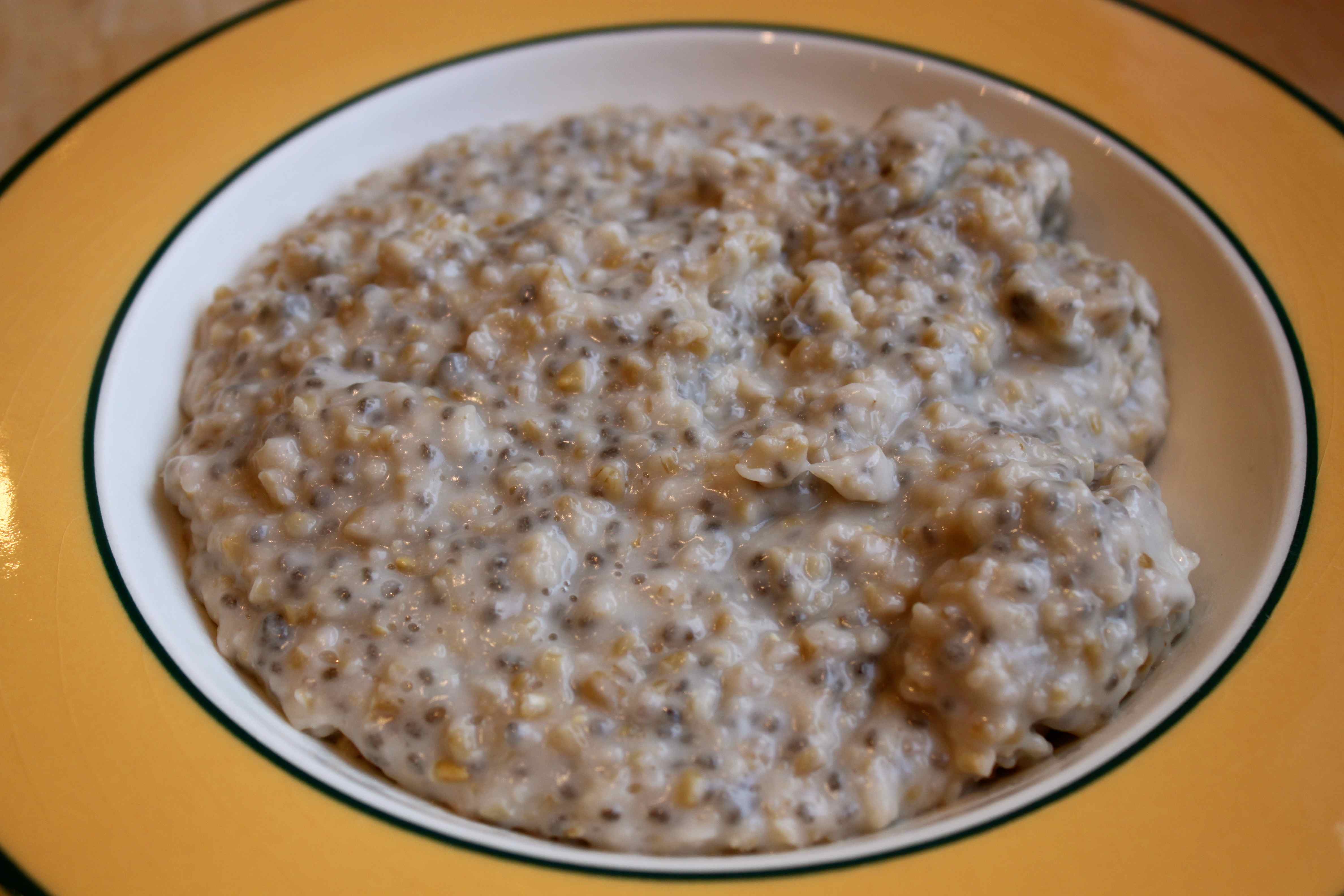 It asked for 1/4 cup each of pinhead and rolled oats.  They are very different to each other to look at and in cooking times.   I used almond milk instead of dairy milk and made it with my pink silicon spatula rather than a traditional spurtle!   I also added chia seeds for extra protein and satiety.2 oats I followed the cooking method in the recipe and it was a good consistency and tasted ok but not quite exciting enough.porridge and chia An apple would make the difference.oats with red apple Perfect.  A lovely bowl of apple porridge made by just grating the apple and stirring it in.