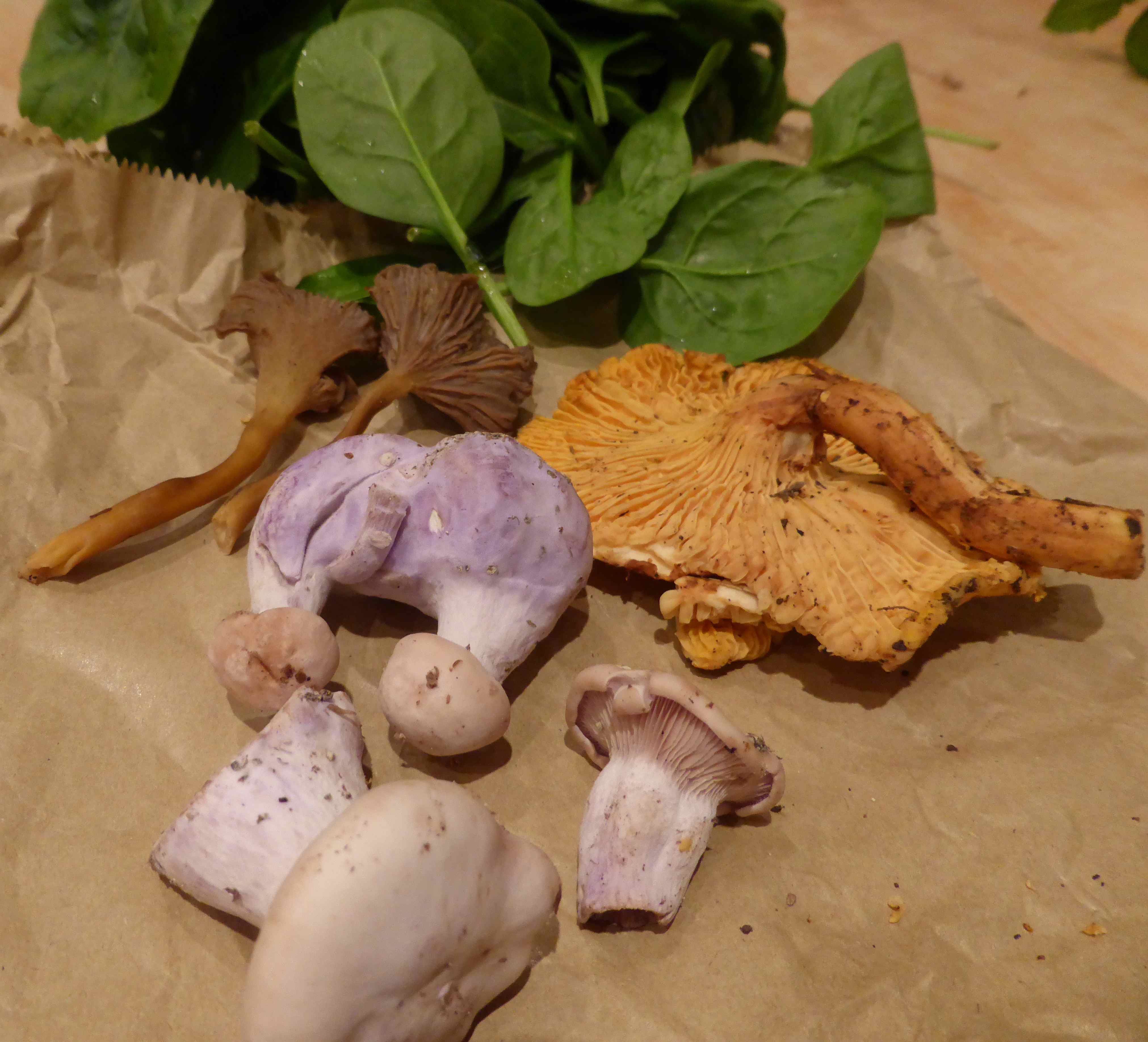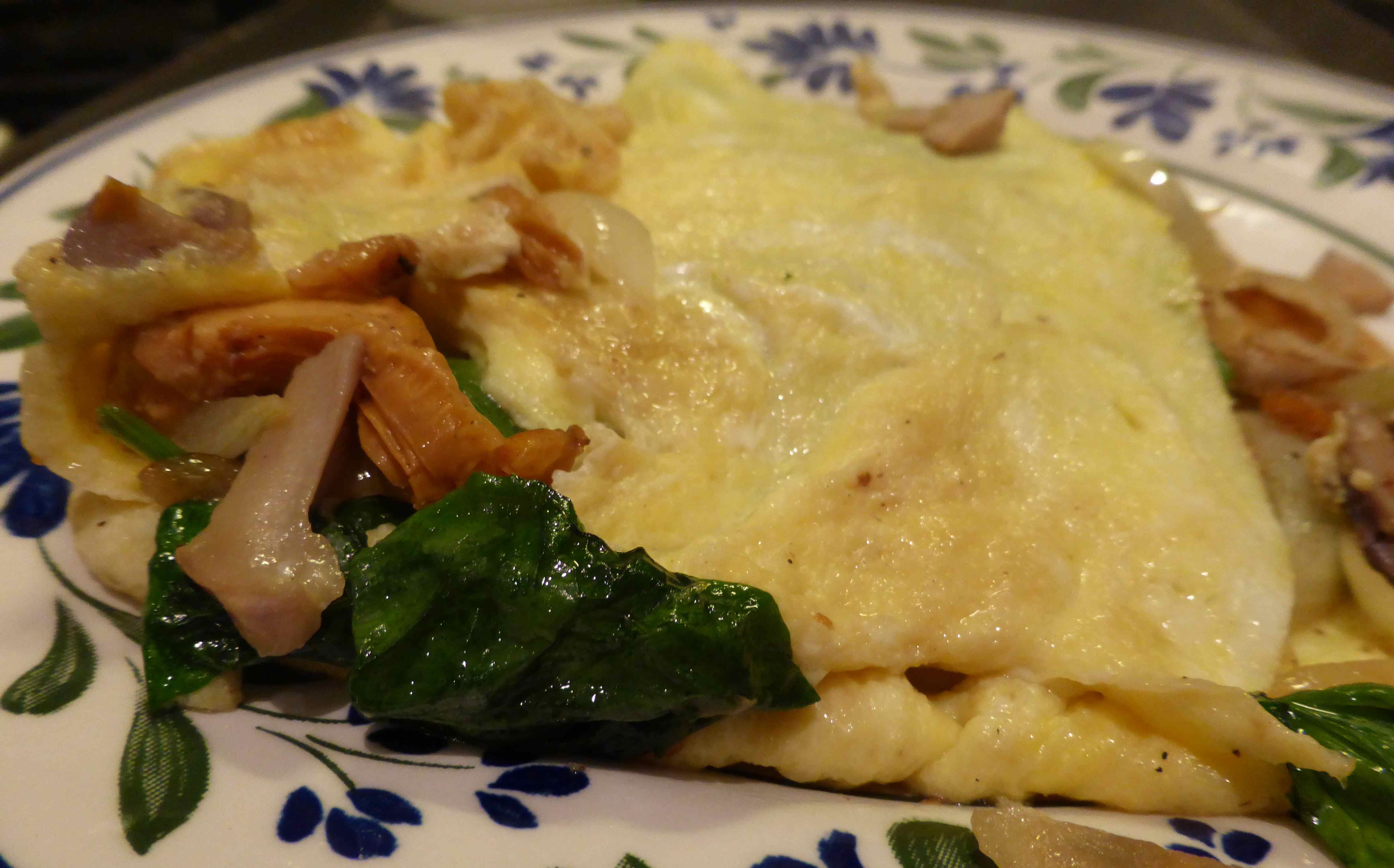 At home I tackled those lovely mushrooms. I cooked them with some chopped onions and spinach and made an omelette.