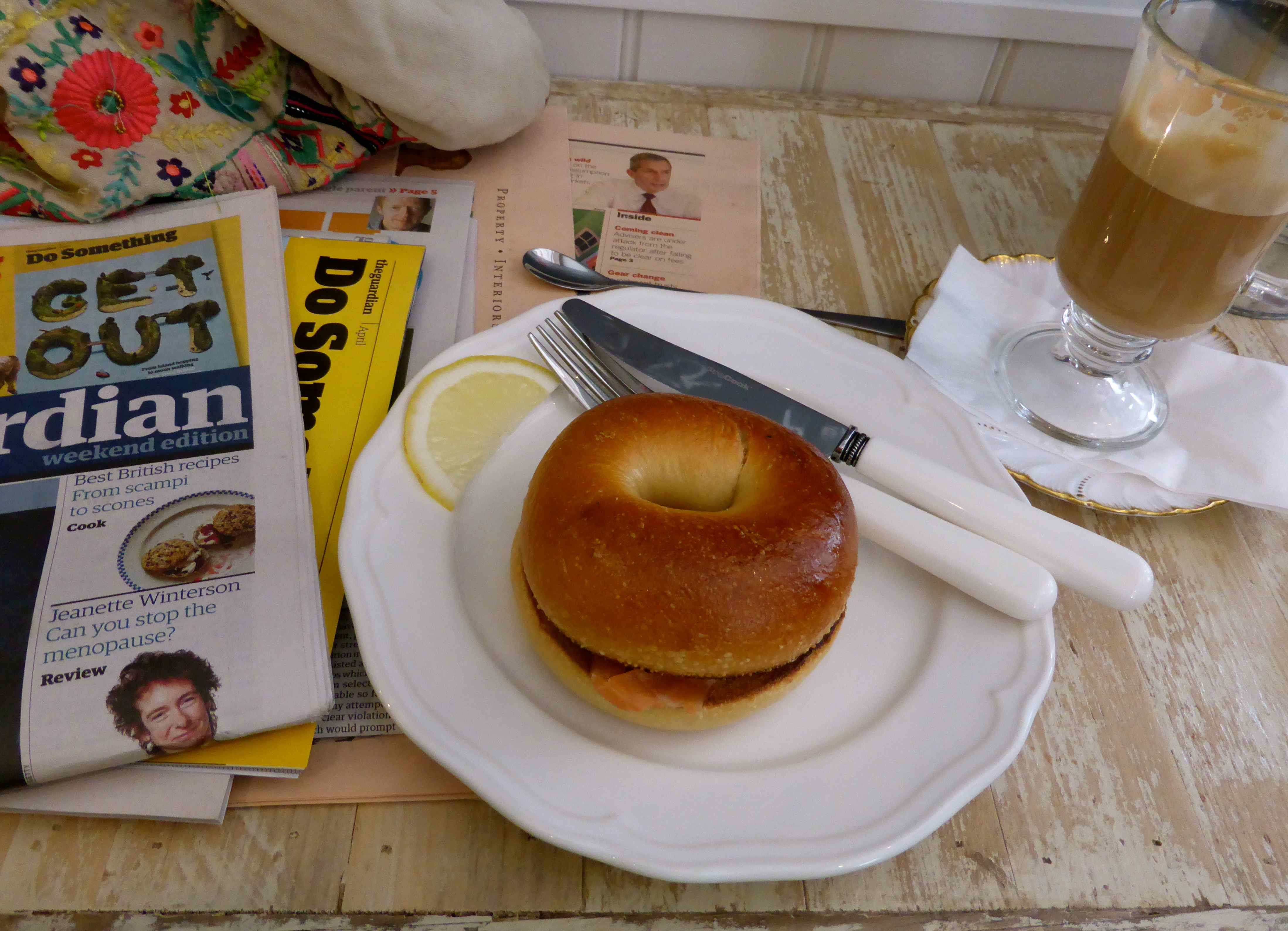 They made hot chocolate with soya milk – hurrah.  I like the space and light in here, the decor and the furnishings.  It may be a bit pink for some but I liked it.  I do have a bit of a thing about coffee in a glass cup – I just don’t like it so next time I go in I will see if they have a mug instead.  Monmouth has rather spoilt coffee for me in most other places so this coffee was slightly below par but I am probably being fussy.Harvey in Cocolicious We both had a smoked salmon bagel and they were extremely helpful with making sure Harvey’s had no dairy in it which was appreciated.  Mine came with dill in the cream cheese which I liked very much.salmon bagel I liked Cocolicious and will go back.Cocolicious flowerAt lunch time I took Lara out and we went to the Milk House with Lucy and Michelle.  Lovely bread roll and excellent butter.
