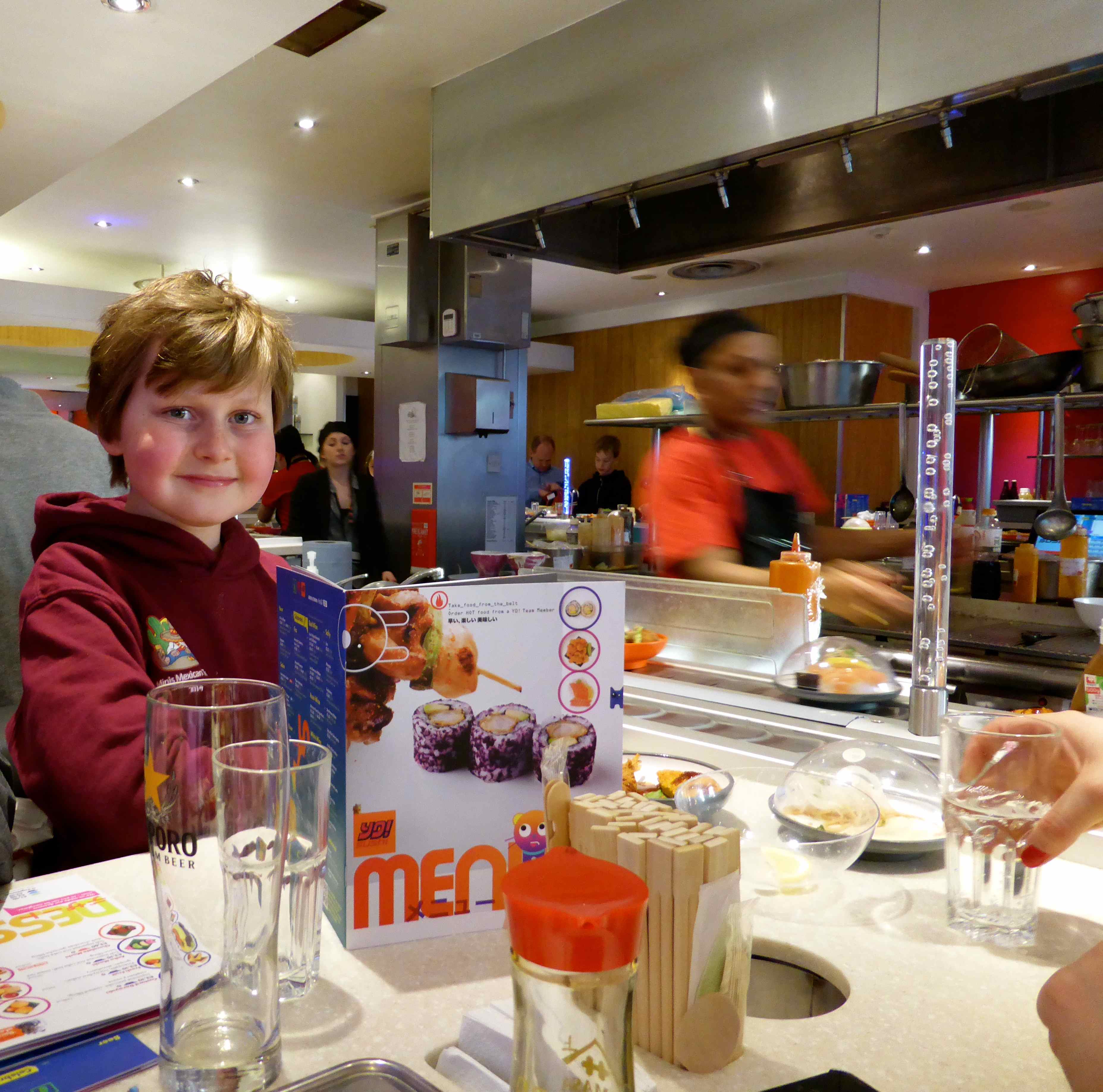 Dinner did not go according to plan. We had theatre tickets so time was restricted for supper. Everywhere we tried was full and we didn’t have time to wait. Eventually we came across Yo Sushi which Harvey has wanted to go to for ages – ever since he saw the episode of ‘Miranda’ when her tie got stuck in the conveyer belt and carried her round the restaurant on it.