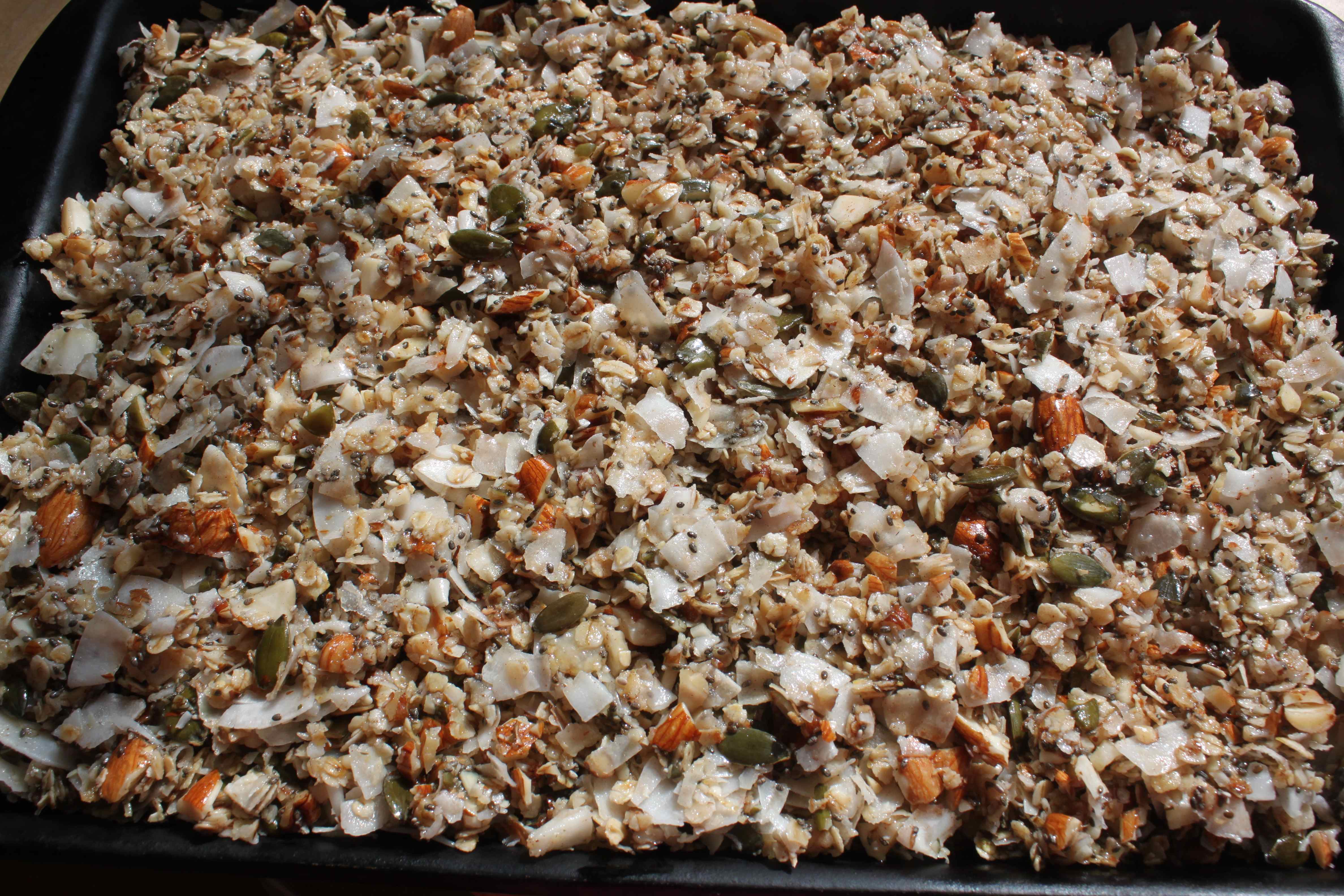 Tip the mixture in to the baking tray and bake for 15-20 minutes, depending on how crispy you like it – the darker it is the crispier