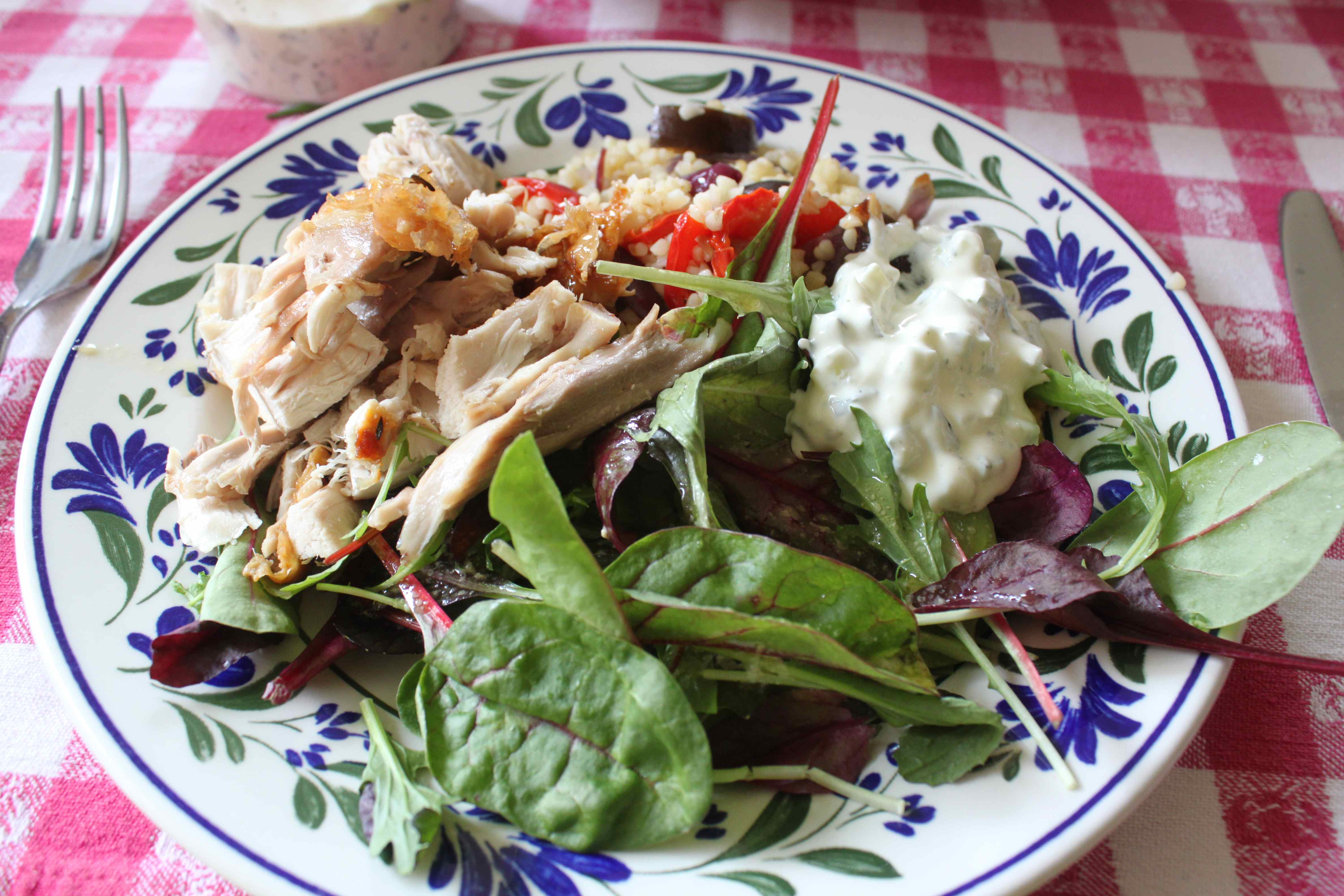 I really enjoyed my lunch. I had bulgar wheat with roasted veggies, roast chicken, green salad, tzatziki and humous.