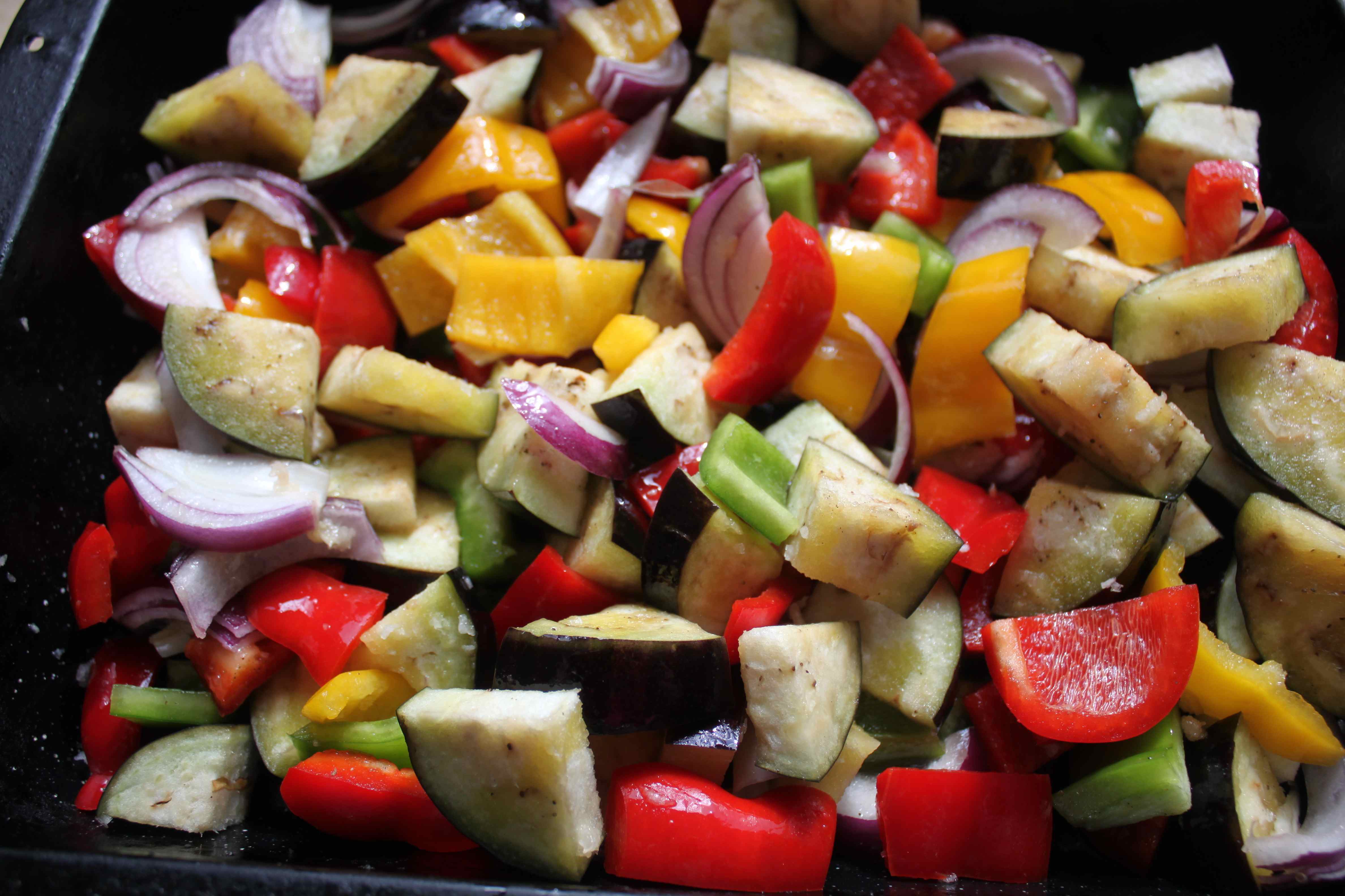 I roasted a huge tray full of veggies (red onion, red, green and yellow pepper and aubergine) which I chopped up and added salt and olive oil to, before placing in the oven for about 30 – 40 minutes. I added this lot to some Bulgur wheat which is a quick and easy dish to prepare and is as good at room temperature as it is warm from the oven. Roasted veggies with Bulgar wheat (or couscous or quinoa) is good with Feta cheese, olives and sun-dried tomatoes added but we had so many other bits to eat I kept it quite simple today.