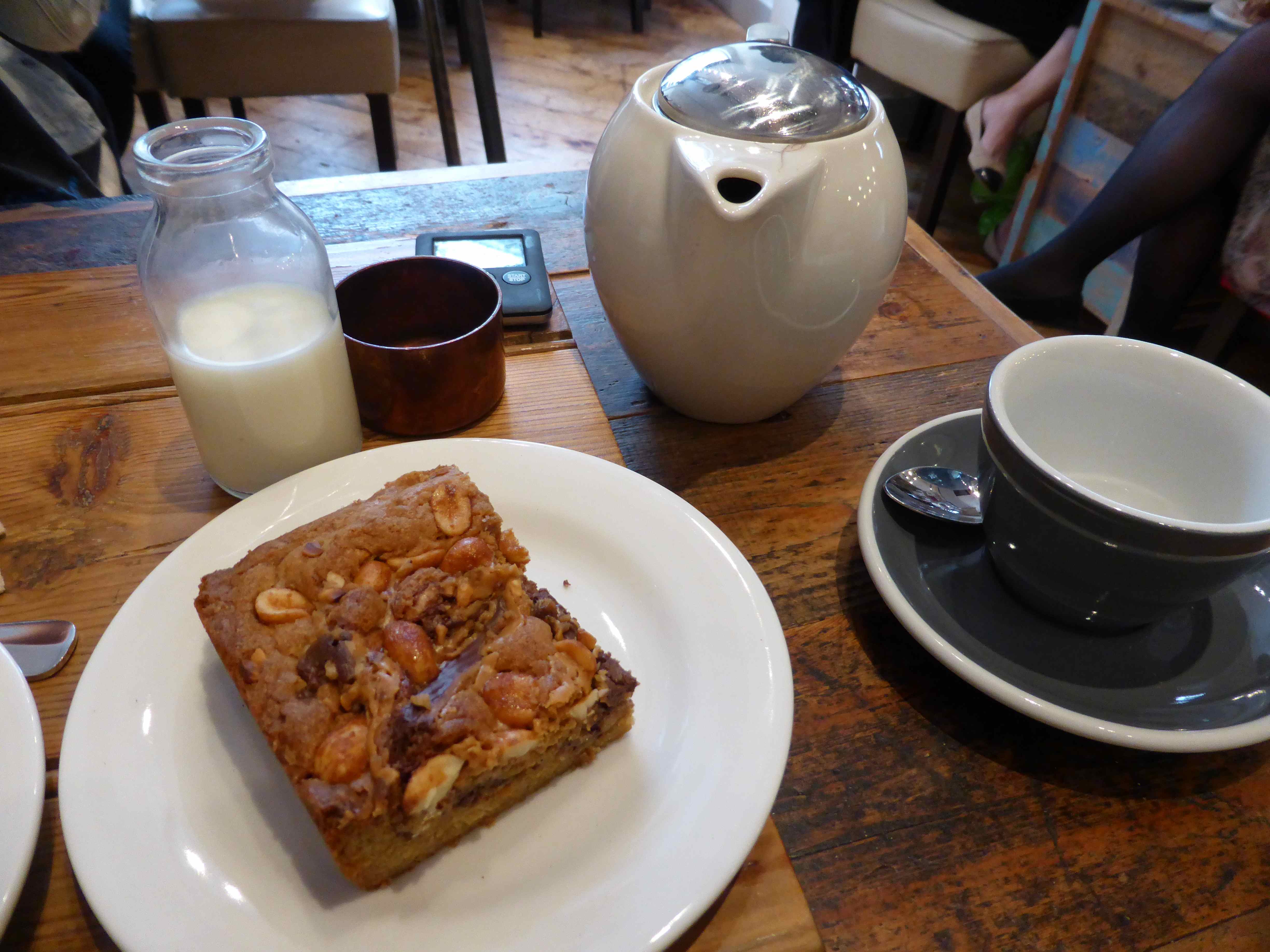 Oh dear me, the cake in here is very good. We shared a moist and chewy chocolate and hazlenut cookie and this fantastic peanut butter blondie. I had mine with tea. Check out that cute little milk bottle!