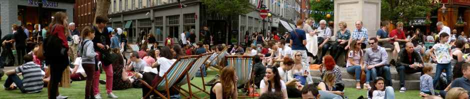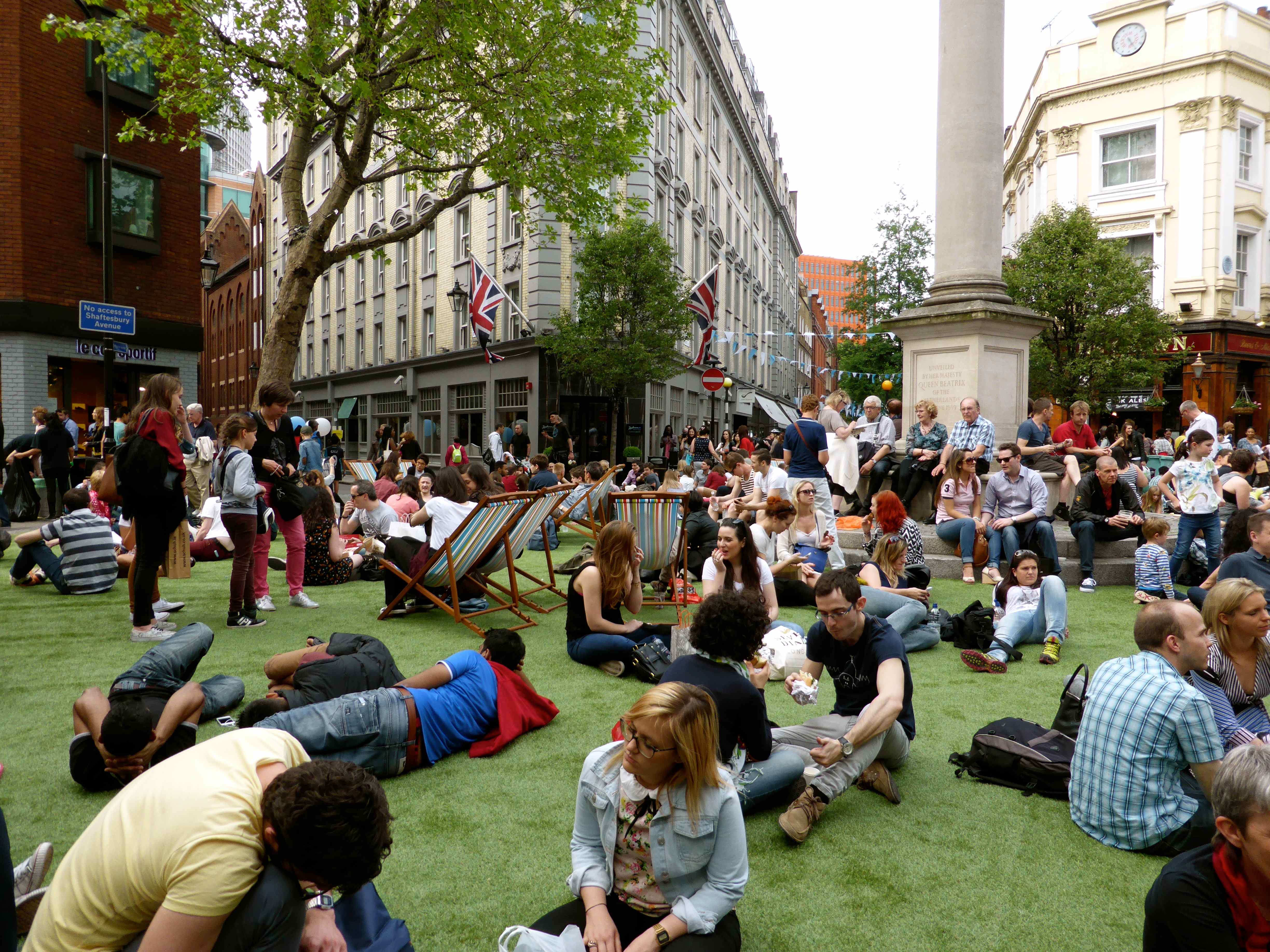 Look how brilliant this is – Seven Dials roundabout was astro turfed and it had deckchairs on it. There was such a wonderful atmosphere here today which I really enjoyed. This is my favourite part of London and I know I am lucky to work here but if I manage to get outside at all during the day I am constantly rushing and clock watching. It was wonderful to be able to breathe deeply, take my time and not worry about the time or what happened next. When we wanted to sit down we did. When we wanted to walk, shop, eat, we did. It was really good.