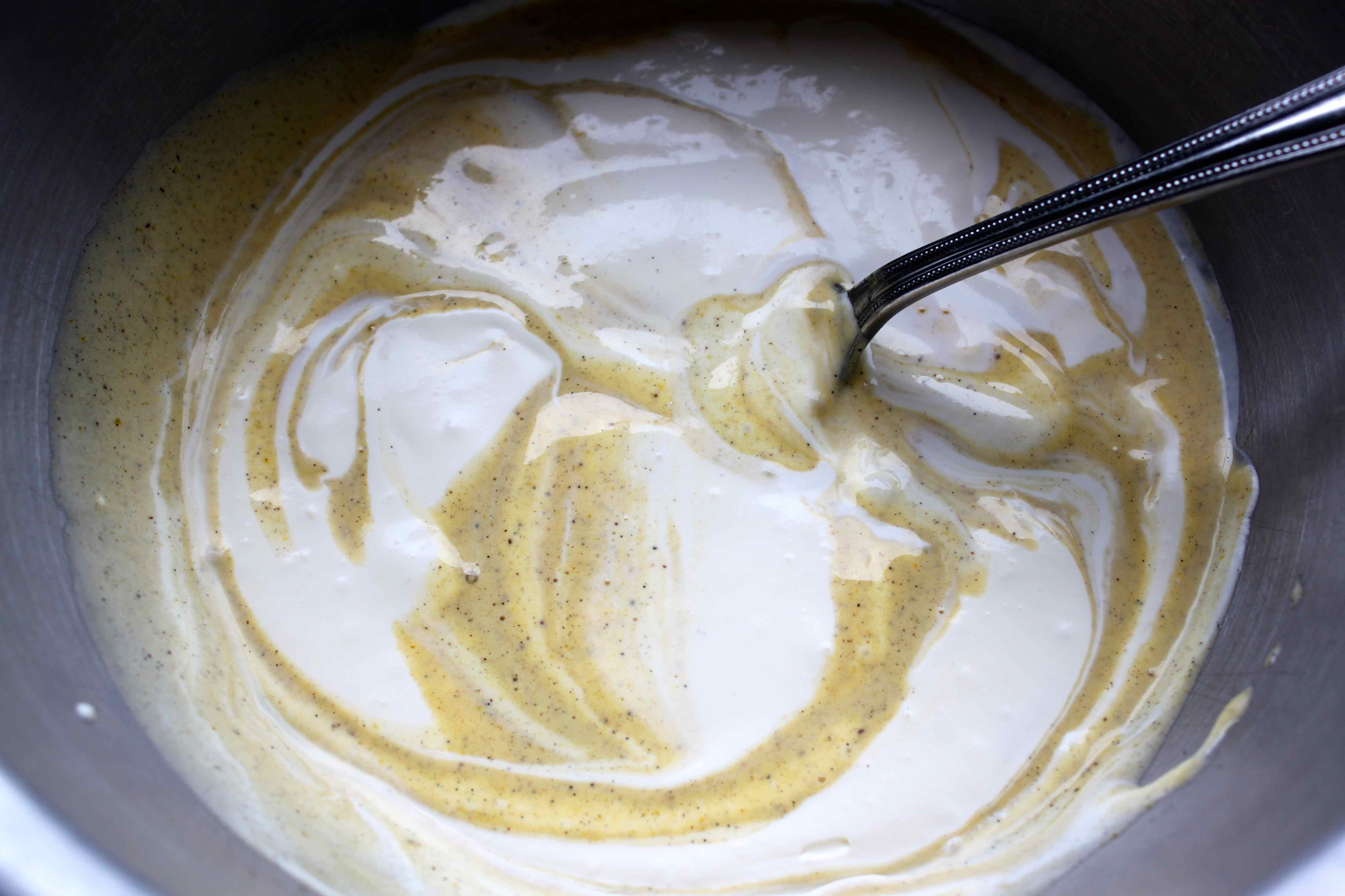 - Add the curry powder and peanut butter and mix thoroughly and then add the coconut milk