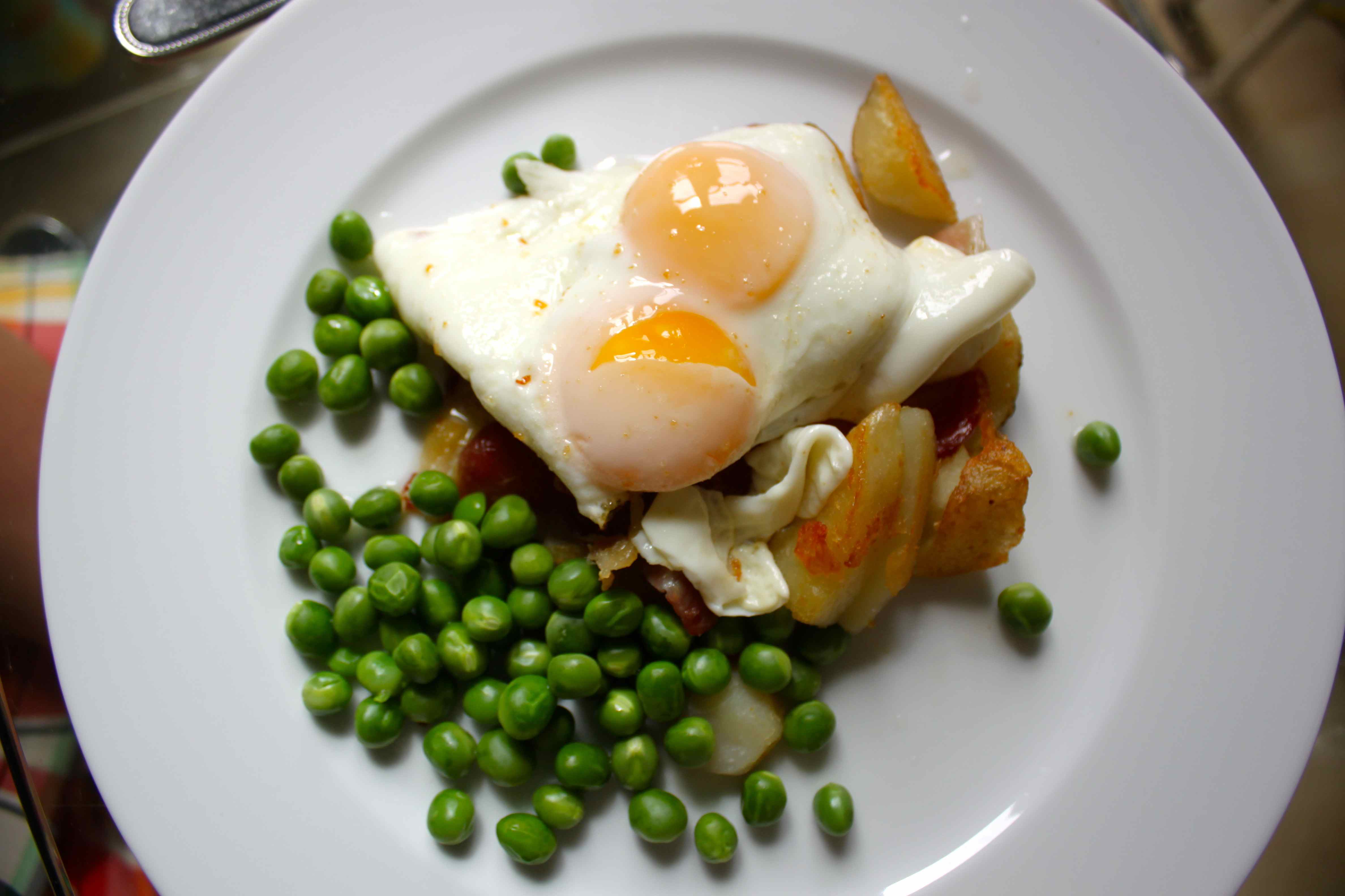 Peas from the garden with bacon, potatoes and egg is a very tasty way to start ones day.