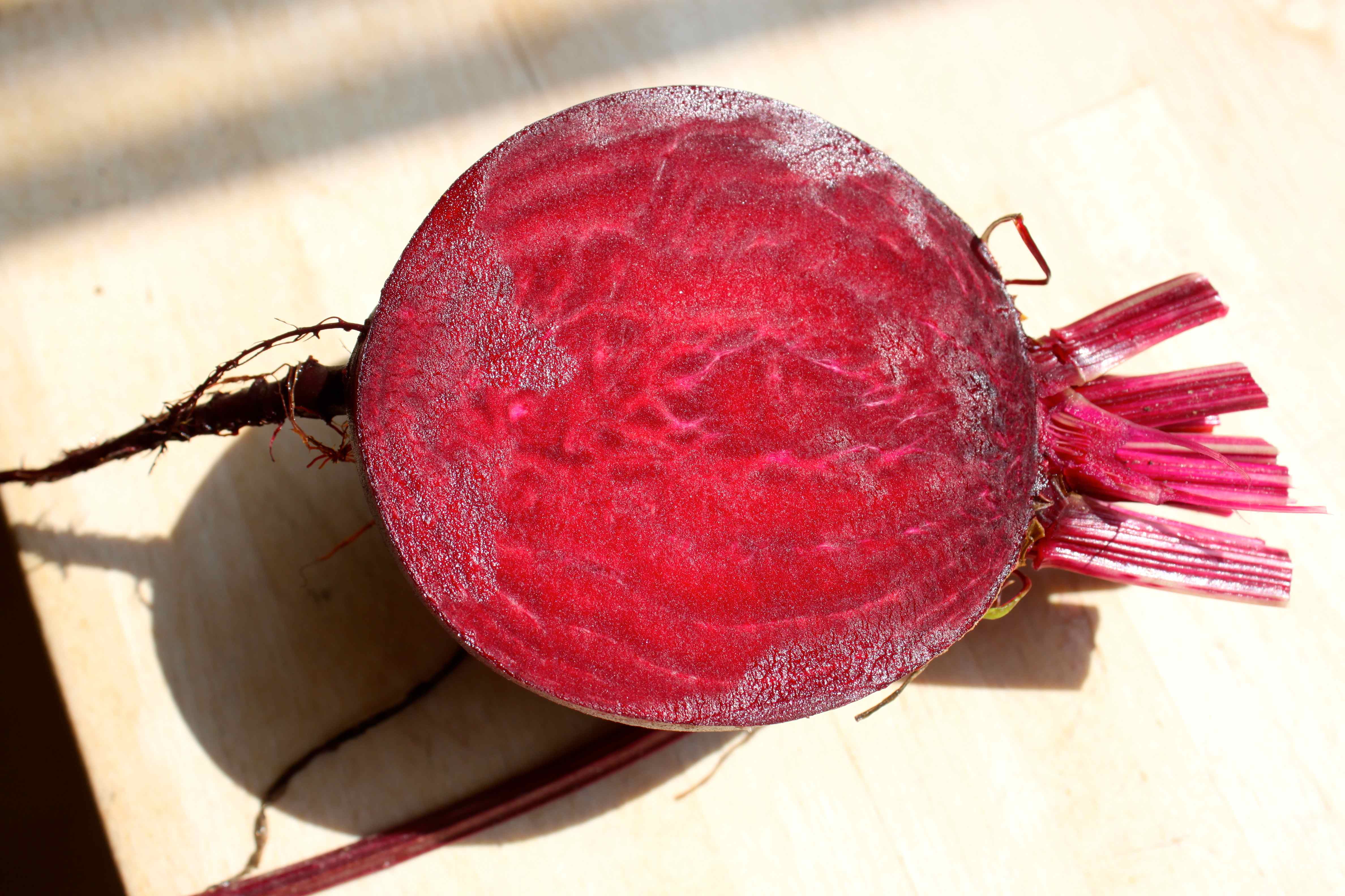 Half a beetroot, quarter of a pineapple, basil, ginger, lemon and beetroot leaves and stalks.
