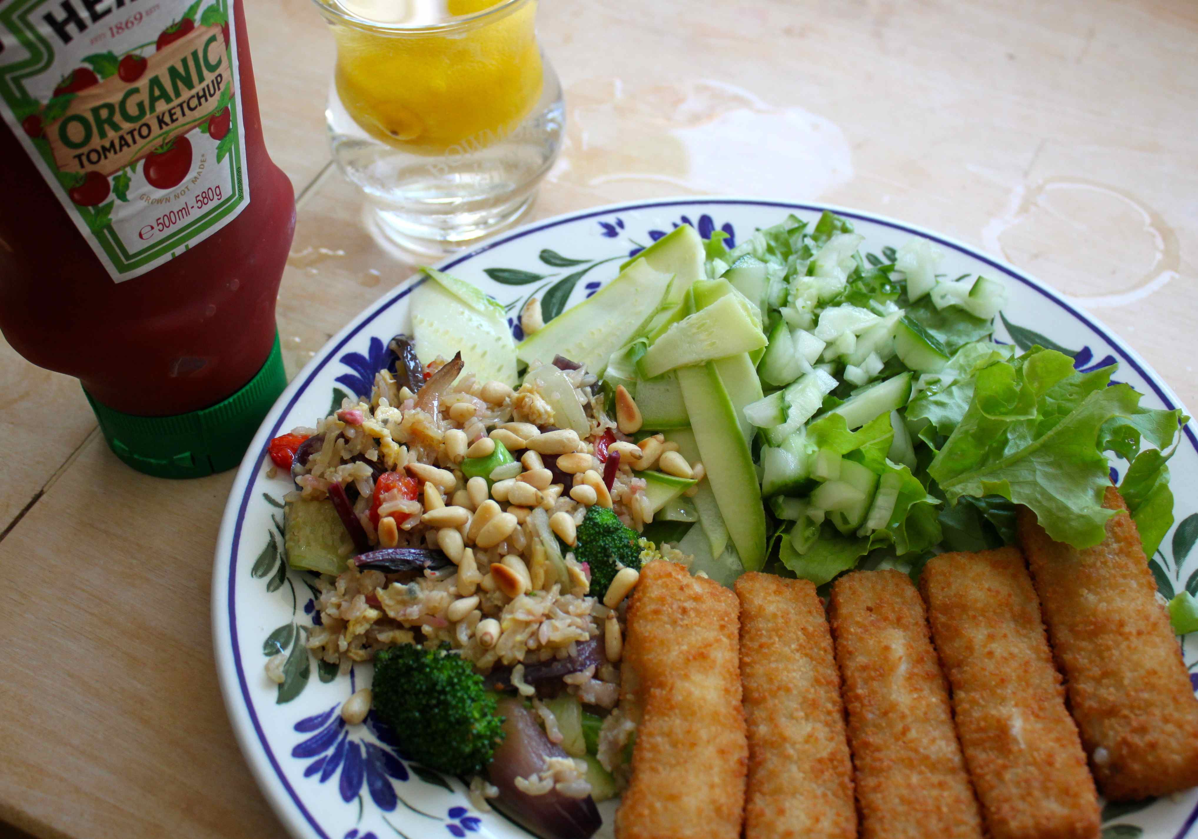 Harvey does very well eating vegetables. He had salad, stir fried rice and vegetables and fish fingers with ketchup.