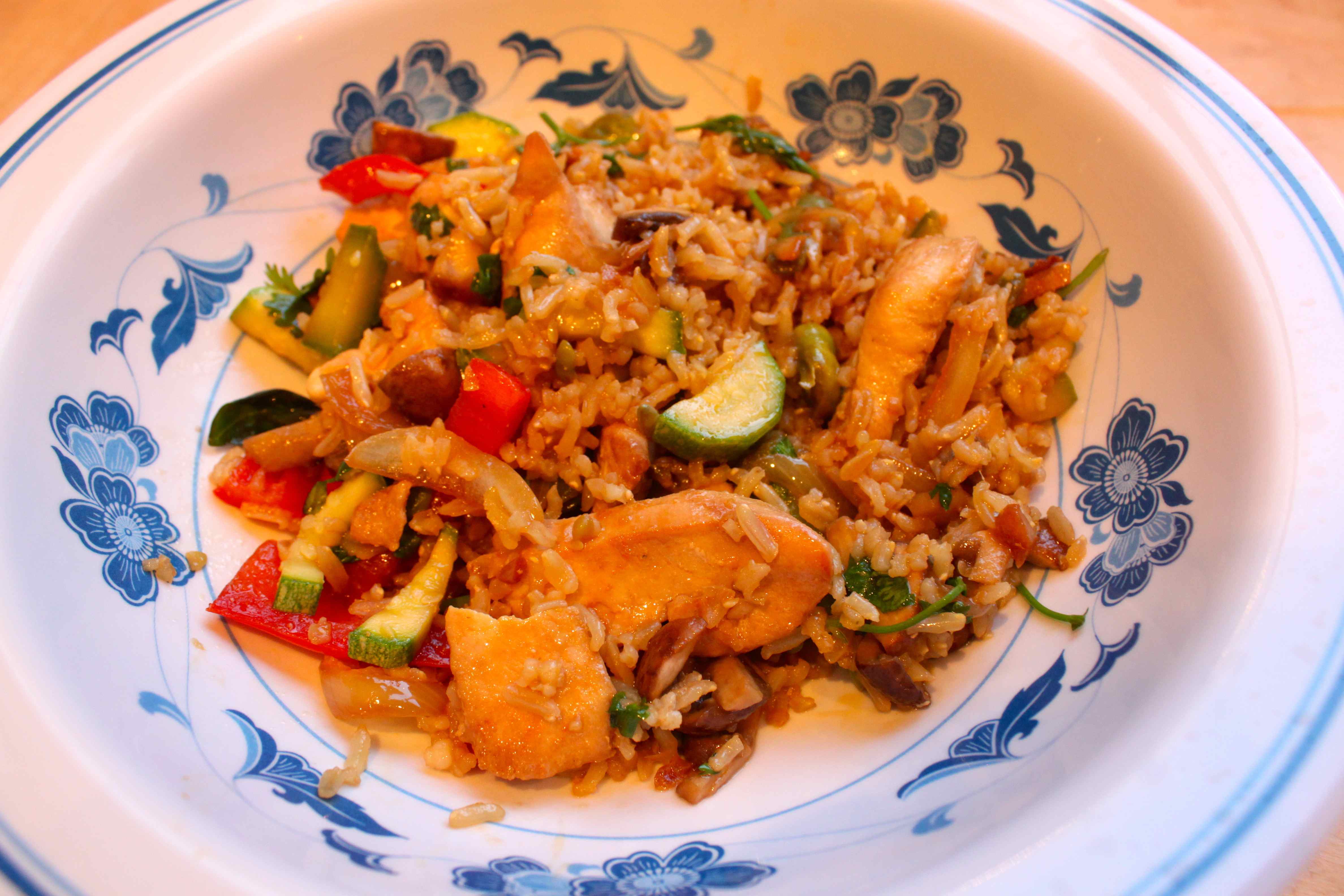 I stir fried the chicken first and made sure it was properly cooked. I set the cooked chicken aside while I stir fried the veggies; onion, red pepper, courgette, French, runner and broad beans, mushrooms, coriander and basil. Finally I added some pre-cooked brown basmati rice and le voila, a simple and tasty supper.