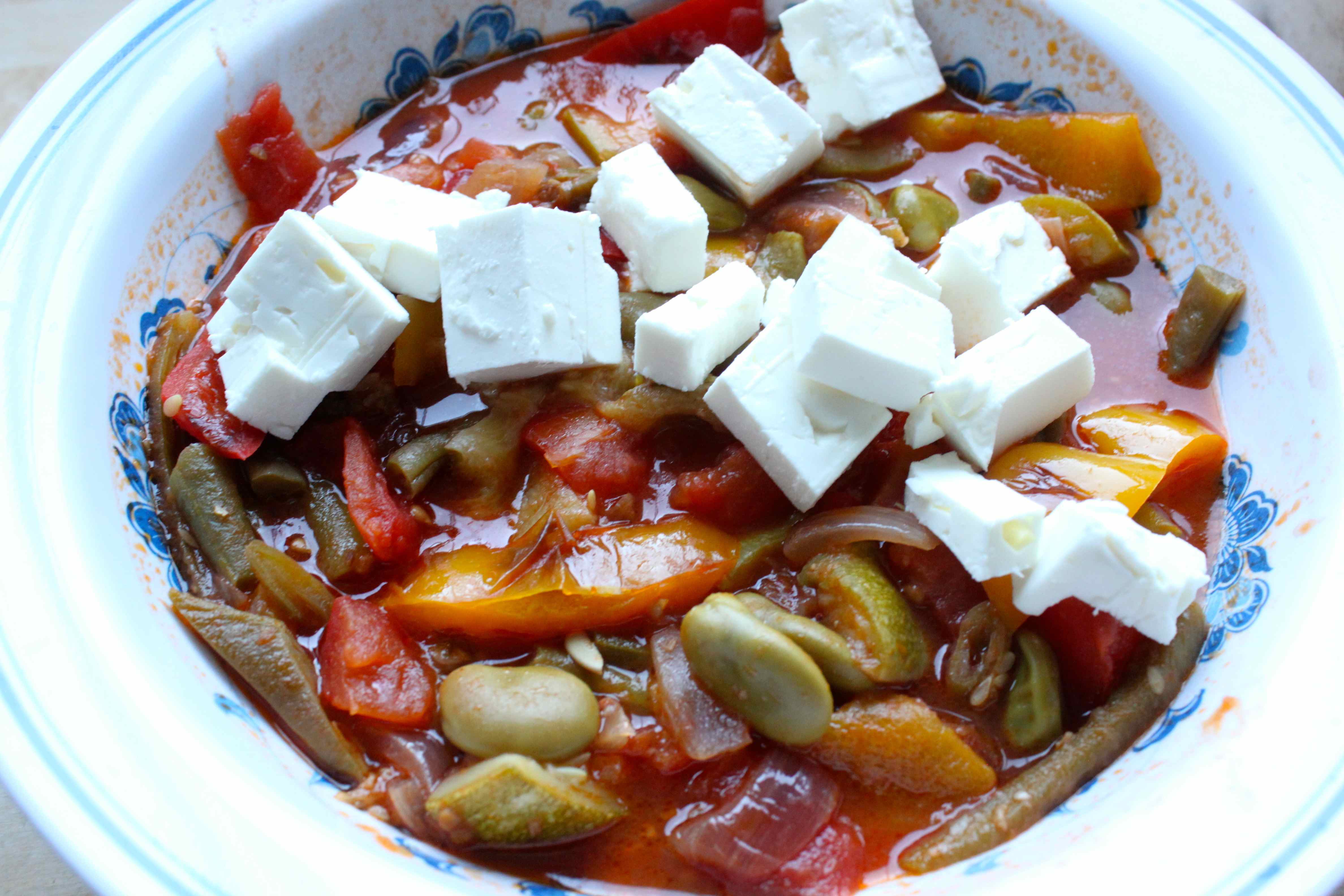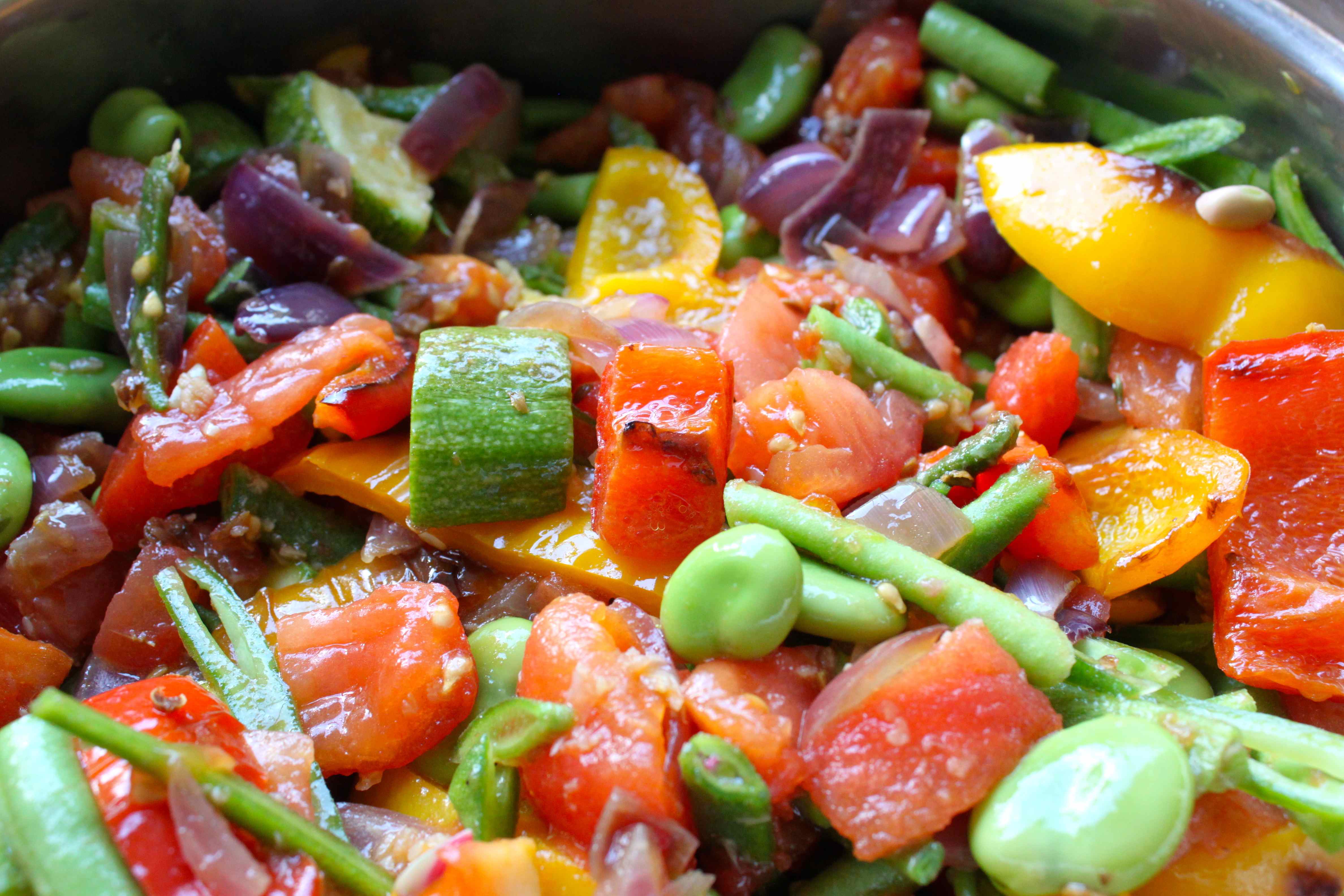 They went in to the pot with onions, courgettes, juicy tomatoes, red and yellow peppers and broad beans. All the beans and courgettes were from the garden so this was an excellent recipe to use up lots of the vegetables which I seem to have too many of.
