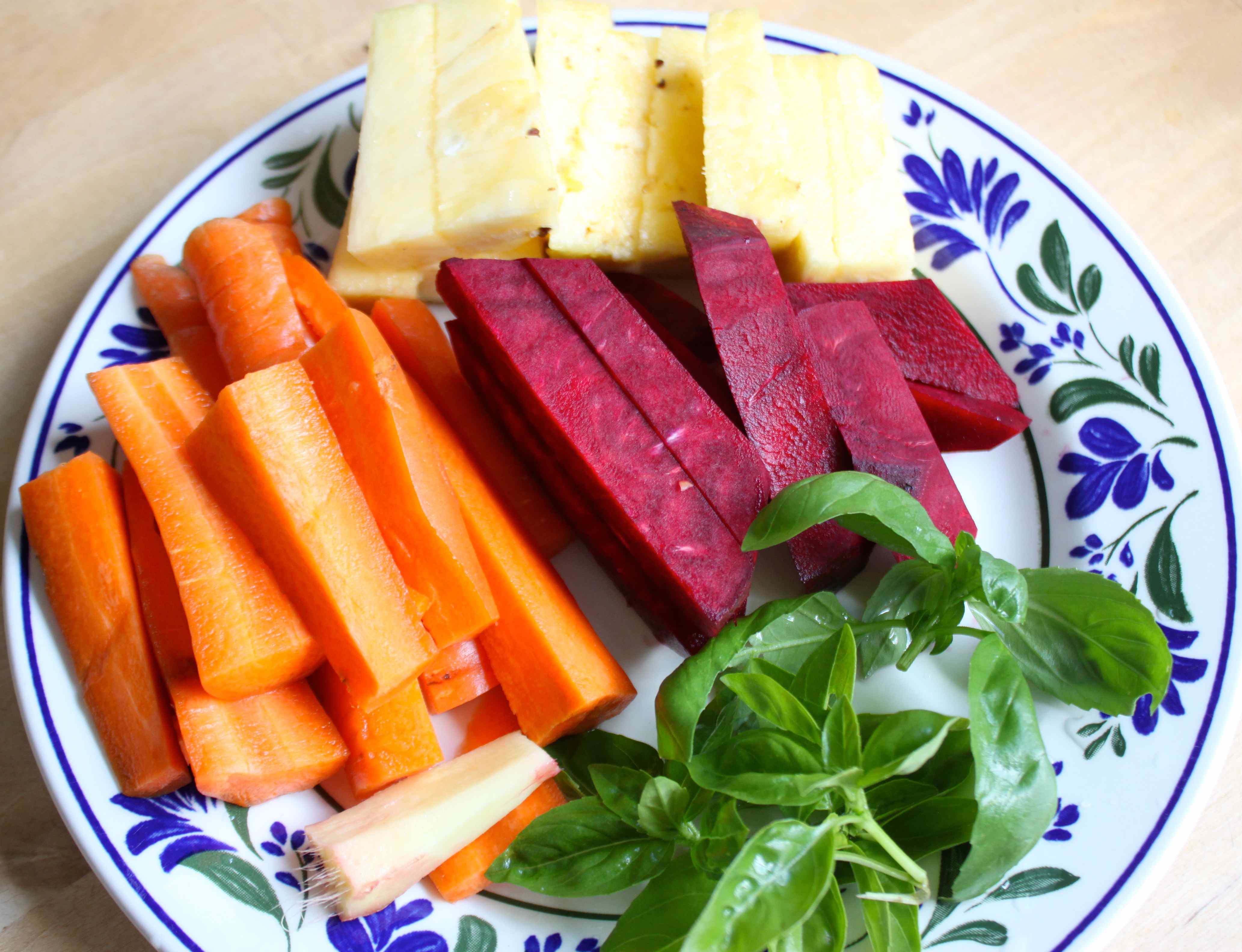 I chopped up everything I needed to make my juice; carrots, beetroot, pineapple, ginger and basil. Chopped up because the masticating juicer I have been using, which did make lovely tasting juice, required the fruits and veggies to be cut up quite small which was a real bore.