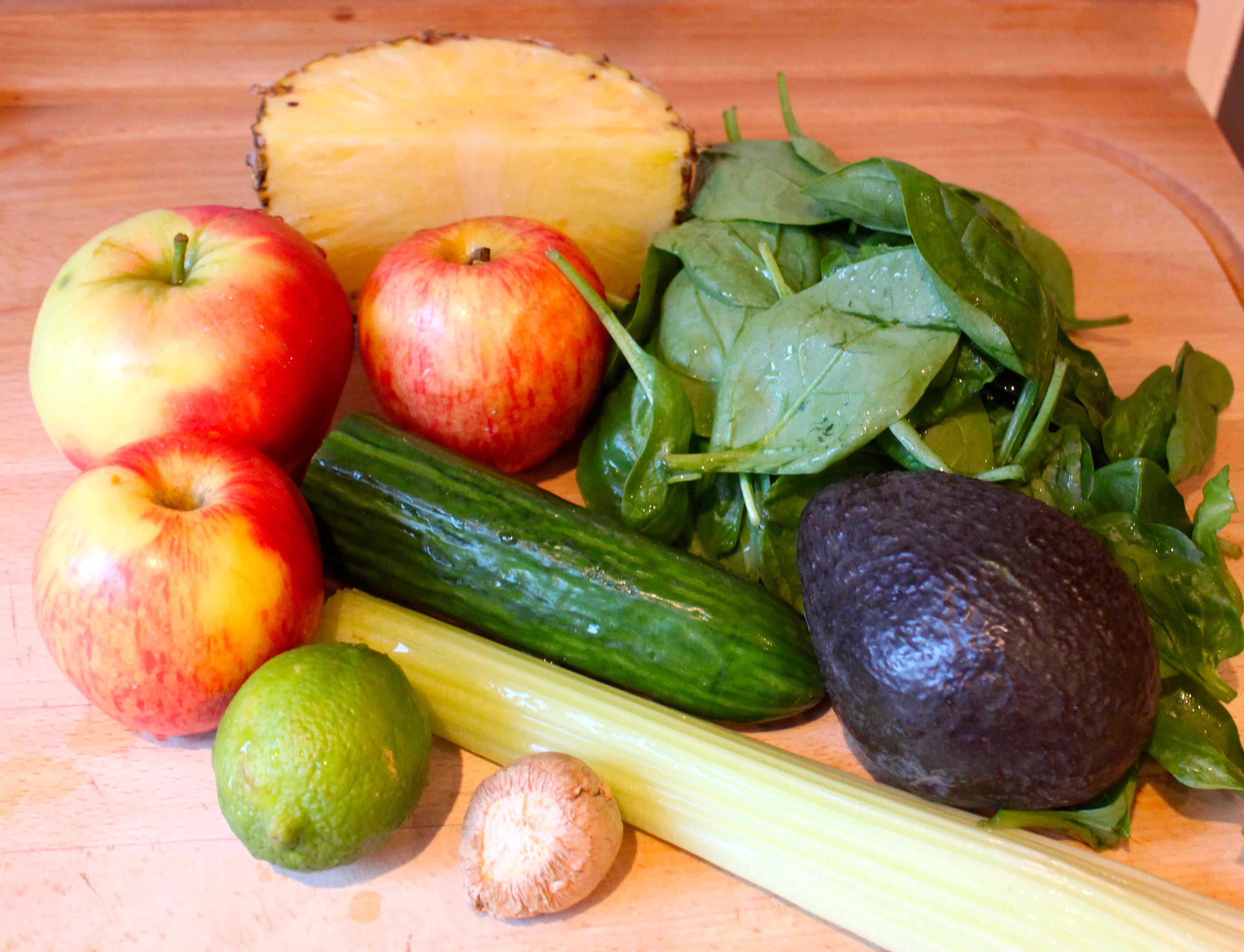 To make this lovely drink you juice everything except the avocado and then blend the avocado with the juice.