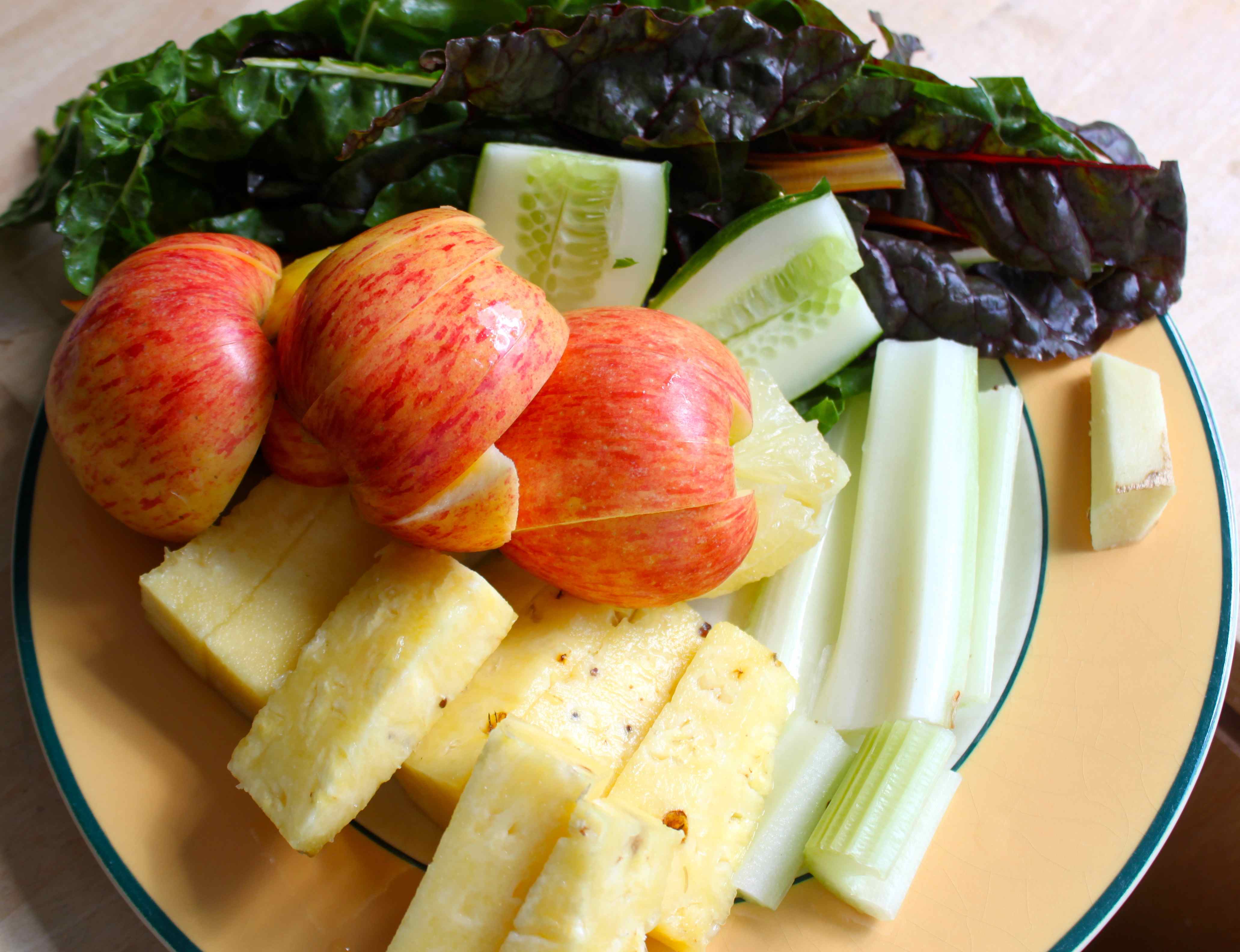 I juiced 2 apples, my weird cucumber, chard leaves and stalks, celery, ginger and pineapple.