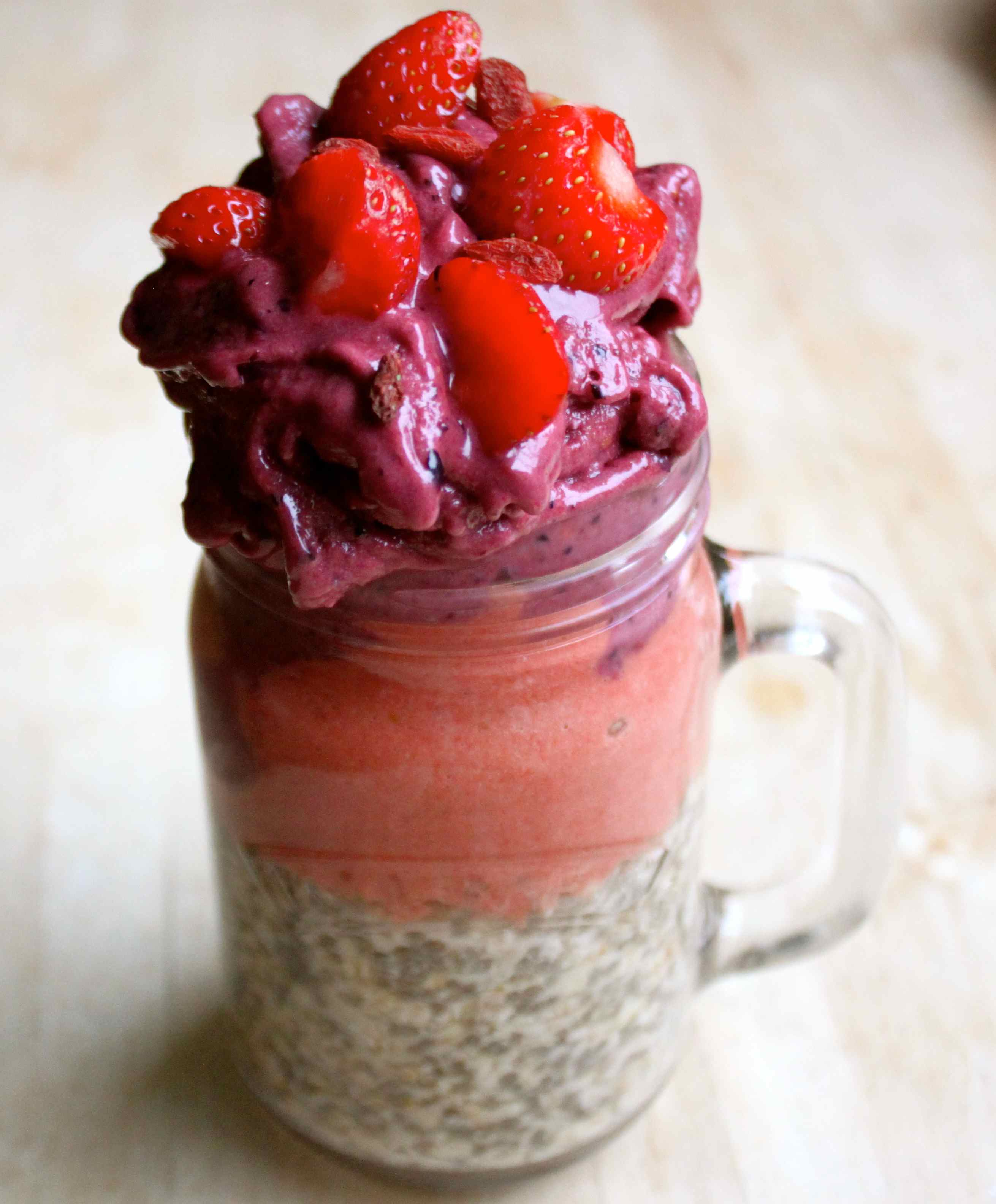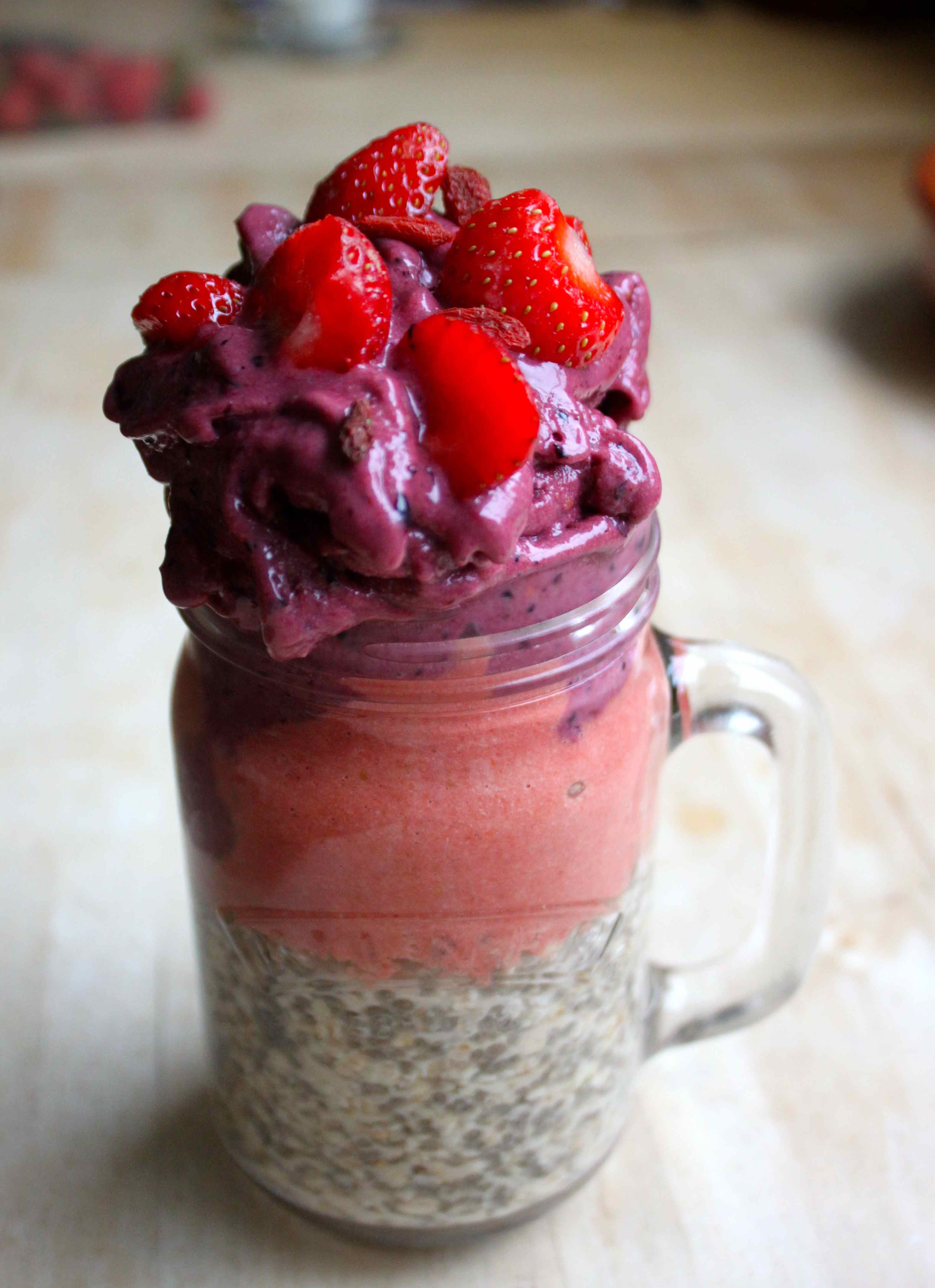 This morning I put the strawberry juice and goji berries in to the blender with 1 tbsp cashew nut butter and 1 heaped tsp coconut flakes and blended until smooth. I added about half the strawberry sauce to the glass with the oats which had gone firm overnight and left the rest in the blender. I added 1 frozen banana and 1/2 a cup of frozen blueberries to the strawberry sauce in the blender and blended until smooth. I put the Banana and blueberry ‘ice-cream’ on top of the strawberry sauce.