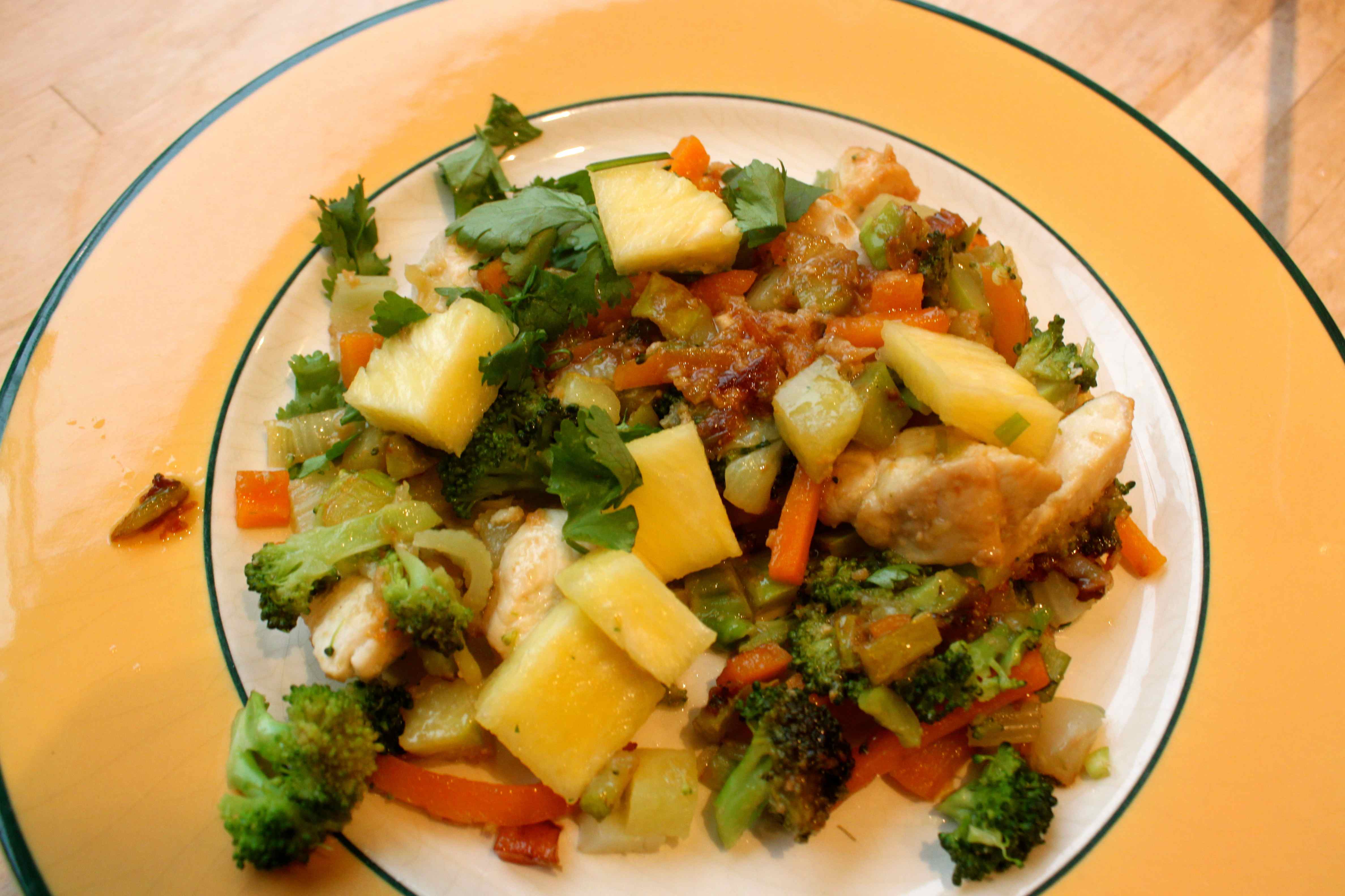 I ‘stir fried’ chopped up carrots, fennel, broccoli, trombetti and spring onions in water for about 4 – 5 minutes until the water had dissolved and the veggies were al dente. I then added some chopped up chicken which I had marinated all afternoon in olive oil, lemon juice, garlic and ginger. Served with raw fresh pineapple and coriander. I cooked wholewheat noodles for the others but I just had the chicken and veggies.