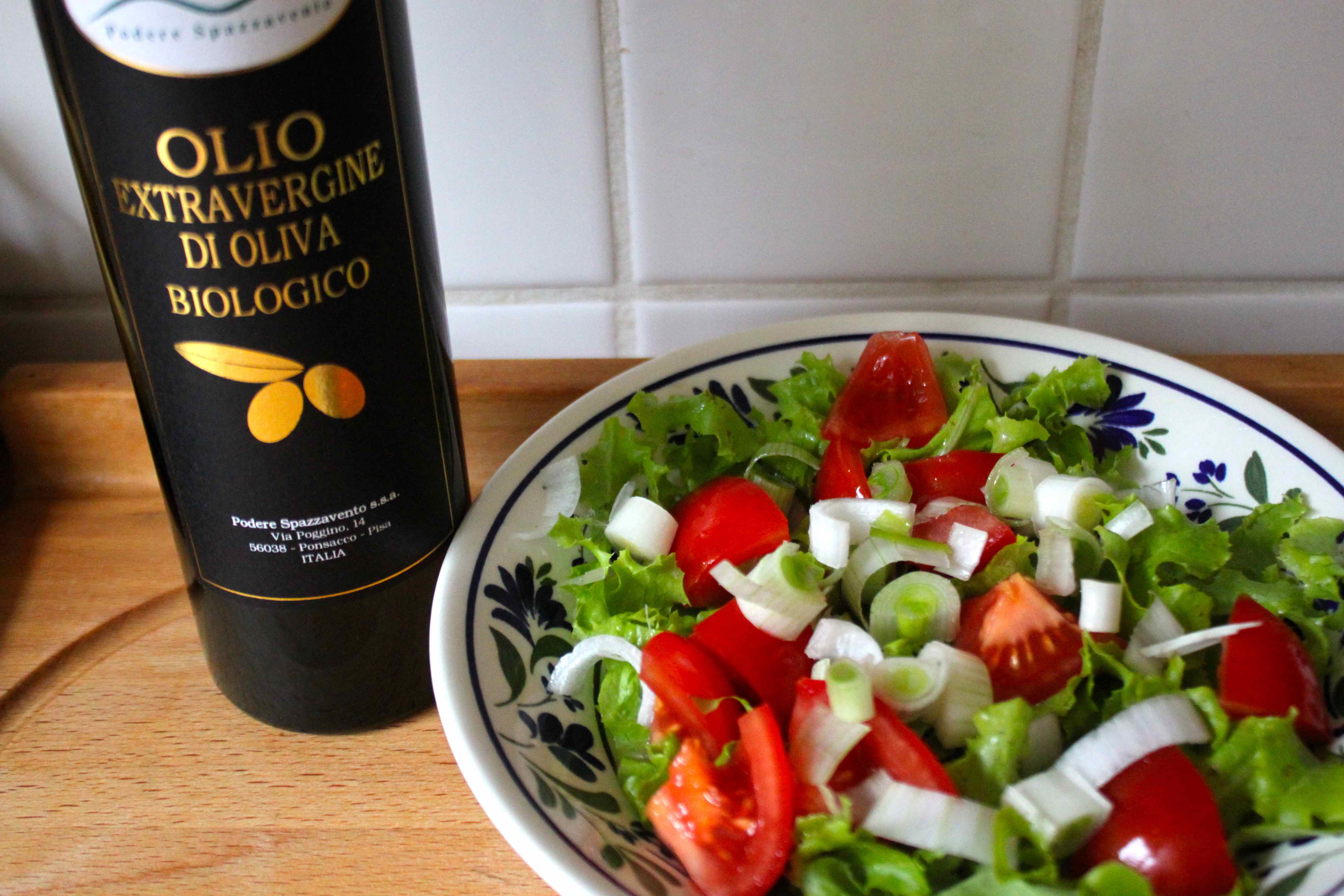 I made a salad with lettuce, tomato and spring onion dressed with just 1 tbsp of the lovely olive oil we brought back from Italy. That was it, just a bowl of raw veggies.