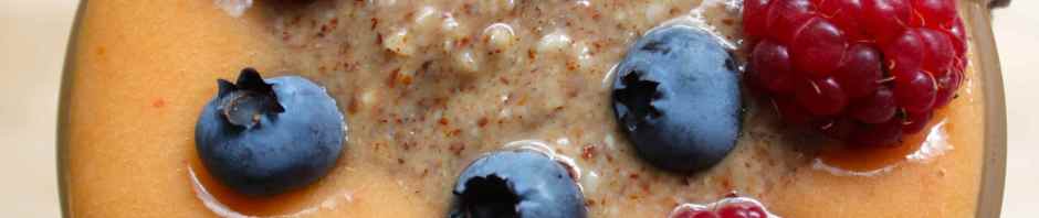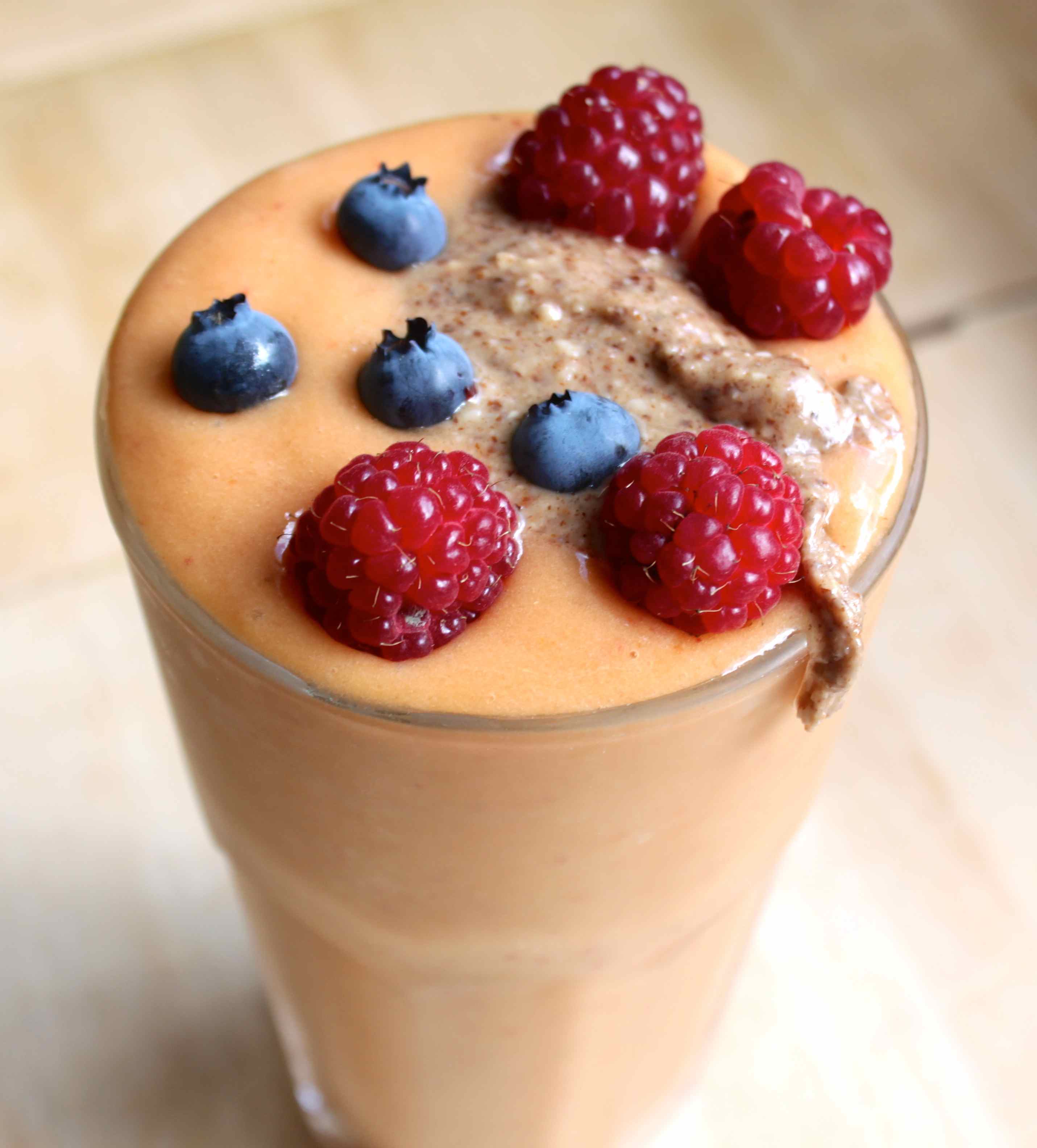 1 peach, 2 apricots, 2 frozen bananas, blended until very smooth and topped with berries from the garden and activated almond butter.
