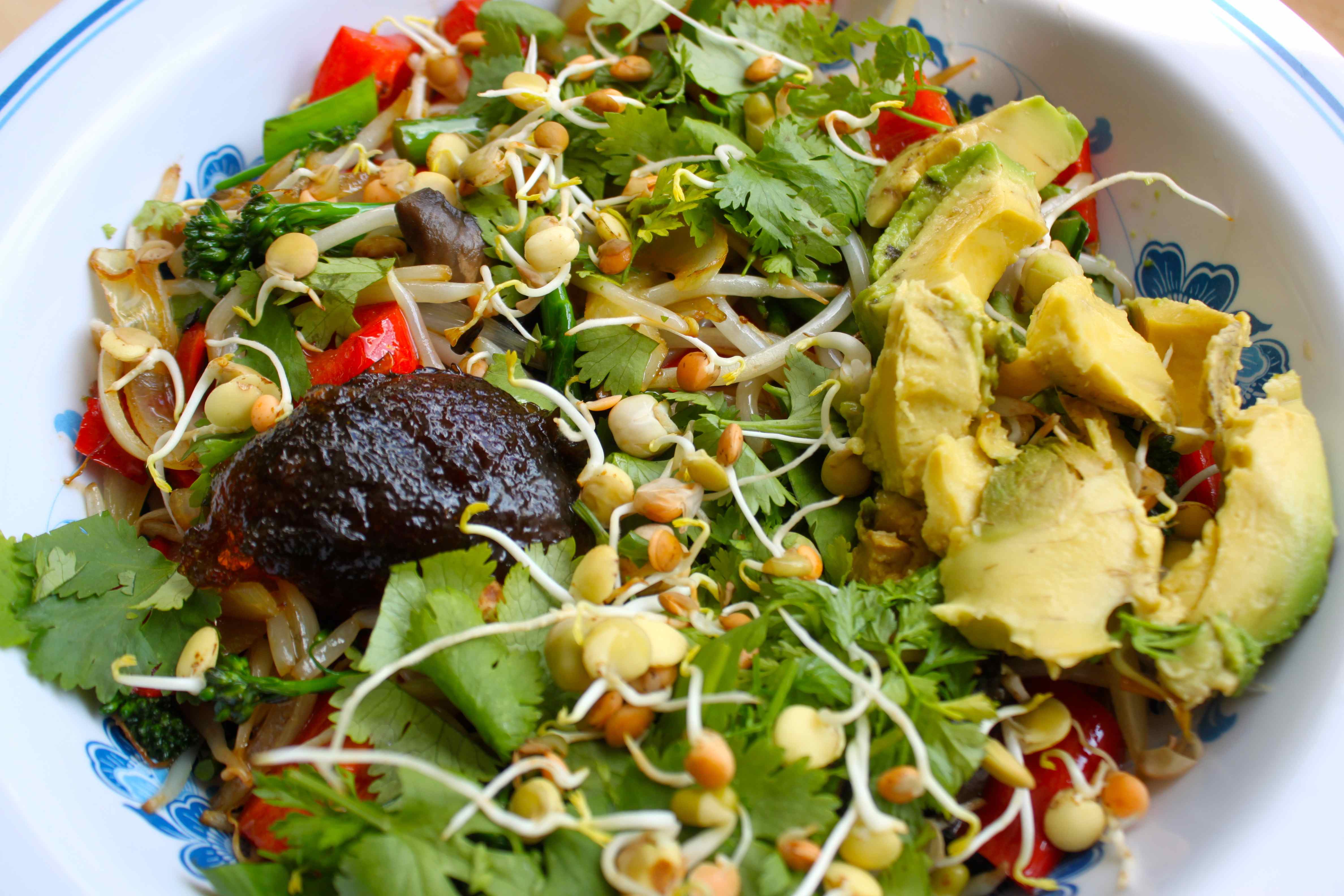 I began with a juice to try to restore some health to my body after that extraordinary dessert yesterday.fruit and veg for juice I like juices and they make me want to continue eating and drinking highly nutritous food.green juice 2-9 2 An excellent start to the day.green juice 2-9 Mid morning I snacked on a juicy nectarine.juicy nectarine 2-9 At lunch time I really wanted rice with some stir fried vegetables.  I cooked up a large pot of rice and flavoured the rice with turmeric and za’tar while it cooked.rice and cup and seive I stir fried onions, red pepper, broccoli, beansprouts and mushrooms, served with half an avocado, coriander, sprouted beans and seeds and a large spoonful of lime pepper jelly.lime pepper jelly Very healthy.lunch 2-9-14 2 Very tasty.lunch 2-9-14 For dinner I wanted a Thai style vegetable curry and heaving searched my recipe books and failing, I found a Jamie Oliver recipe on-line.  You can see the original recipe here.  I have written up how I made it.