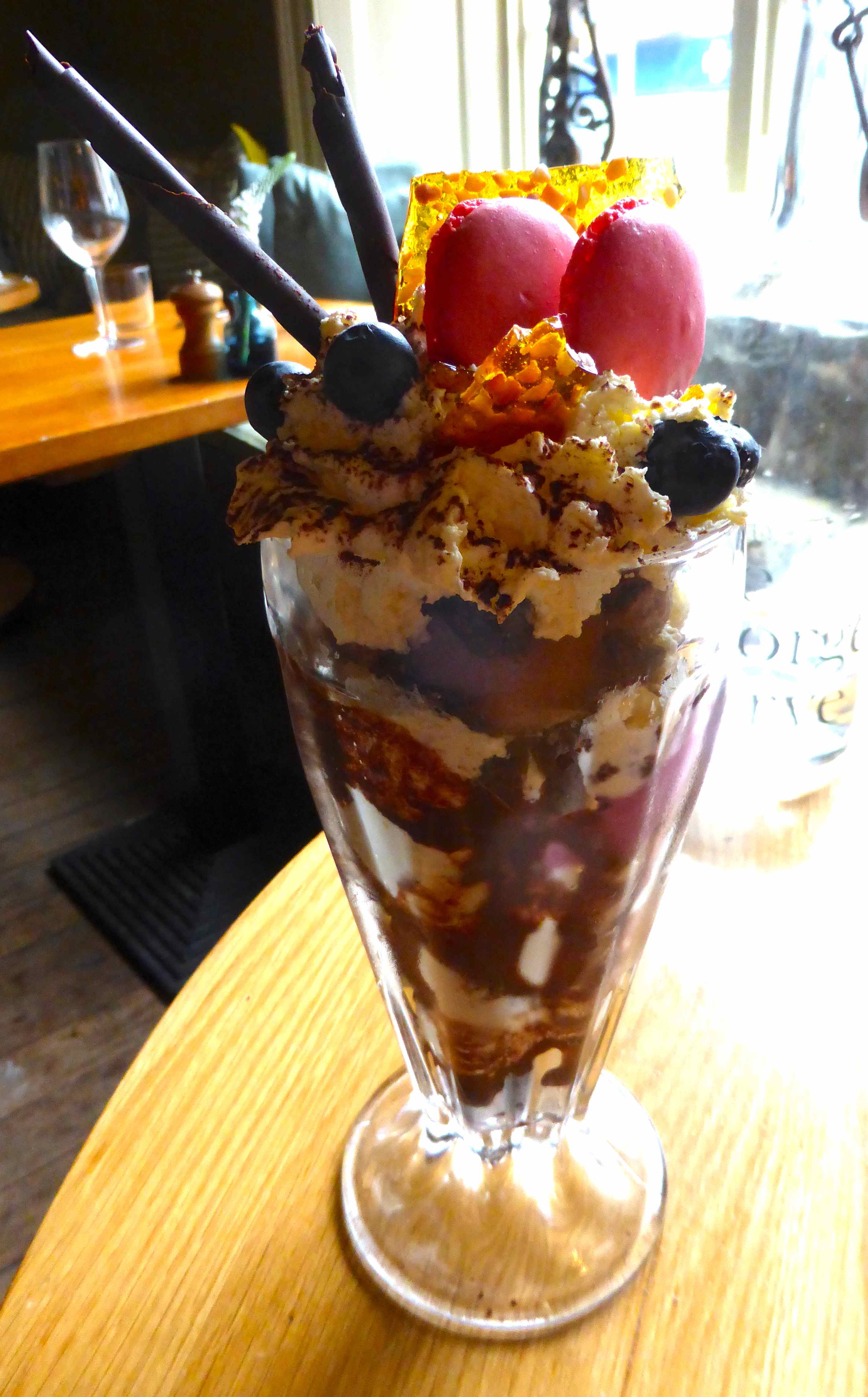 This was even more naughty but totally delicious. It’s the george sundae and it was a delightful concoction made from brownie, chocolate and blackcurrant ice-cream, cream and hazelnuts topped with cherries, laduree, chocolate, cherries and a crunchy sugar thingy. Very good but oh, so naughty.