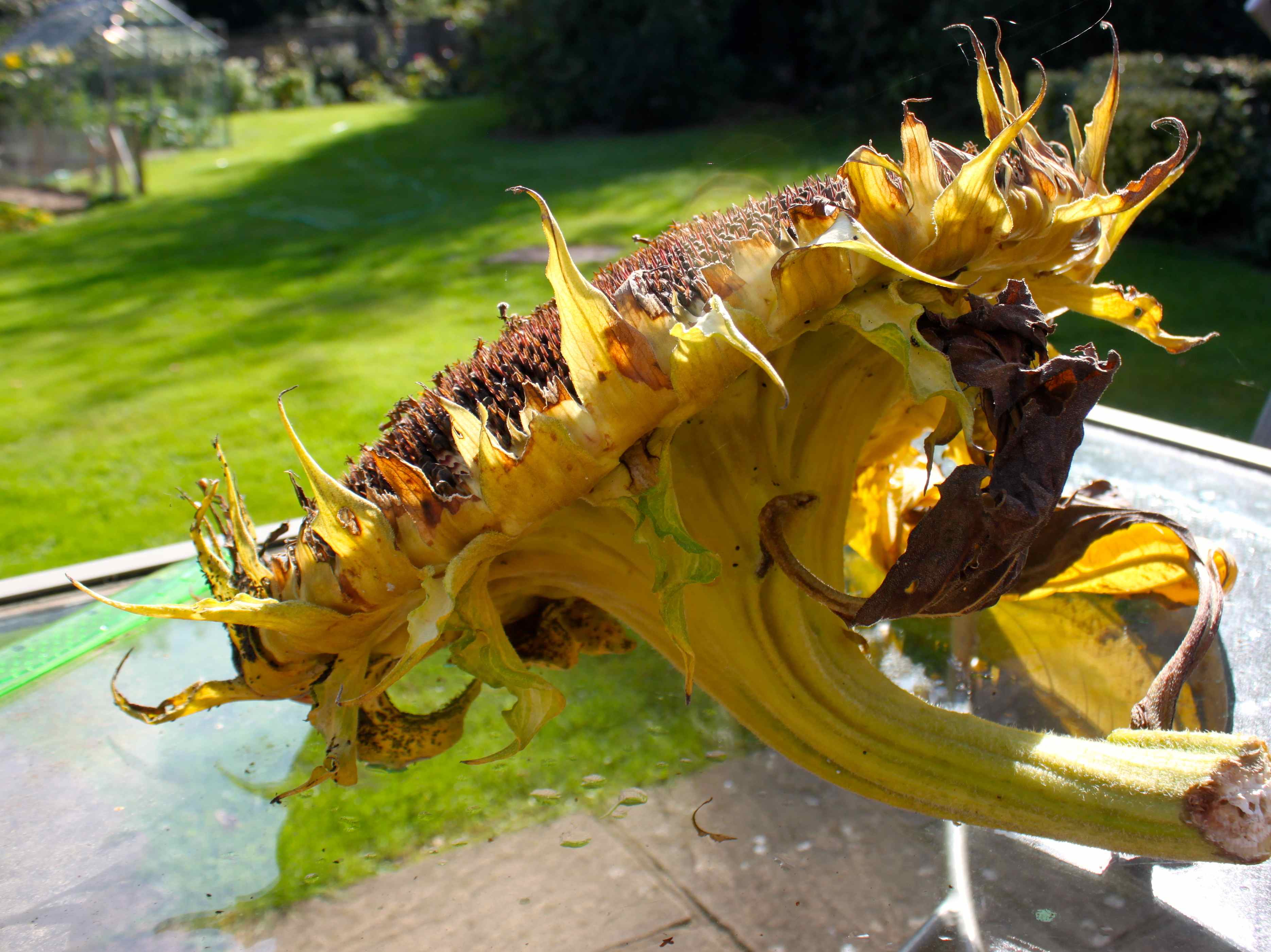 The giant sunflower has collapsed so I cut off its huge head for the birds to enjoy the seeds. I lay a 12 inch ruler against it so you can see the size.