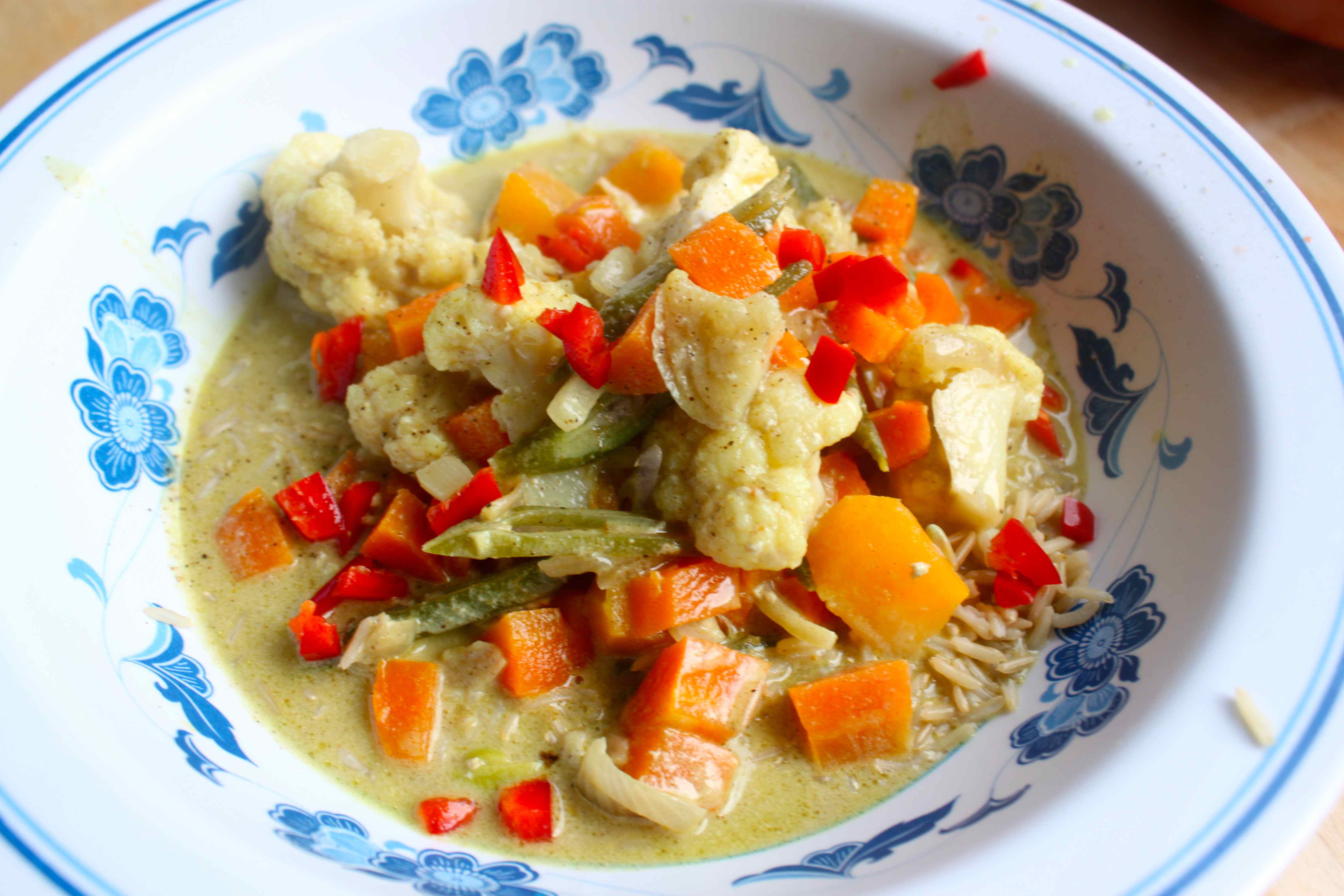 At lunch time I made a vegetable Korma with onion, runner beans, carrots, cauliflower and sweet potato. It was such a simple recipe. I fried the onion, added 1 heaped tsp curry powder, fried for another couple of minutes then added the vegetables and two tins of coconut milk. After about 10 – 15 minutes it was ready!