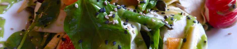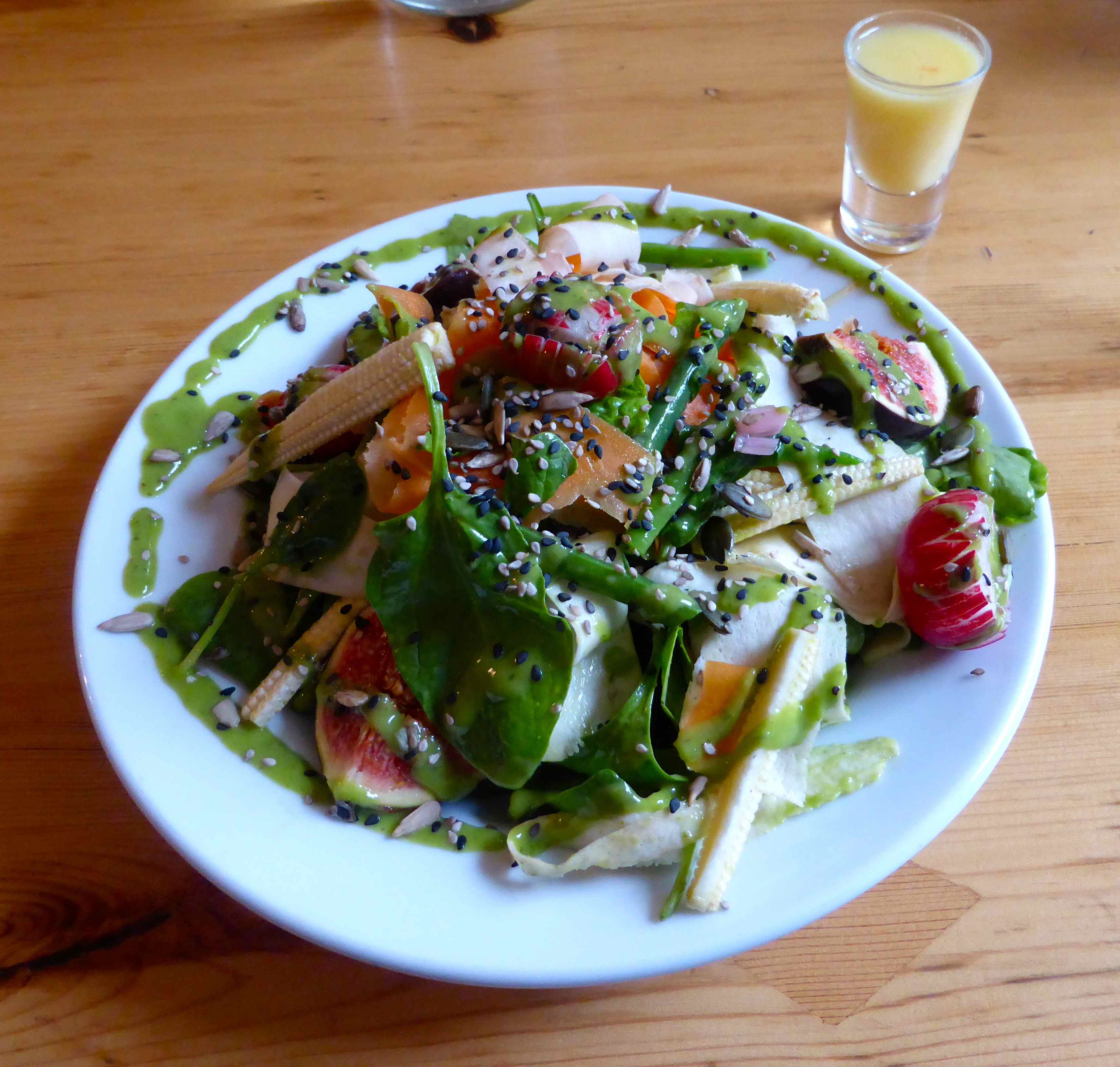 One of the best salads I have had for a long time. I have never had raw parsnip and it was tasty. The parsnip and carrot was sliced ultra thin in to wide but very thin ribbons and both were excellent. The salad also had a variety of green leaves, green beans, asparagus, mini sweet corns, radishes, figs, seeds and a very light green dressing which I am guessing had avocado in it. Fabulous.