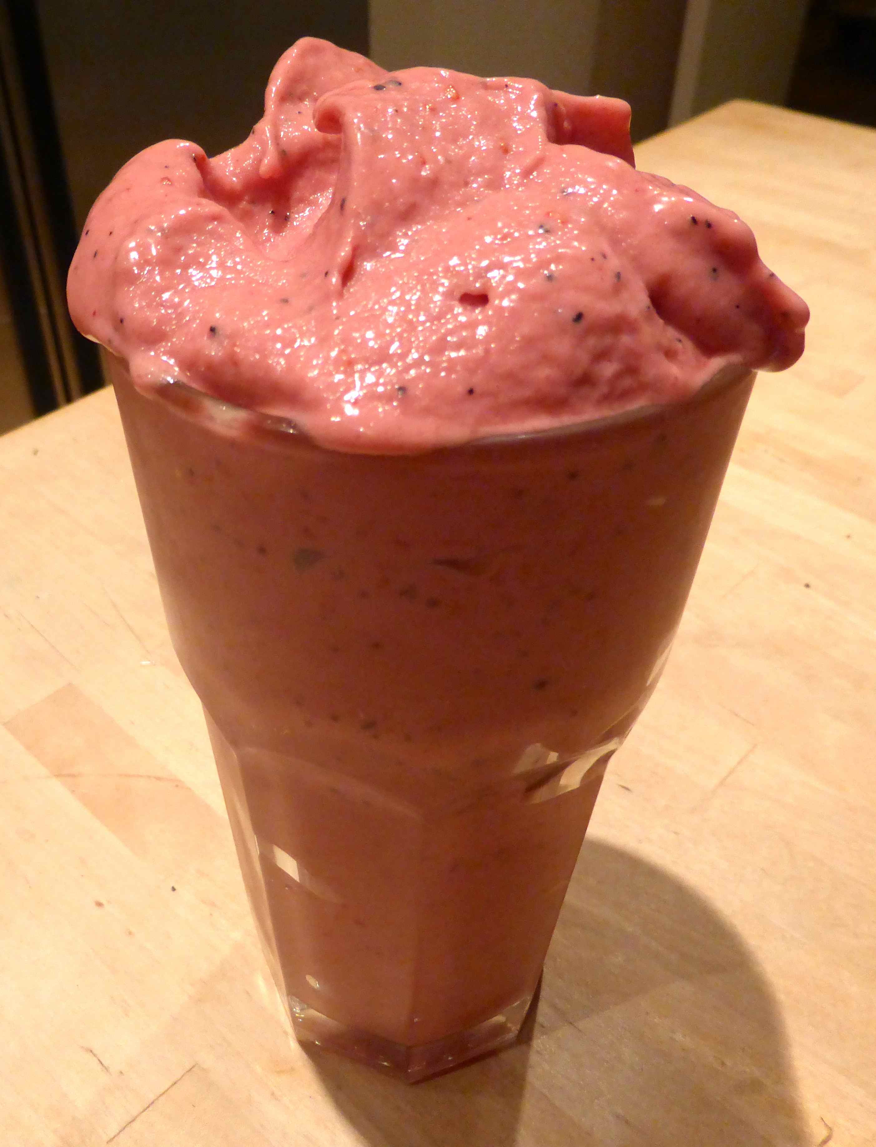 Made with 1/4 of an avocado, 2 frozen bananas, frozen raspberries, 2 passion fruits, 1 heaped tbsp cashew nut butter and some almond milk to loosen it. It was divine.