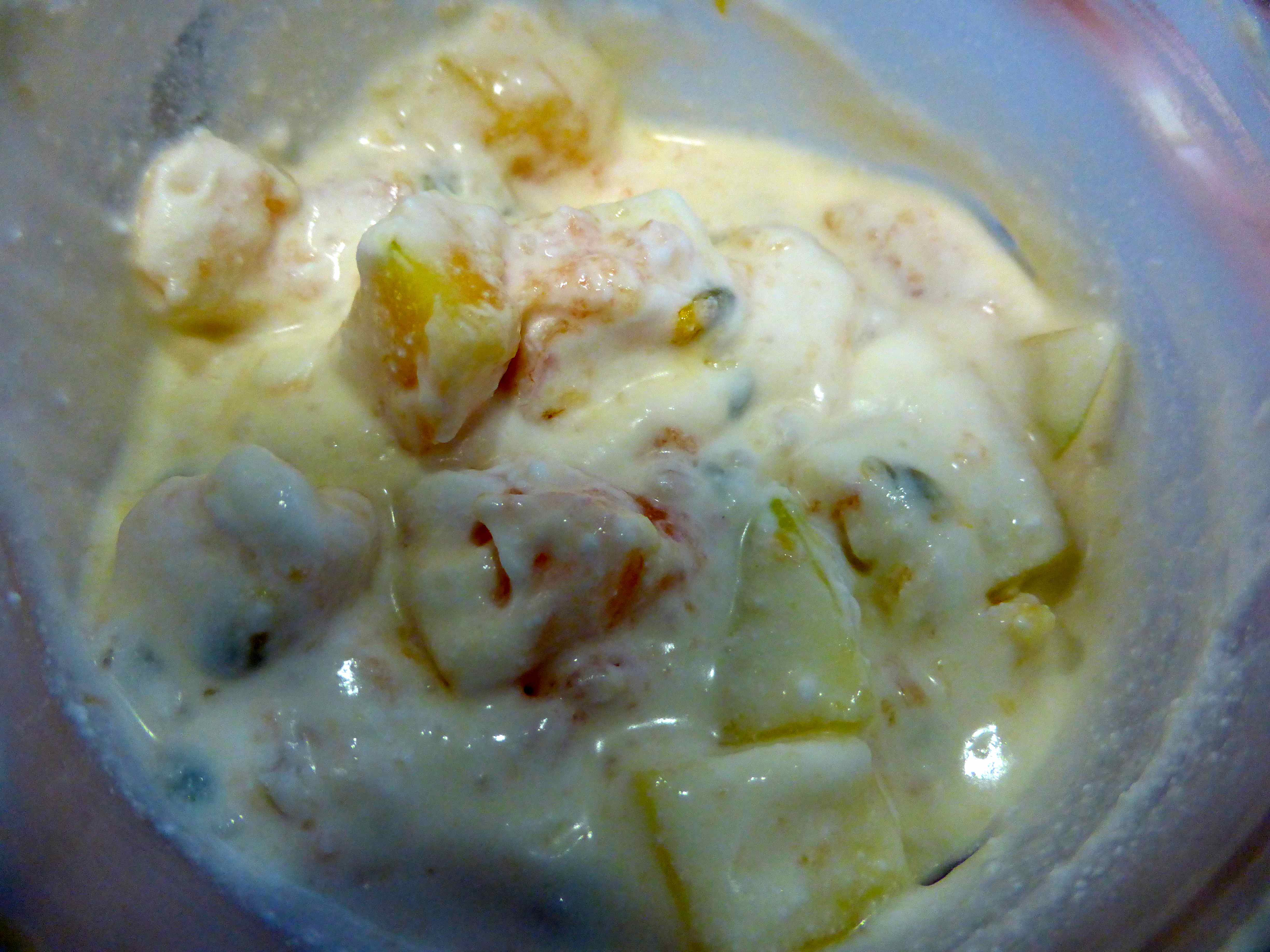 I brought in from home a pot of chopped mango, papaya and passionfruit topped with coconut yogurt.