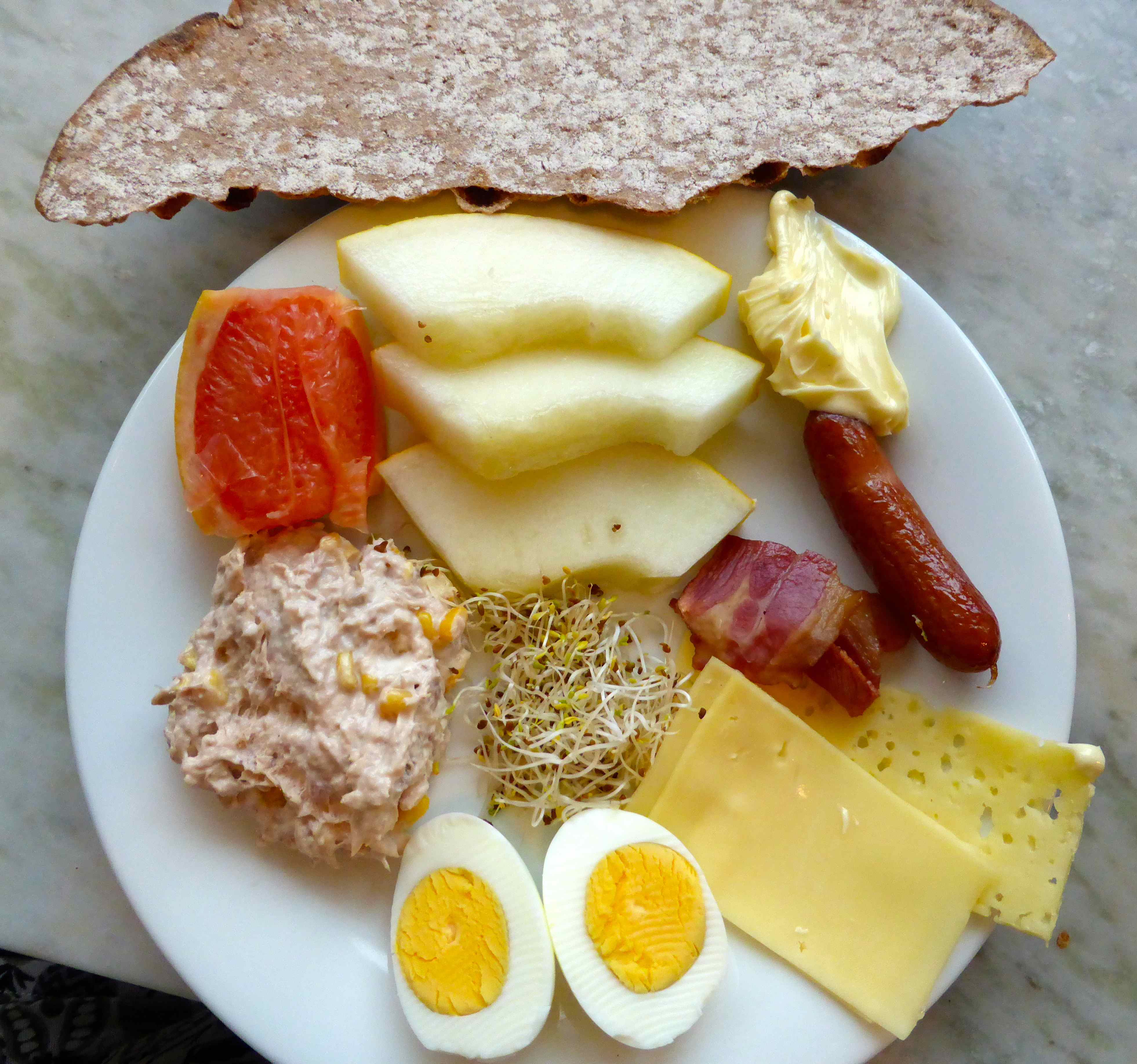 One plateful today with part of a crisp bread, butter, melon, pink grapefruit, sausage, bacon, boiled egg, tuna, cheese and sprouts. The melon today was wonderful as it was so sweet and juicy.