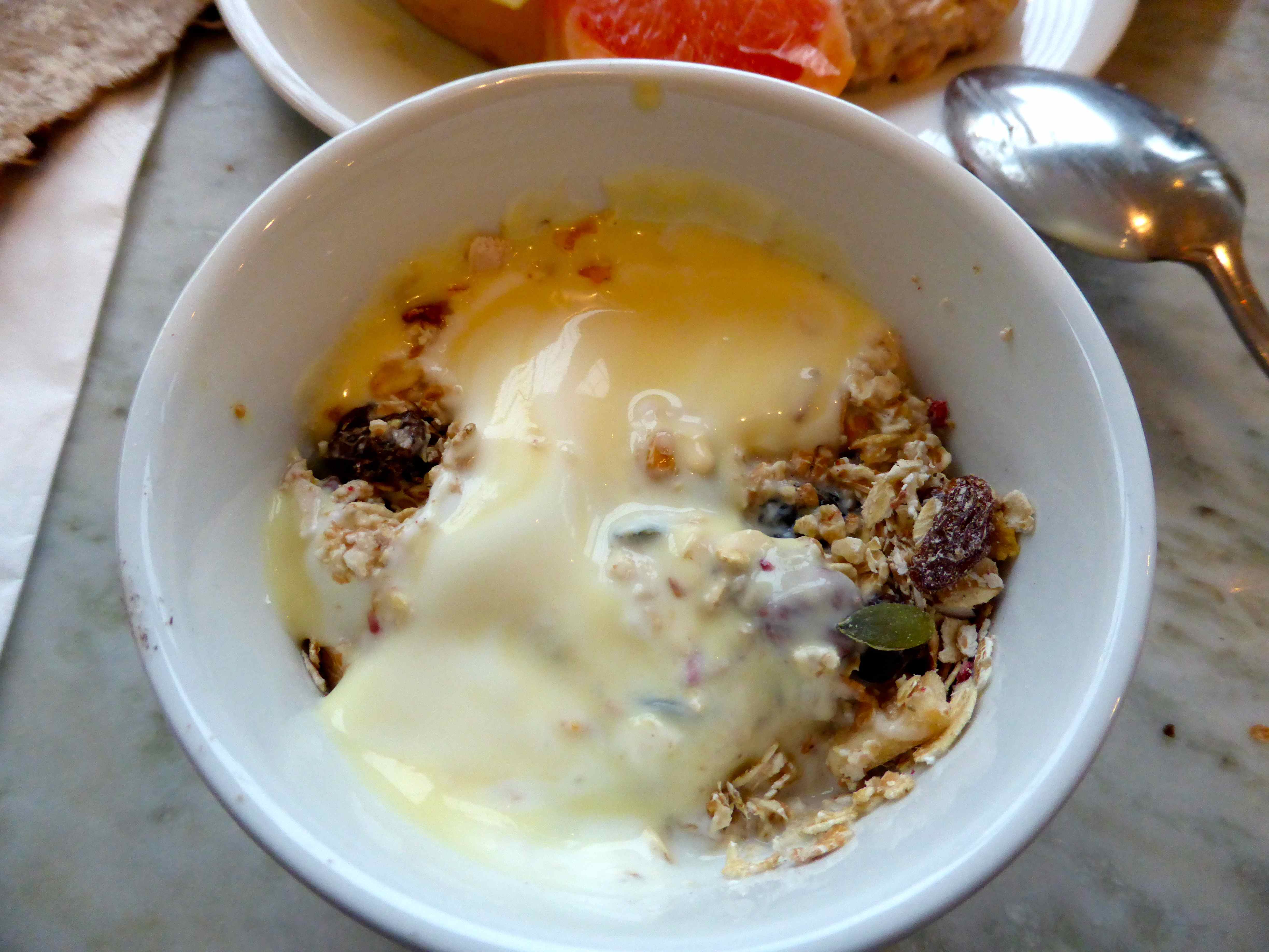 Muesli with 2 types of yogurt: mango and natural. There wasn’t any fruit salad today which was a shame.