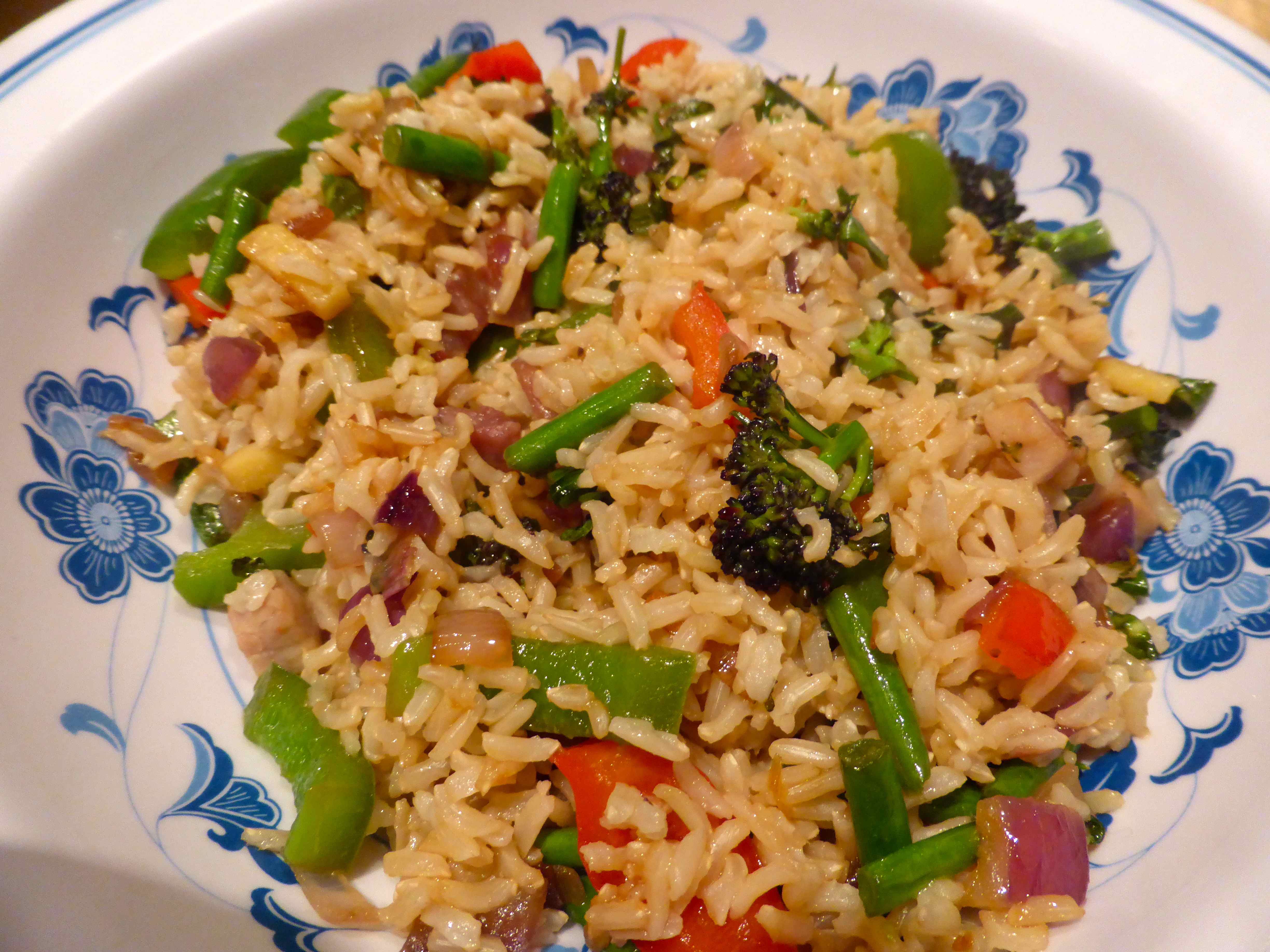 Supper was a veggie stir fry. Brown basmati rice stir fried with red and yellow onions, red and green peppers, green beans, purple sprouting broccoli and flavoured with ginger, garlic and soy.