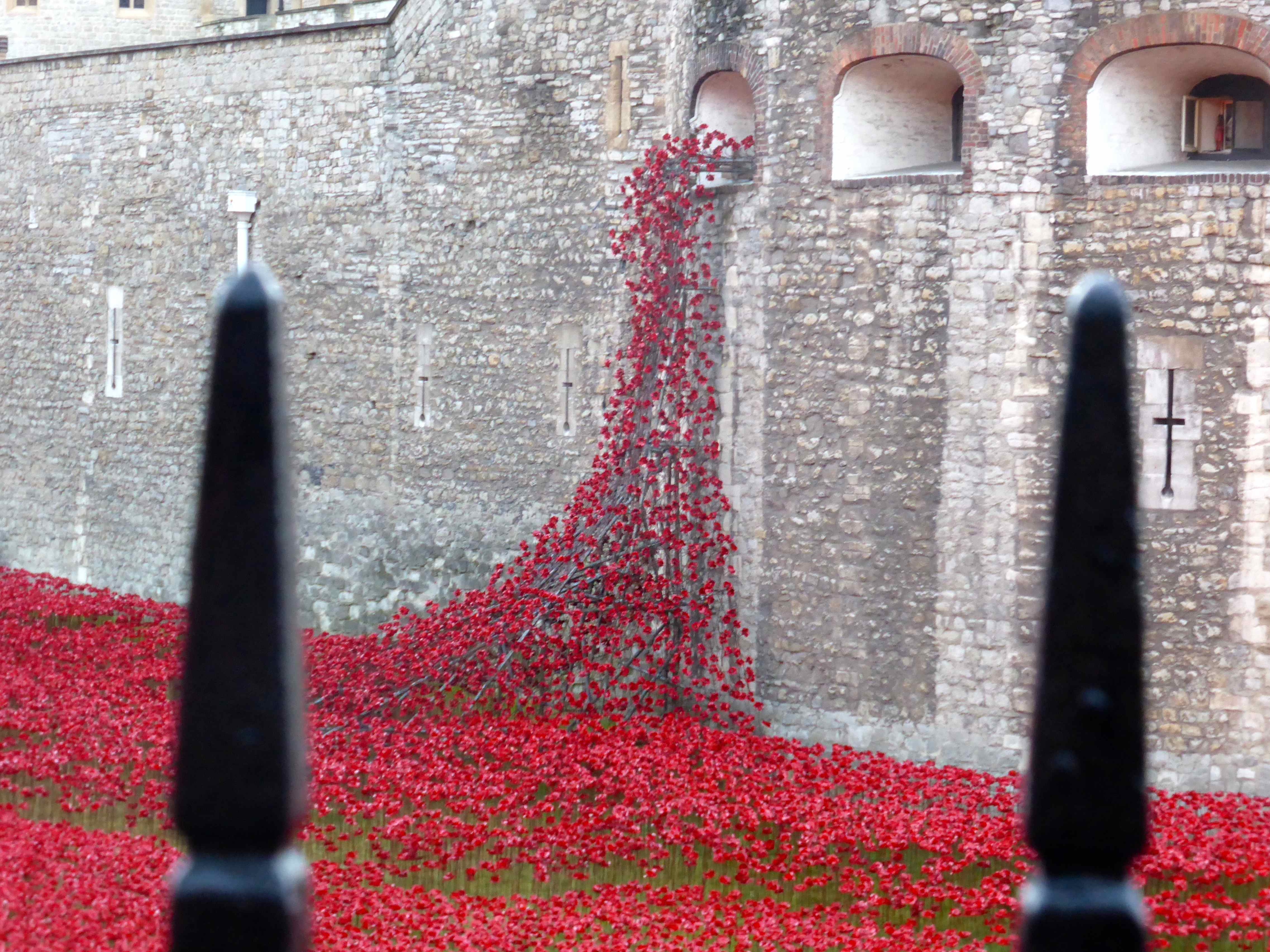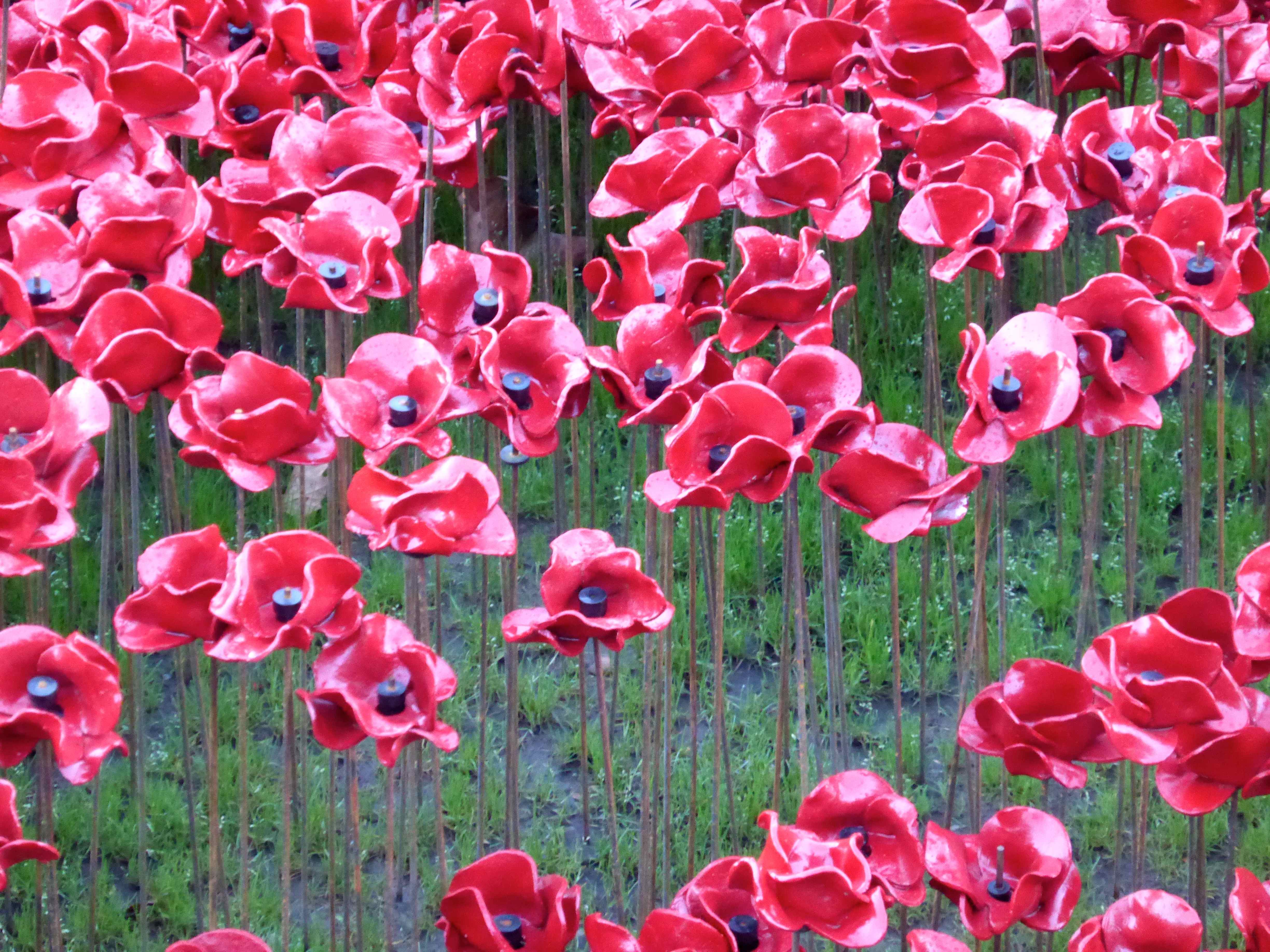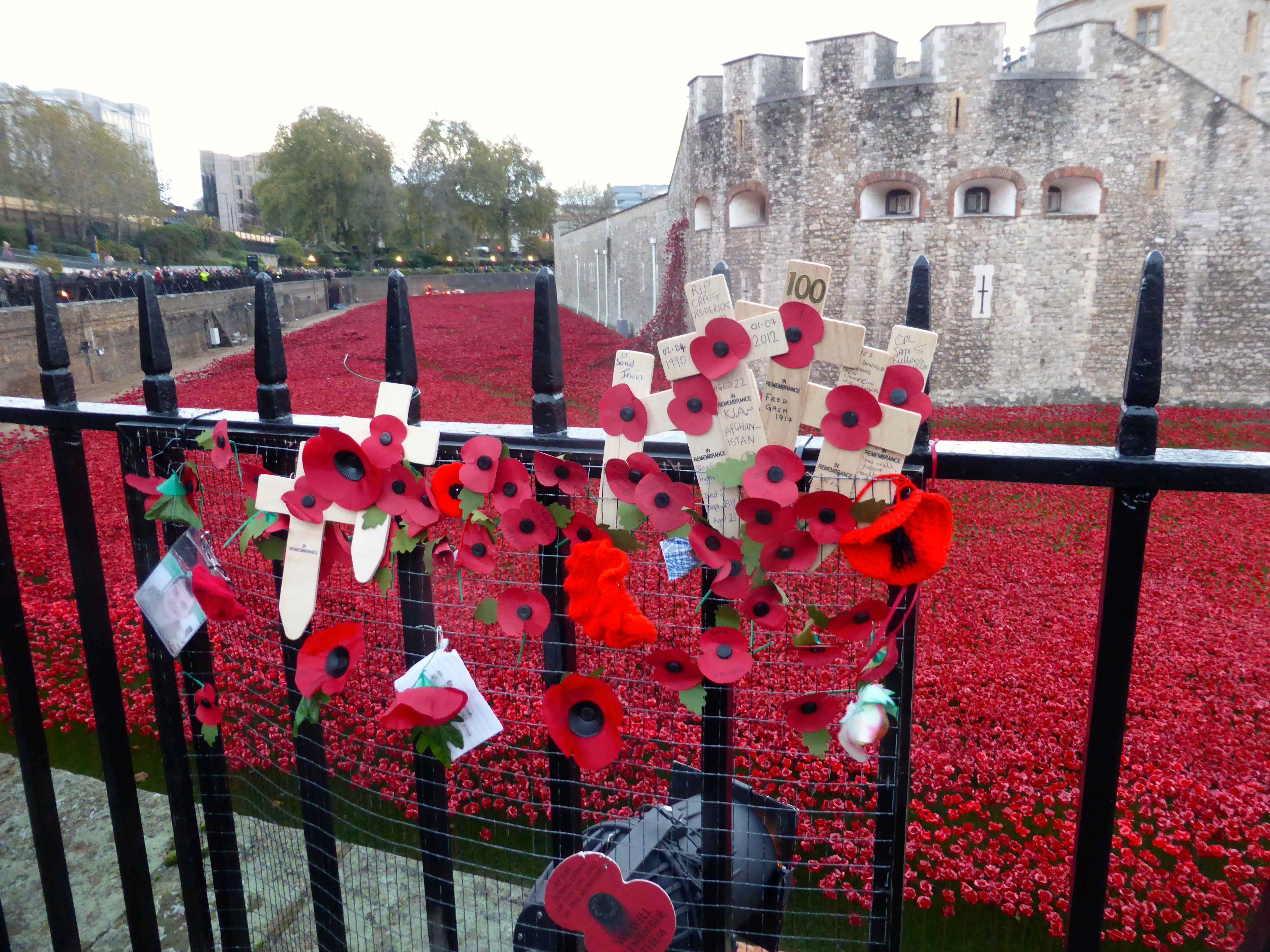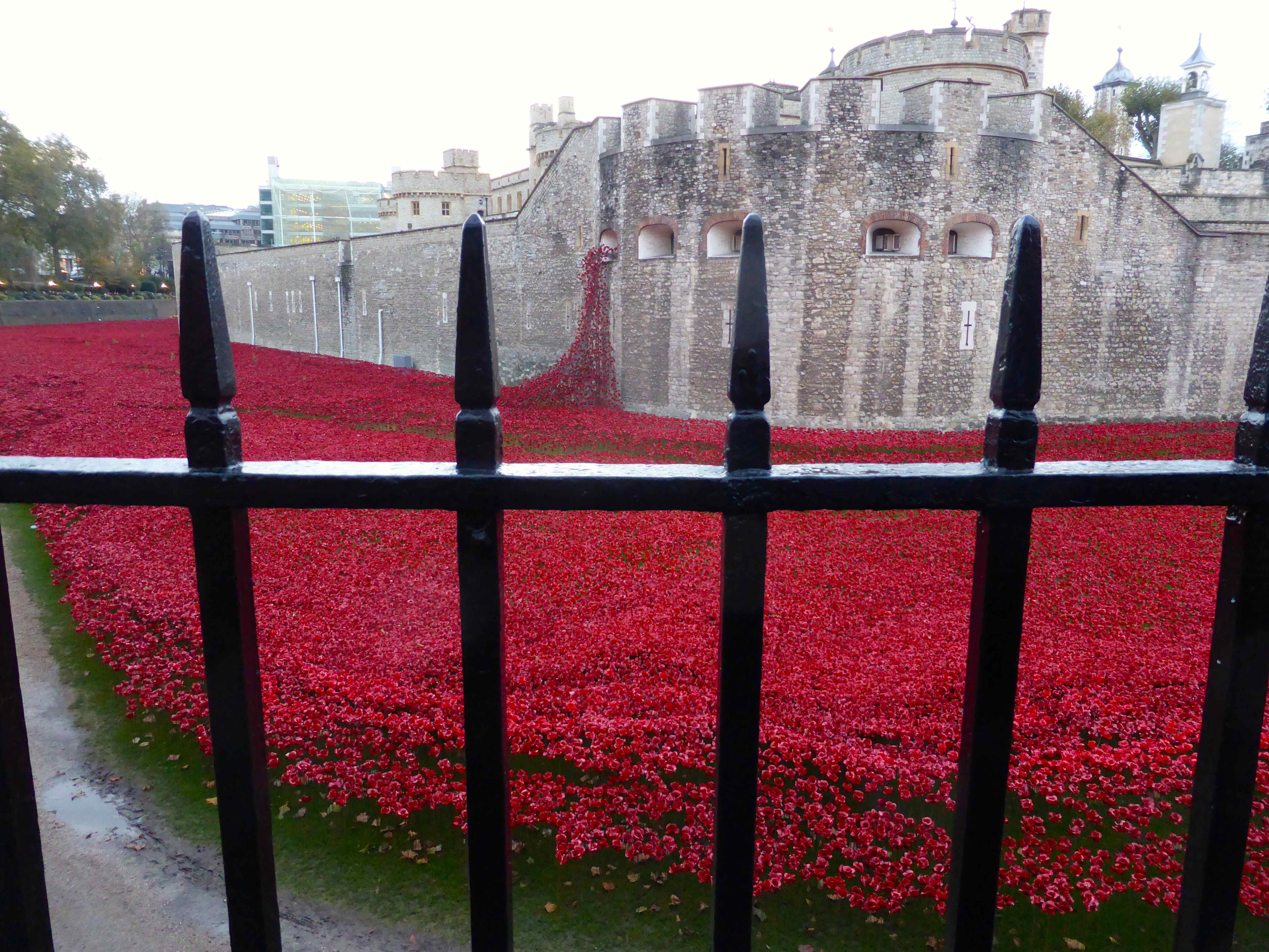 London Bridge early Destination was the Tower of London which is just out of view of this picture, on the left hand side before Tower Bridge.tower I arrived at the tower just before 7am and it was peaceful and quiet.tower of london 2 First view of the poppies!  Wow!popies 12 For blog readers who may not be in the UK or have heard about the poppies at the Tower of London, this is an art installation called ‘Blood Swept Lands and Seas of Red’.  The poppies have been “planted” over the last 2 – 3 months and the last will be placed tomorrow on 11/11/14 to coincide with the beginning of the First World War, 100 years ago.  Each poppy represents a British soldier who died during that war.  888,246 British lives lost.Blod swept lands The ceramic poppies have all been sold and millions of pounds raised for various armed forces charities.poppies 12 En masse they were incredibly effective.poppies 11 poppies 10The very recently added memorials to individuals made me feel very emotional.   It helped make it real and served as a reminder of all those people who died then and who have died since.