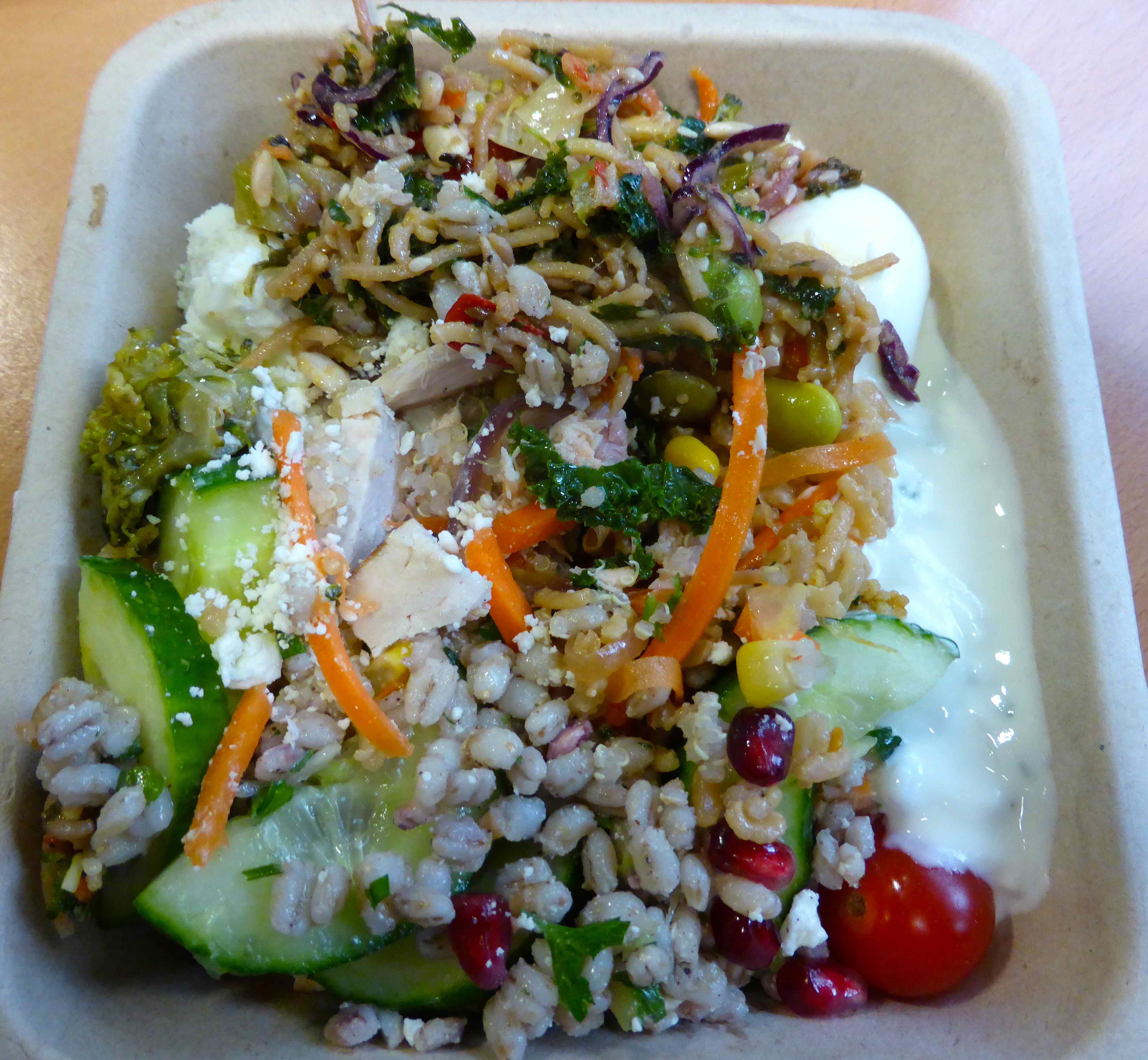 A small pot of mixed fruits with a latte for breakfast.fruit salad 9-11 14 A mixed salad from Wholefoods for lunch which was really tasty.Wholefoods salad 9-11-141 slice of bread and butter