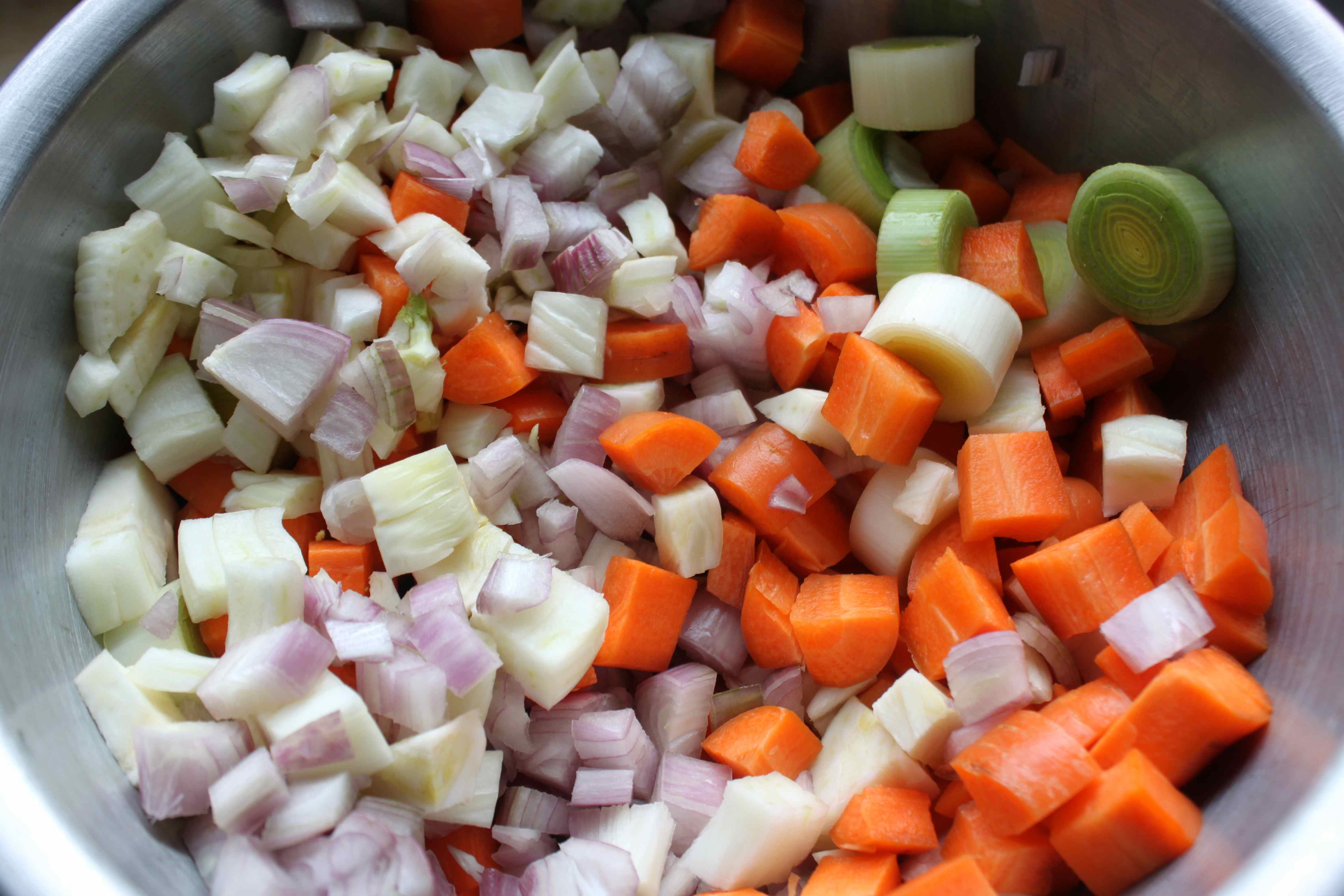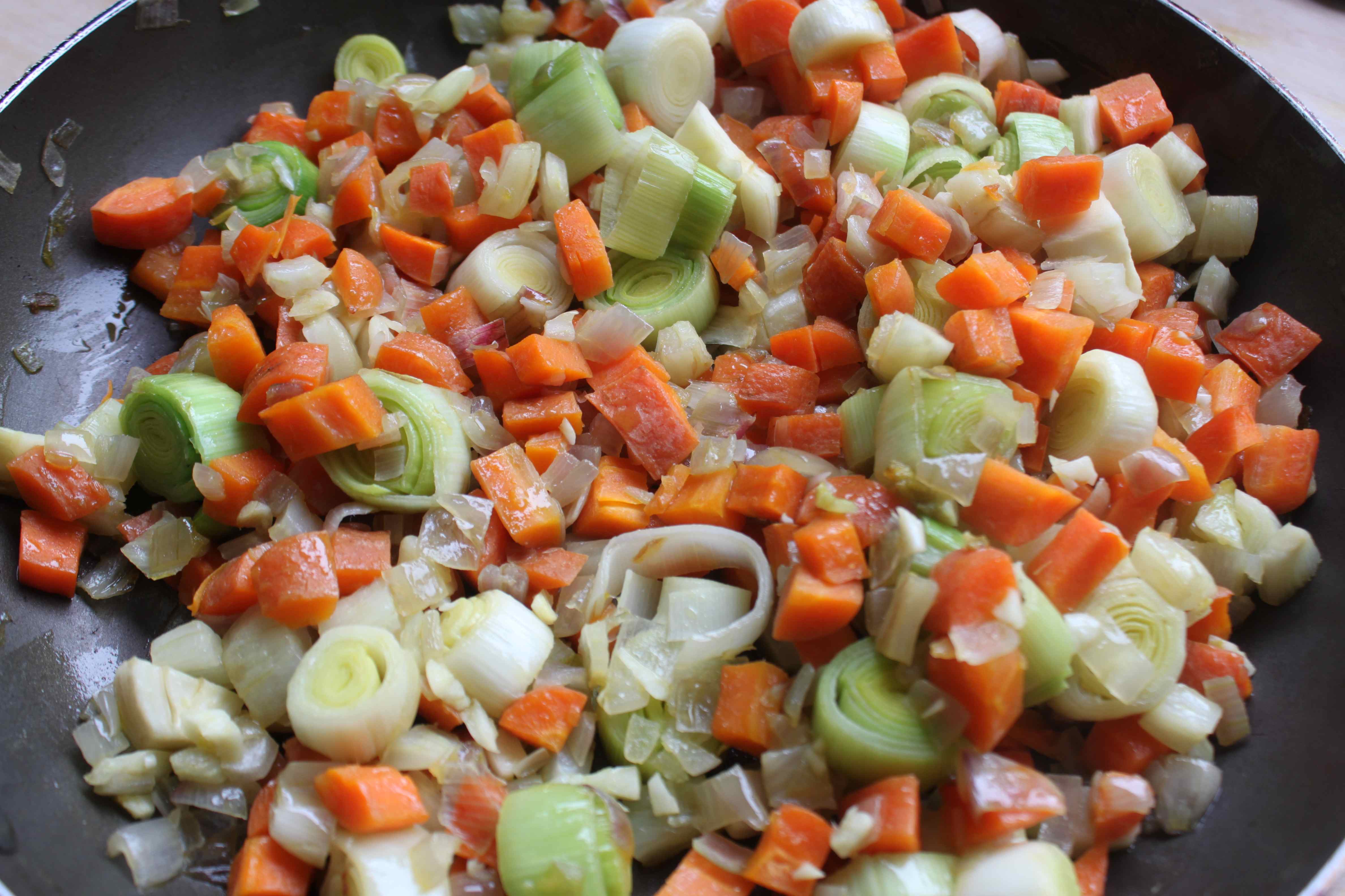 Add the carrots, celery and leek and saute for 5 minutes, stirring regularly.