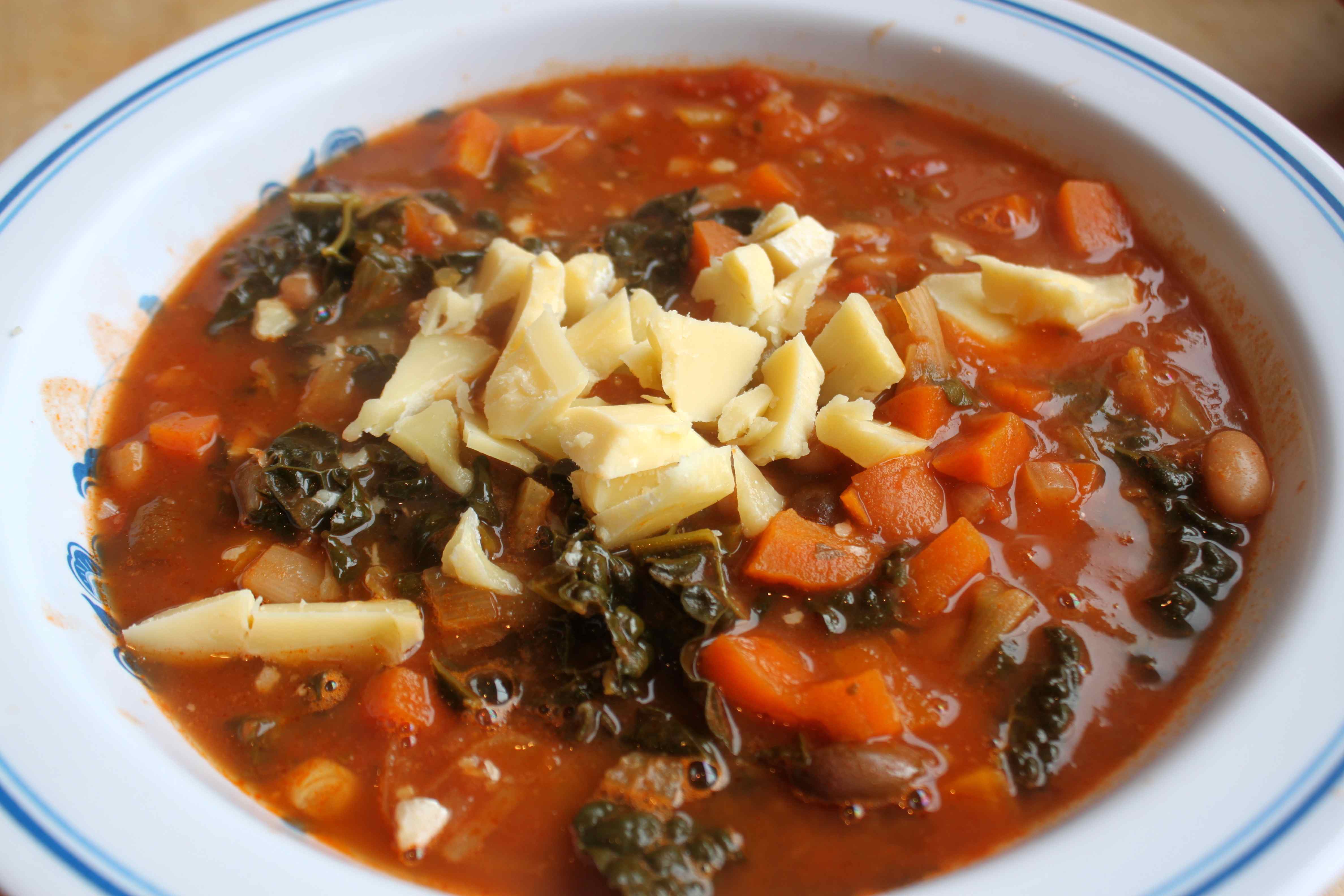 Veg Everyday! recommends serving this with bread, toasted and rubbed with garlic and brushed with olive oil. However, I had mine served with some sharp Cheddar which went perfectly.
