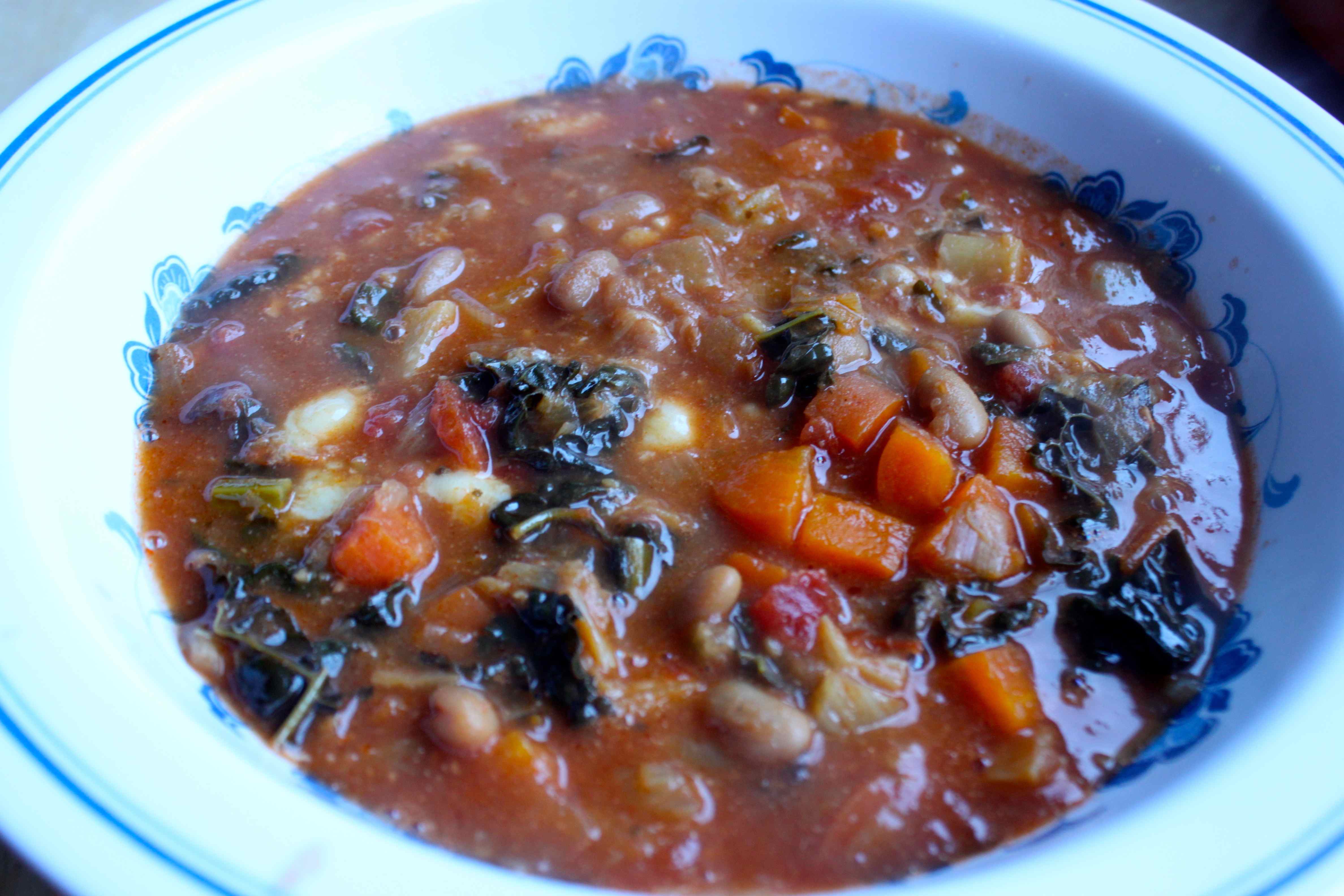 Add the tomatoes, pureed and whole beans, stock, rosemary, thyme and simmer gently for about an hour.