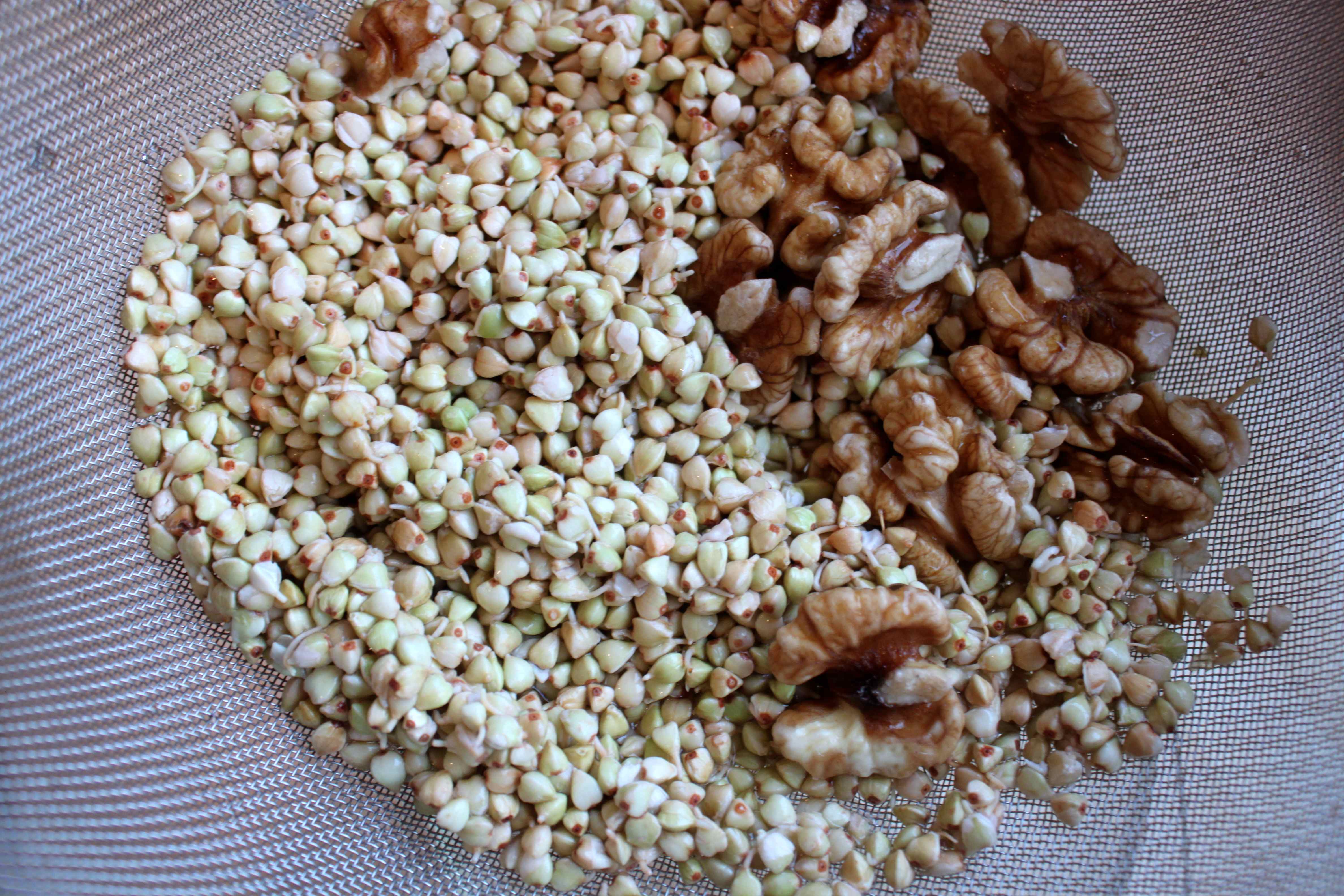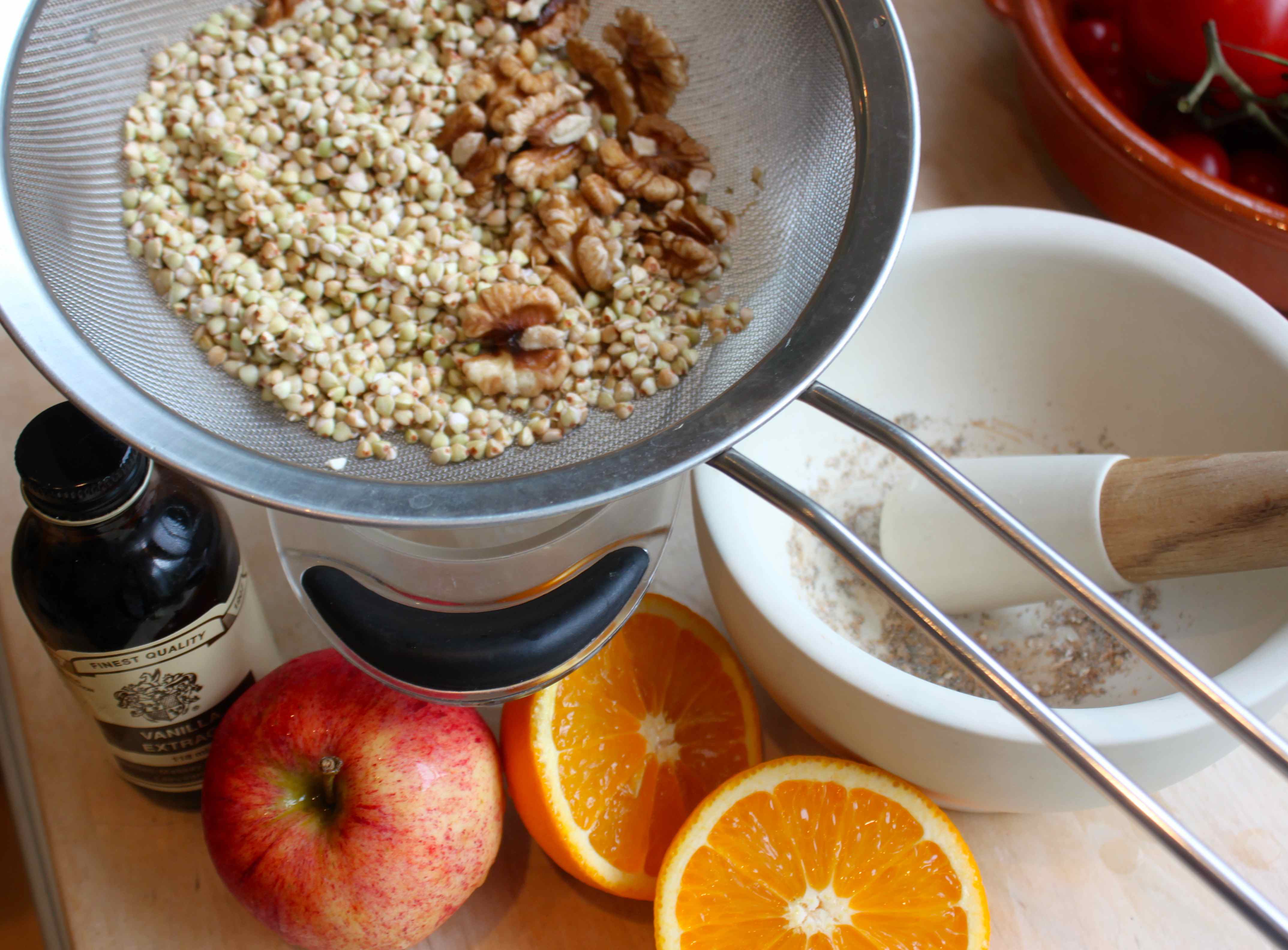 Add buckwheat, walnuts, chopped apple and orange juice to the blender and blitz until smooth. Place in serving bowl.