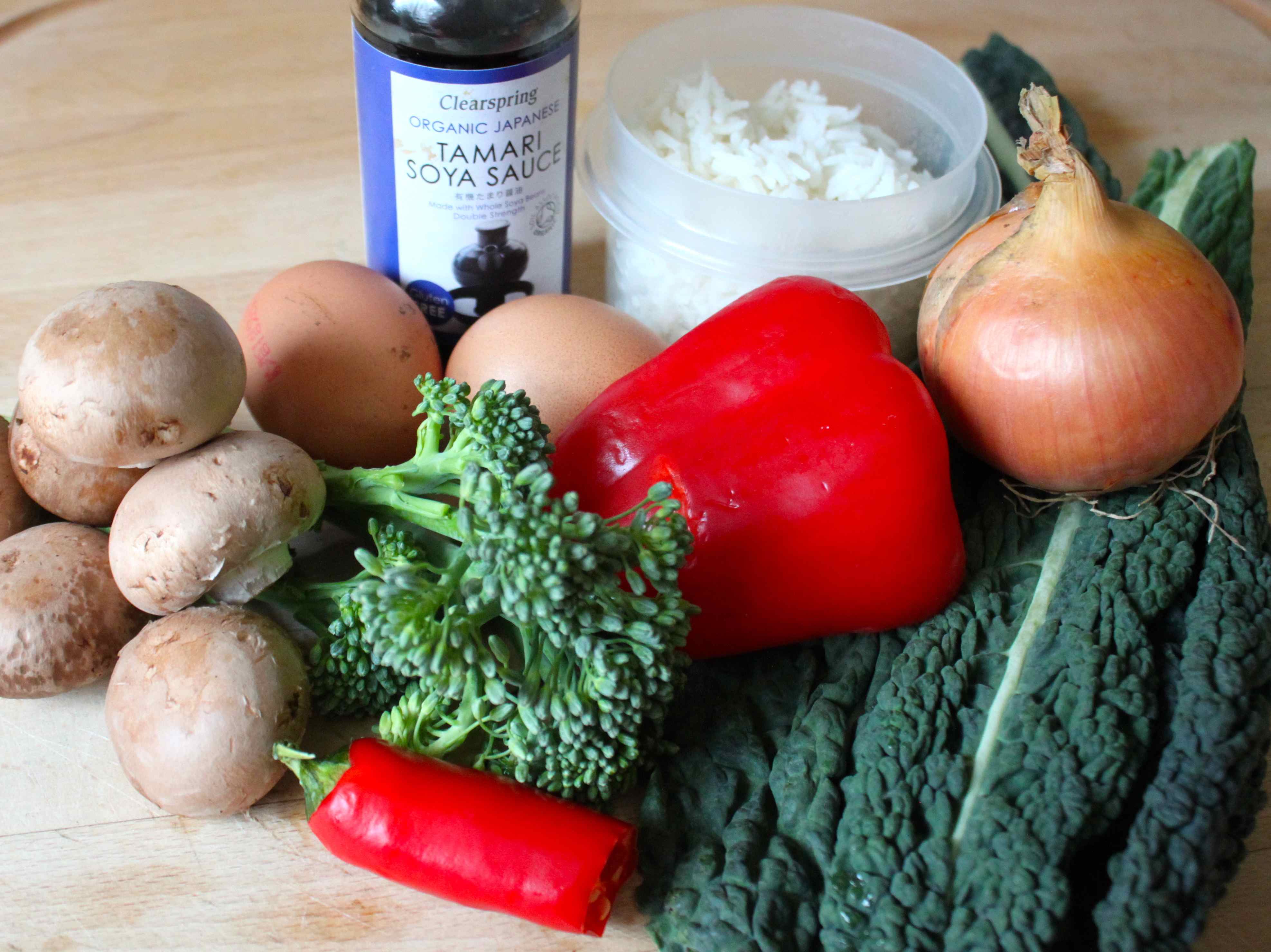 I fried the onion, then aded the broccoli, red pepper, cavolo nero and mushrooms. When they were nearly cooked I added the rice, the eggs which I had whisked with some soy sauce and some shredded roast pork.