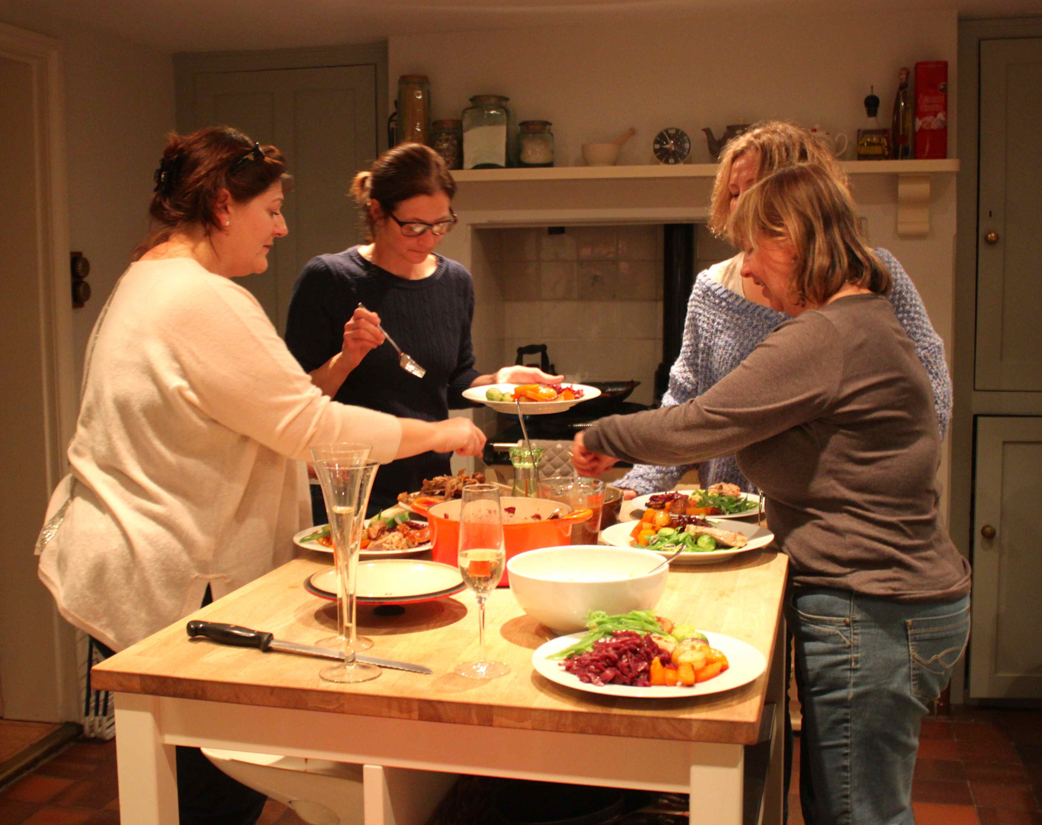 Whoever said ‘too many cooks…’ had never met us before! A bit of chit, chat and chop and we were ready. We fitted in a trip to the local pub and Gini’s canapes with champagne before finishing off the cooking.