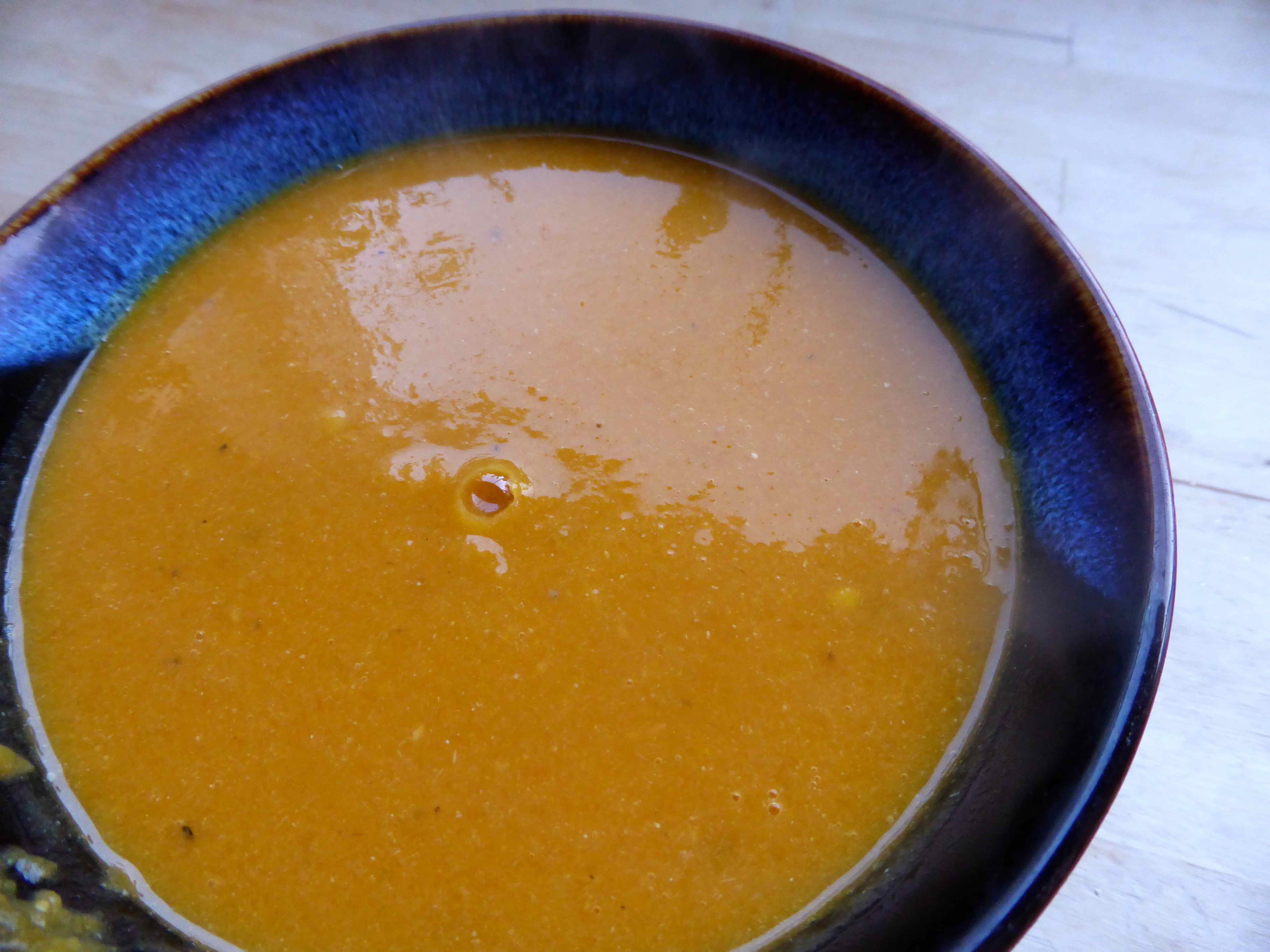 For lunch I made a vegetable soup. I made a chicken stock with the carcass from yesterday’s chicken and used that as the base. I roasted 2 butternut squashes and 4 sweet potatoes with some sesame oil, fennel seeds, salt and pepper for 45 minutes at 180 °C.