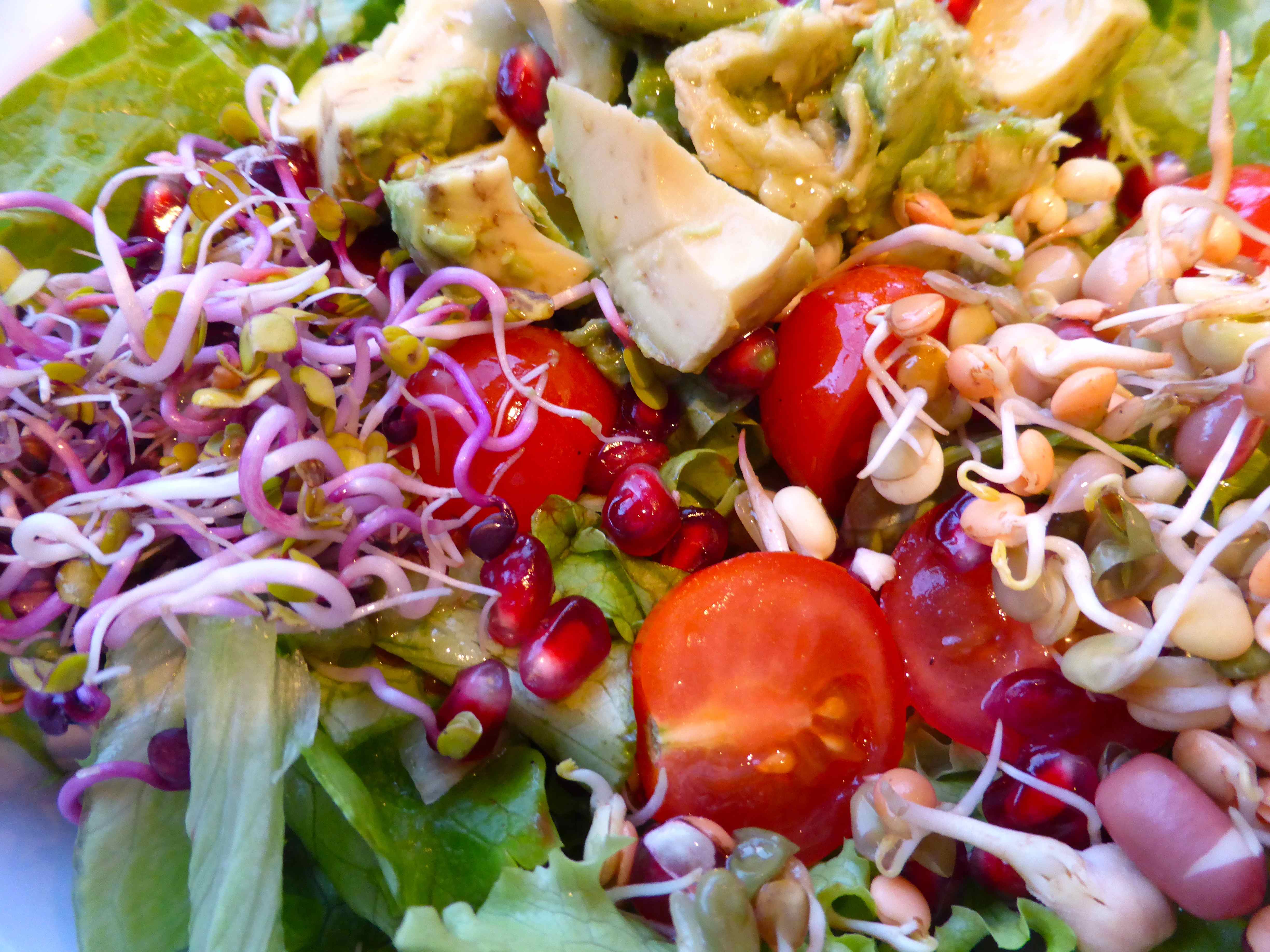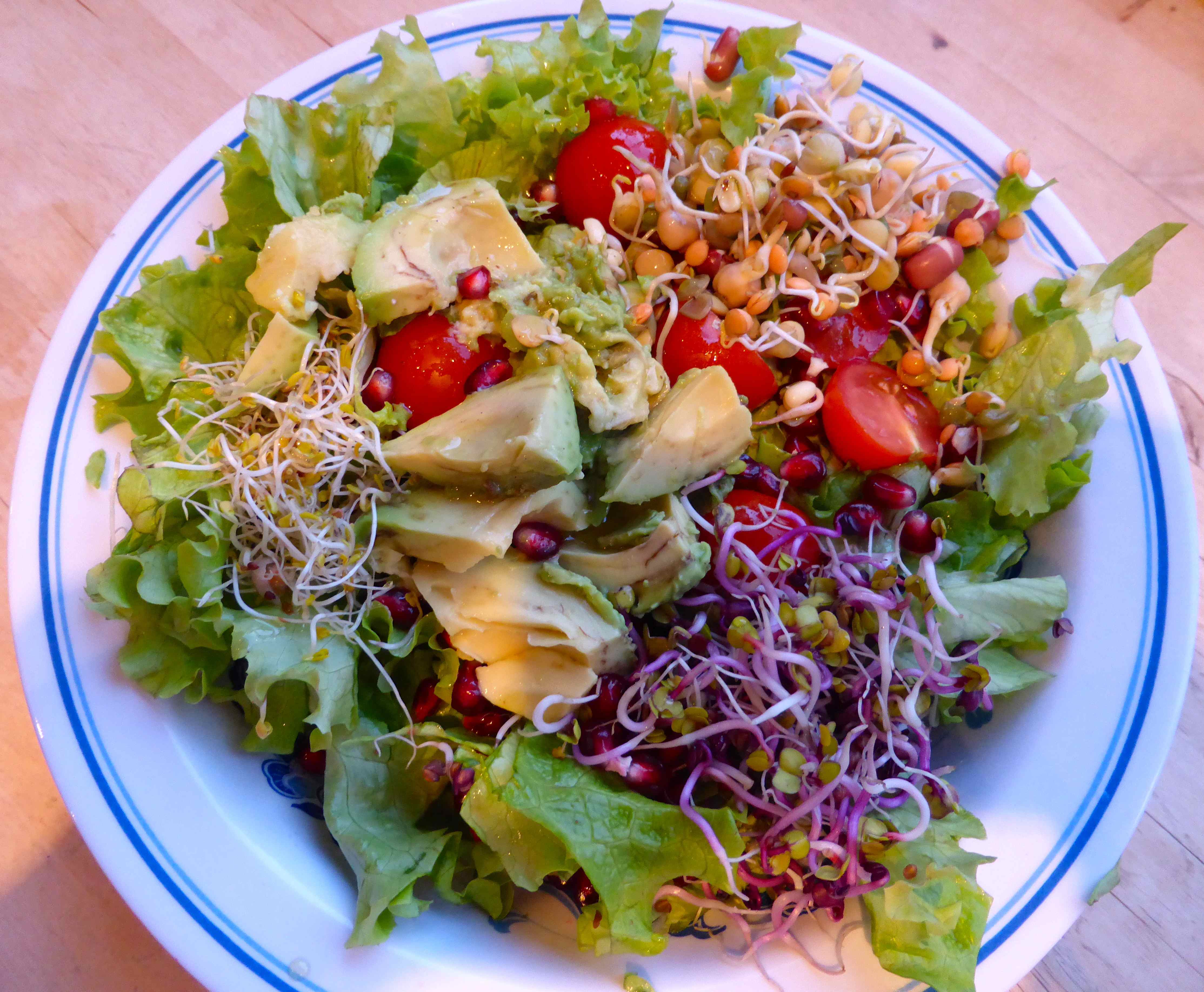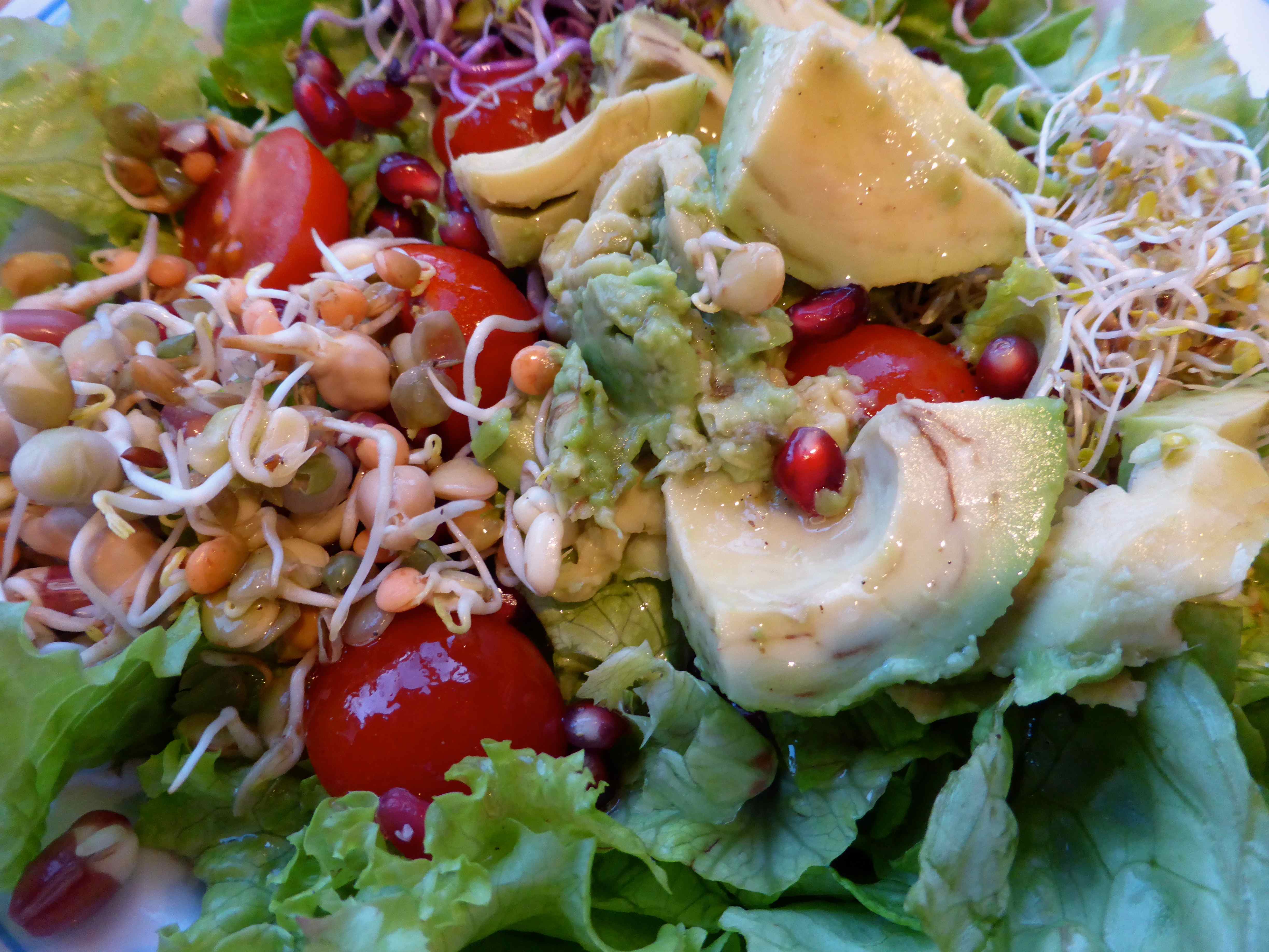 I had an apple while I prepared a salad at home for lunch.apple 16-1-15 I bought this lovely lettuce and tub of mixed sprouts in Wholefoods Market earlier this week and used these as the main ingredients in the salad.lettuce and sprouts I made it in to a salad with cherry tomatoes, pomegranate and an avocado.salad 15-1-15 3 I added a simple dressing made with 1 tbsp olive oil, the juice of a small lime and salt and pepper.salad 15-1-15 2 It was tasty and ultra nutritious; just what I needed.salad 15-1-15 1 Supper was a jacket potato with the last of this weeks vegan chilli.  Julie asked me for the recipe as I haven’t posted it on the blog.  I do add different vegetables each time I make it as I tend to use what I have in the fridge.  The recipe I follow comes from this book which I have had for many years.  I will give the recipe as it is in the cook book, which is a great one to have to hand because it is so simple.Classic Vegetarian Cookbook