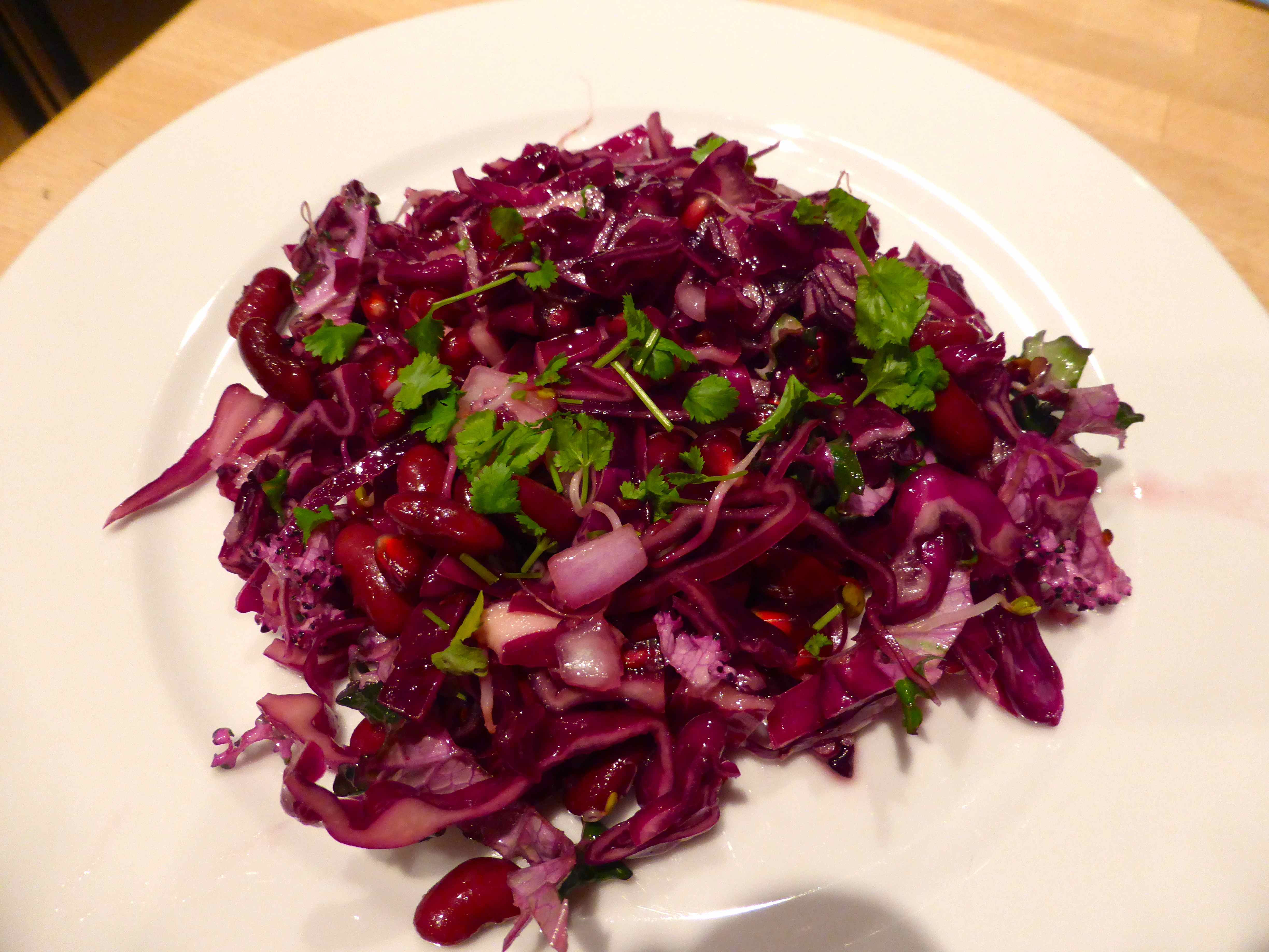 I made up the dressing following Nigella’s recipe but I added my own ingredients. I added a red cabbage, a pink kale (Lancashire kale), pomegranates, red onion, red kidney beans and radish sprouts. You definitely need the red cabbage and red onion but apart from that, add whatever takes your fancy. Nigella also adds cold turkey and radishes.