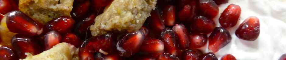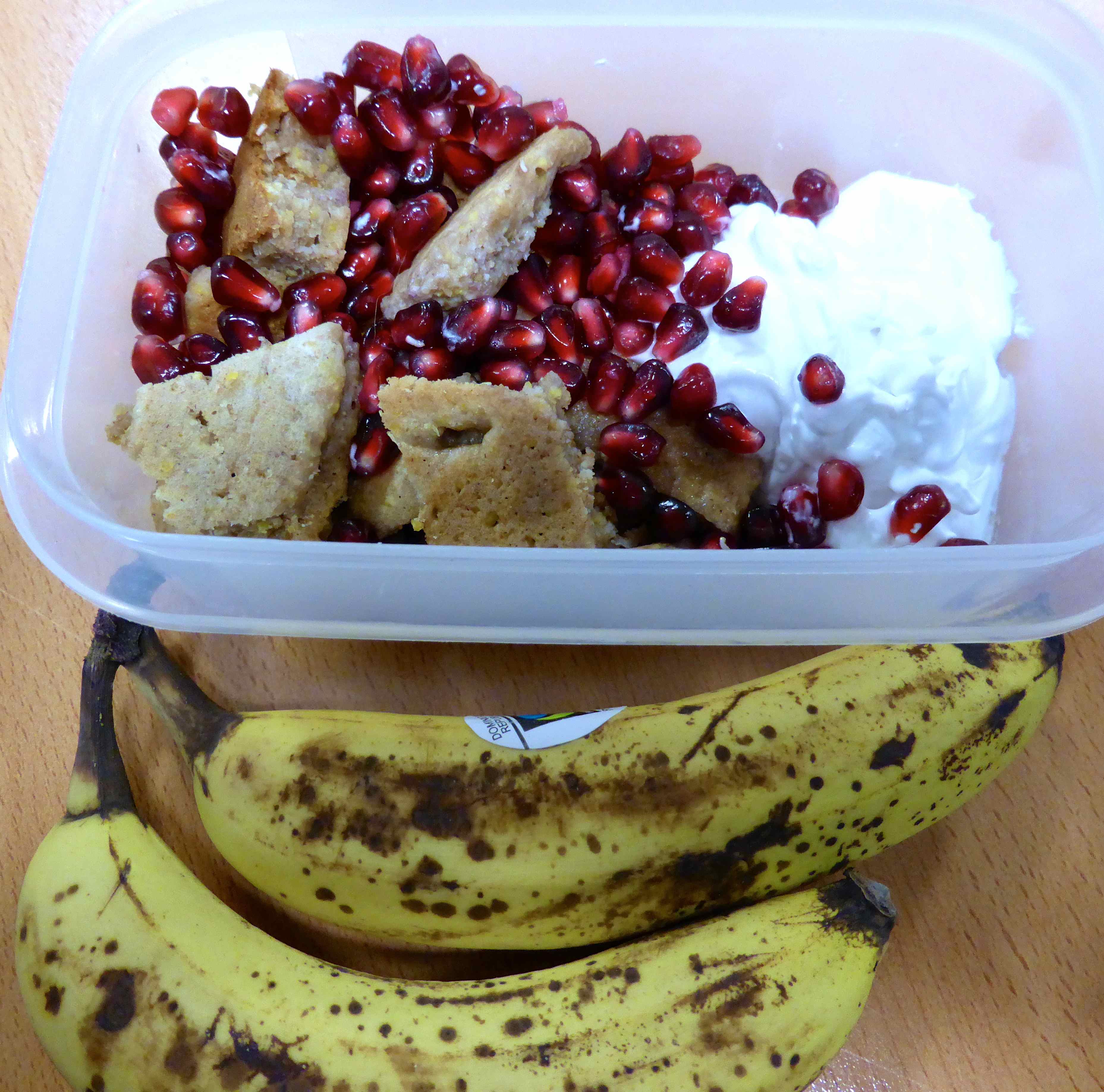 1. A leftover pancake with coconut yogurt, pomegranate and 2 small bananas